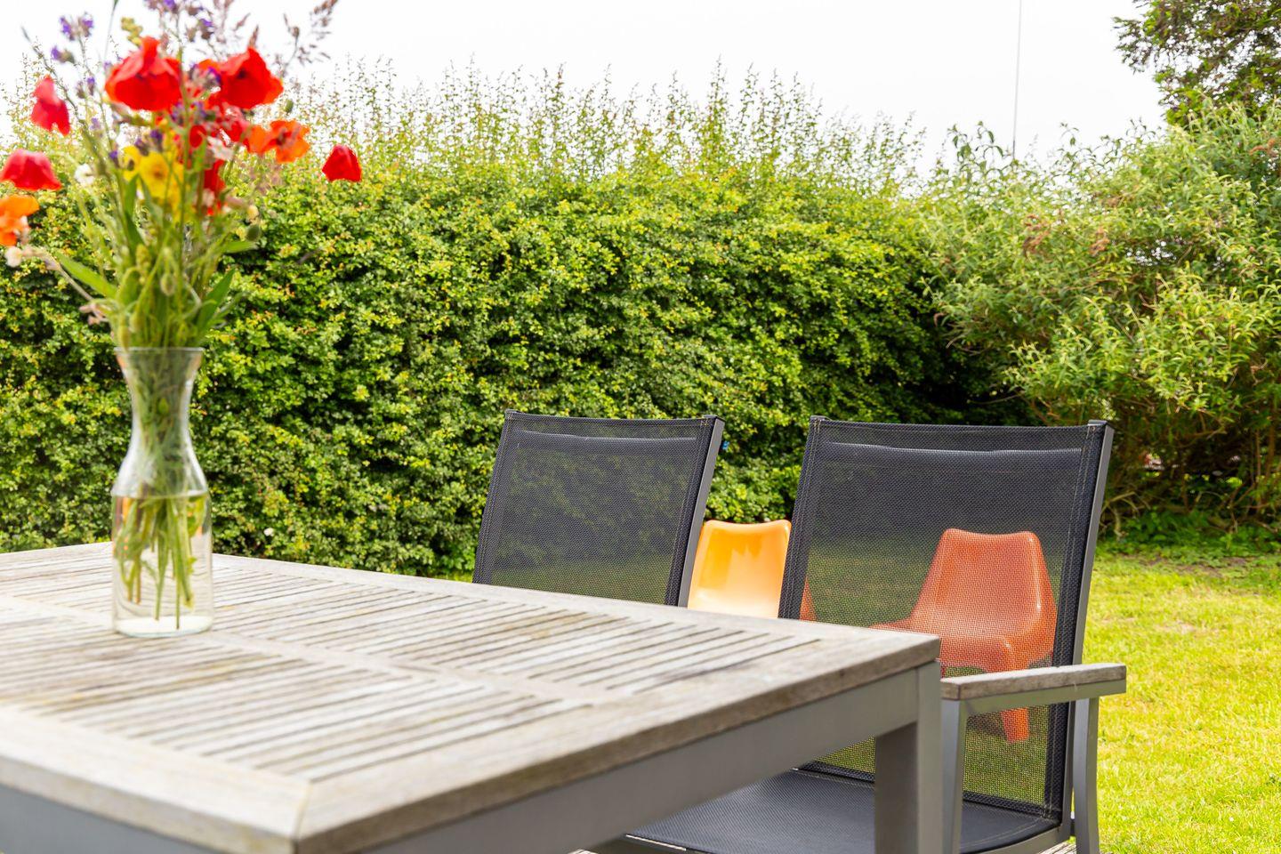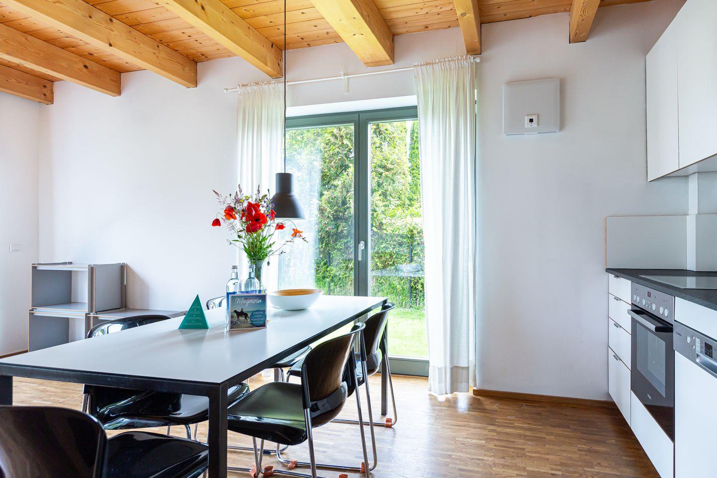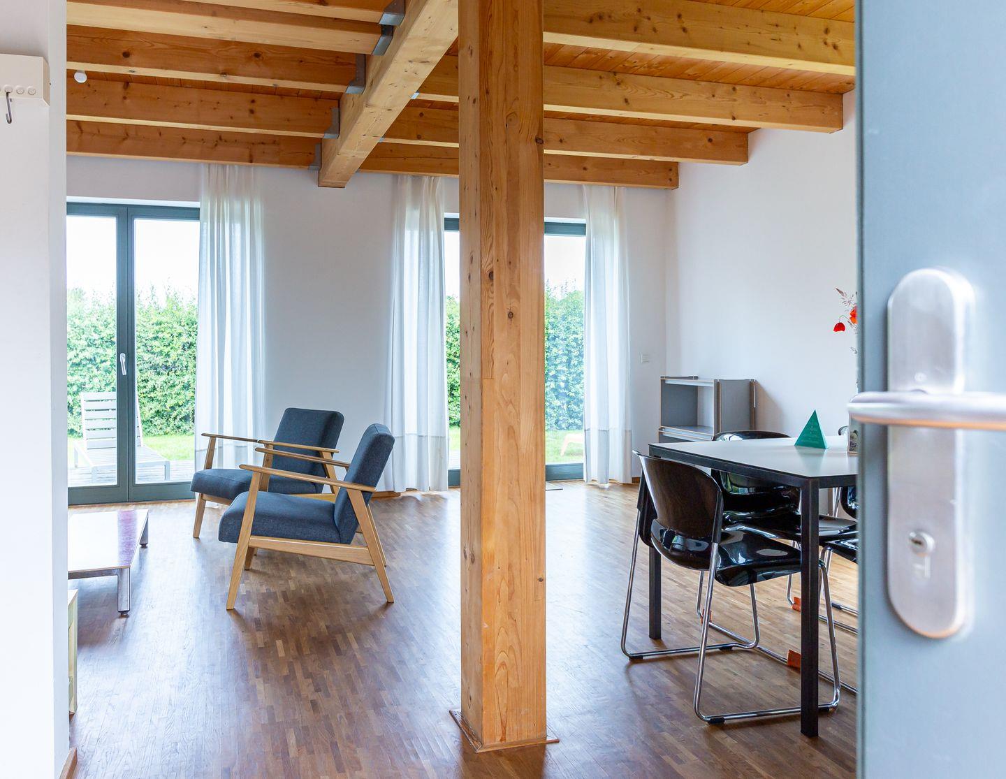 Im Außenbereich begeistert eine große Holzterrasse mit modernen Gartenmöbeln zum Relaxen. Hier kannst du grillen, die lauen Sommerabende genießen oder einfach mit Blick ins Grüne die Seele baumeln lassen. Der große Garten mit Liegewiese kann gemeinschaftlich genutzt werden. Außerdem steht dir ein PKW-Stellplatz zur Verfügung.