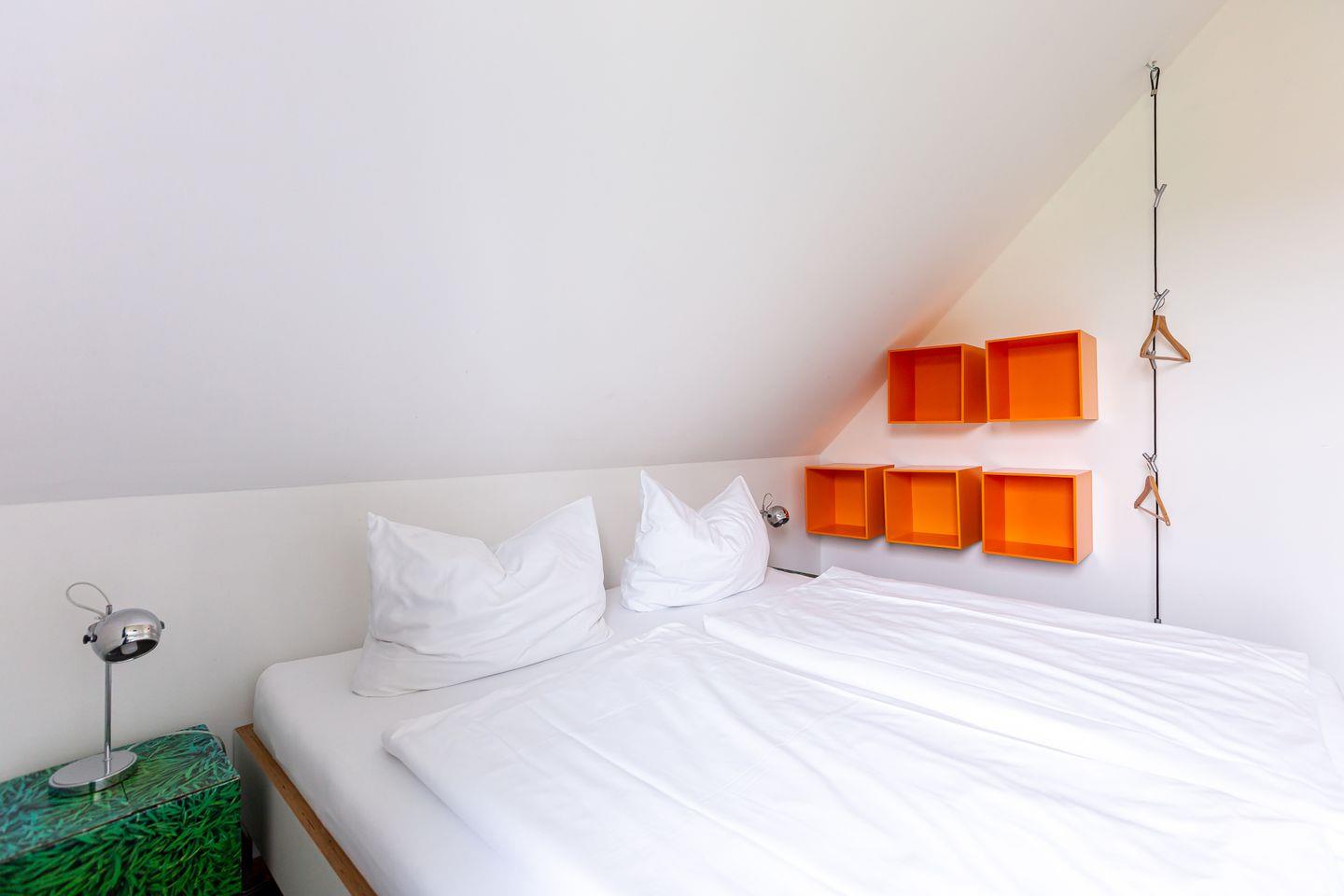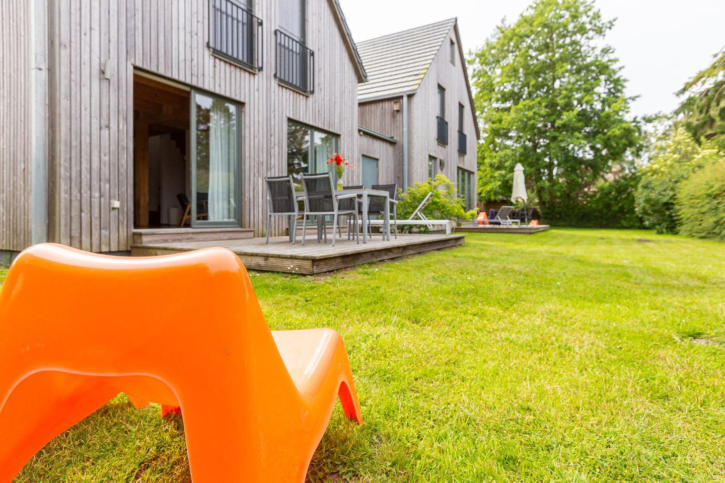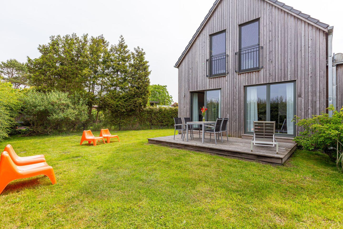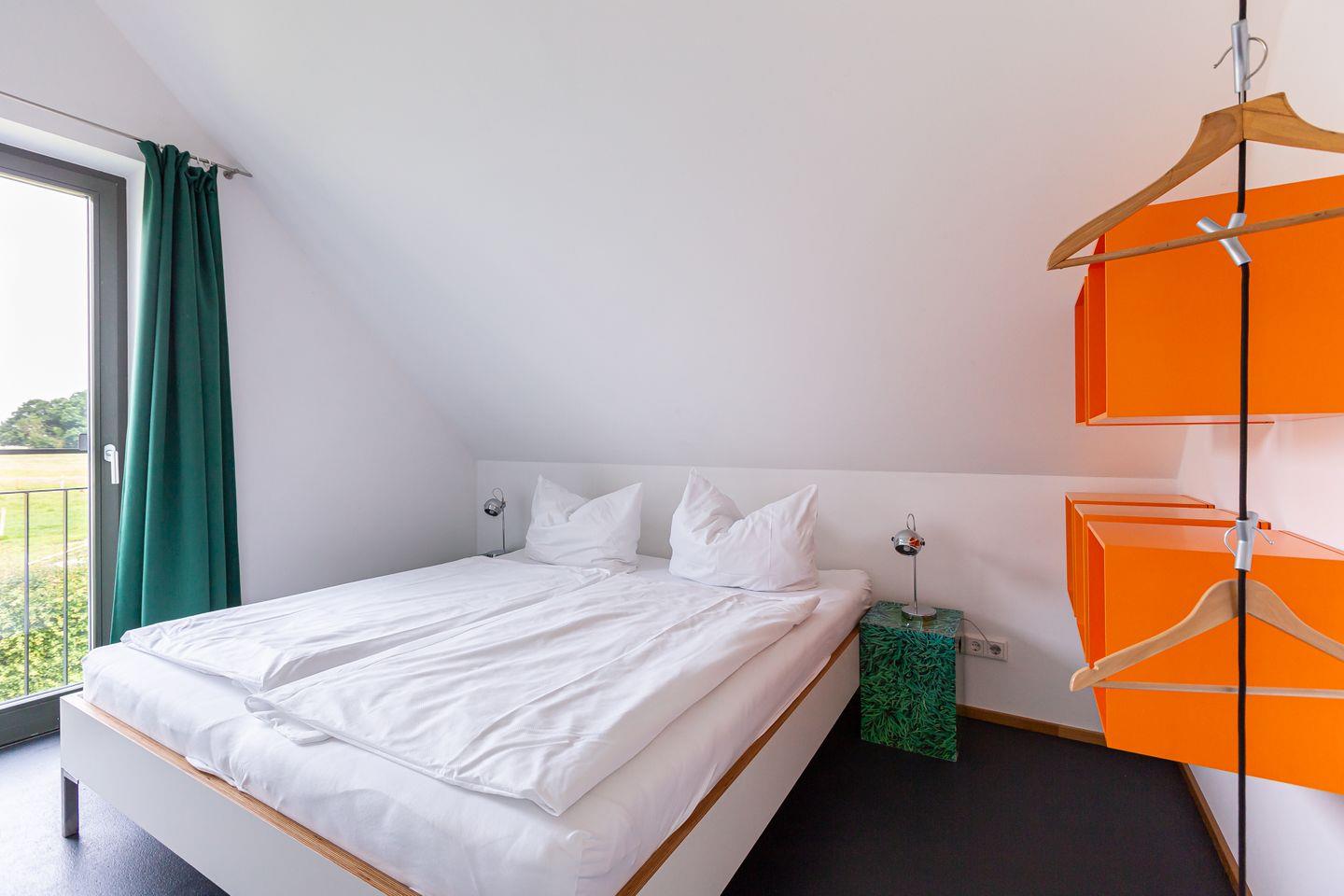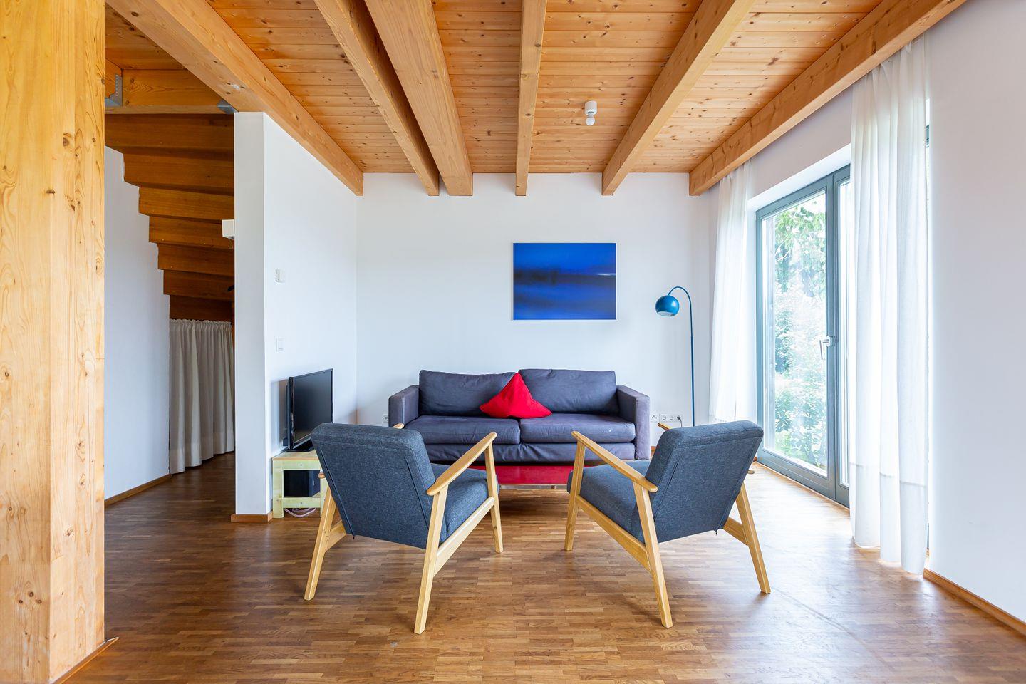 Eine moderne Architektur und ökologische Holzbauweise sind charakteristisch für dieses Landhaus nahe der Ostsee. Im Erdgeschoss erwartet dich ein großzügiger und lichtdurchfluteter Wohnraum mit klarem Design und retroinspirierten Möbeln. Mit der Holzbalkenkonstruktion in der Decke und dem Echtholzparkett wird das Naturmaterial Holz auch im Innenbereich wieder aufgegriffen und sorgt für eine tolle Wohnatmosphäre. Die Küchenzeile und der große Esstisch fügen sich harmonisch in den Wohnbereich ein. Ein begehbare Garderobe befindet sich ebenfalls auf der unteren Etage. Im Obergeschoss erwarten dich zwei cleane Schlafzimmer, die jeweils mit einem Doppelbett (180 cm und 140 cm) ausgestattet sind - handgefertigt vom Tischler. Ein modernes Badezimmer mit Dusche/WC rundet das Urlaubsdomizil perfekt ab.