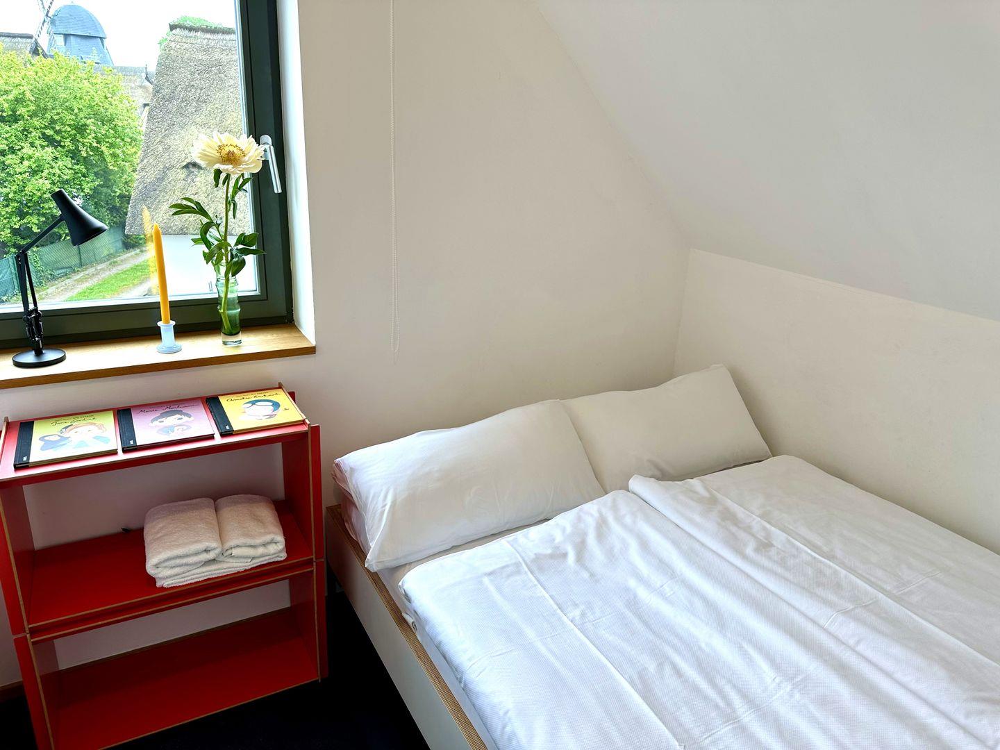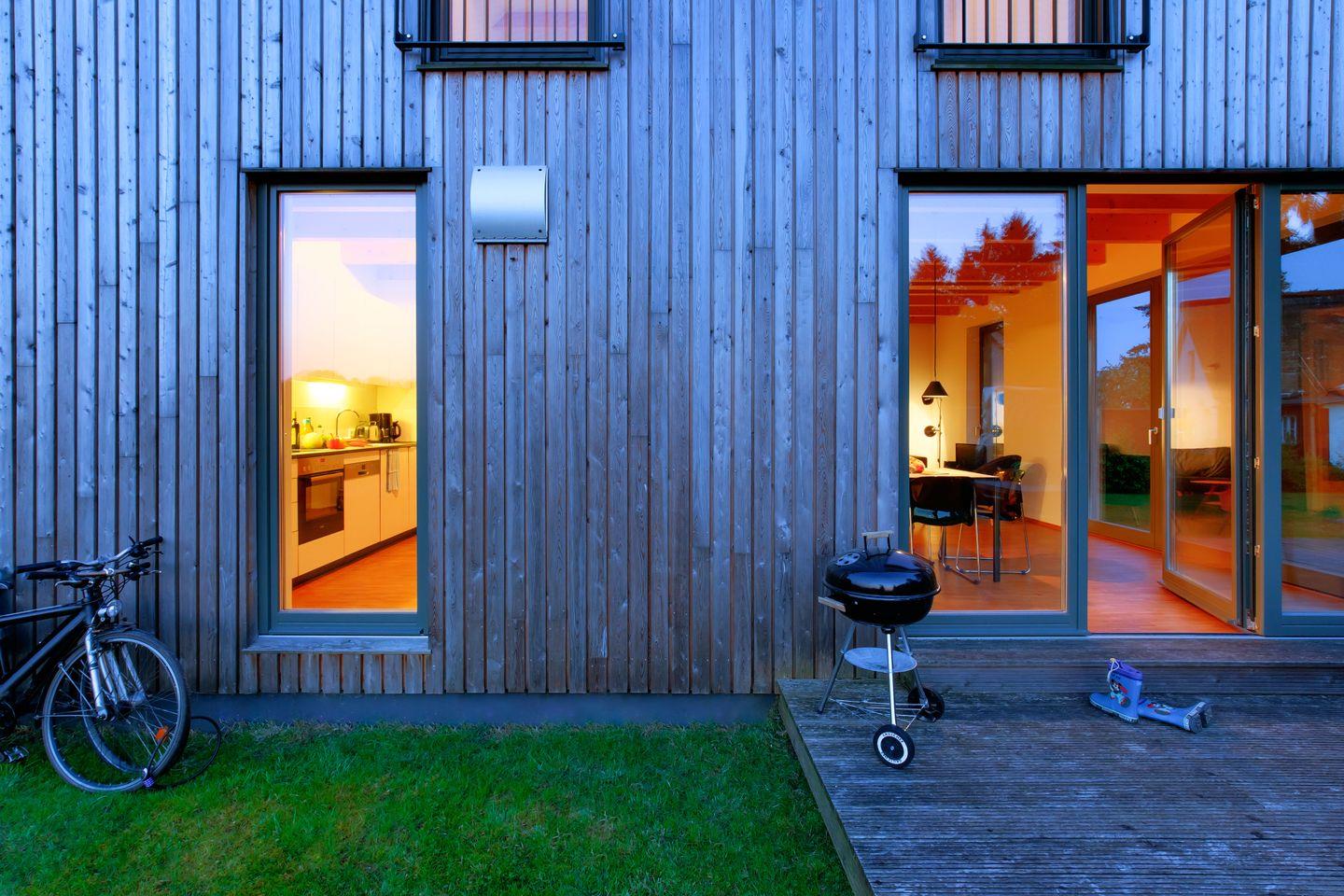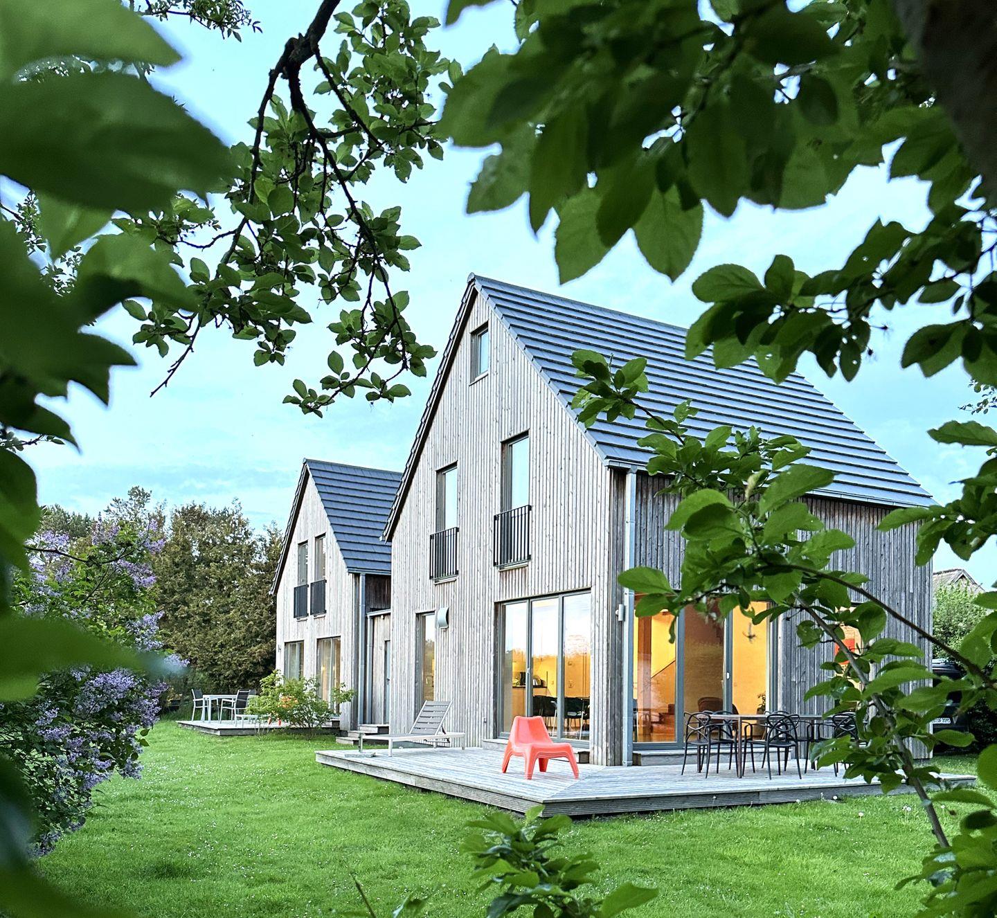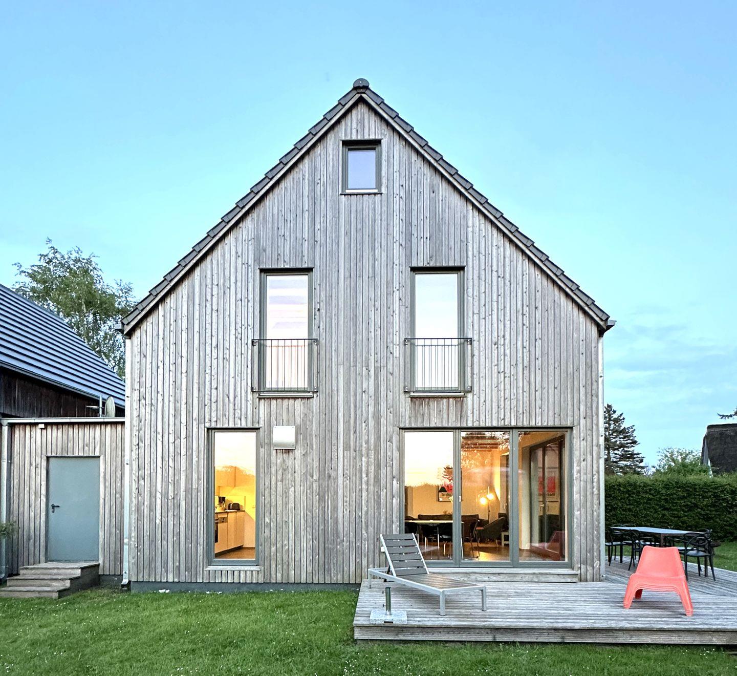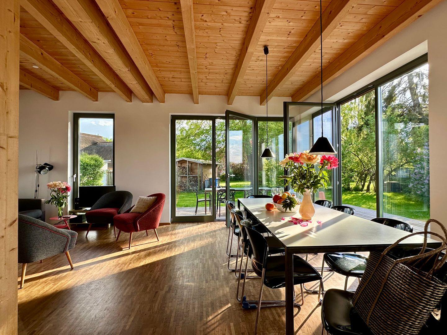 Eine moderne Architektur und ökologische Holzbauweise sind charakteristisch für dieses Landhaus nahe der Ostsee. Im Erdgeschoss erwartet dich ein großzügiger und lichtdurchfluteter Wohnraum mit klarem Design und retroinspirierten Möbeln. Mit der Holzbalkenkonstruktion in der Decke und dem Echtholzparkett wird das Naturmaterial Holz auch im Innenbereich wieder aufgegriffen und sorgt für eine tolle Wohnatmosphäre. Die Küchenzeile und der große Esstisch fügen sich harmonisch in den Wohnbereich ein. Ein Gäste-WC und eine begehbare Garderobe befinden sich ebenfalls auf der unteren Etage. Im Obergeschoss erwarten dich drei cleane Schlafzimmer, die jeweils mit einem Doppelbett ausgestattet sind - handgefertigt vom Tischler. Ein modernes Badezimmer mit Dusche/WC rundet das Urlaubsdomizil perfekt ab.
