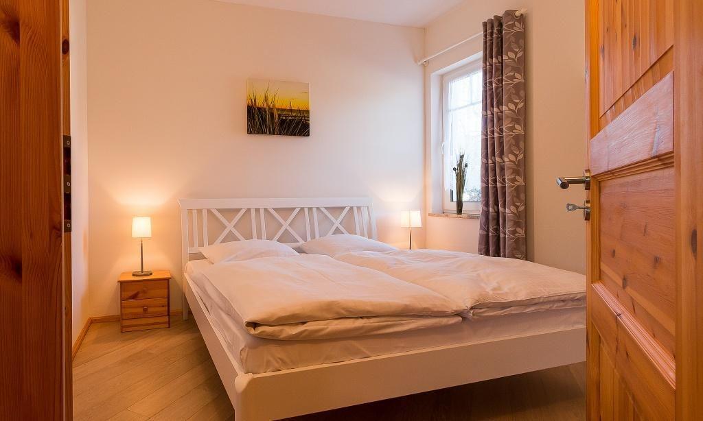 Du betrittst die gemütliche Erdgeschosswohnung über die Terrassentür und gelangst direkt in den offen gestalteten Wohn- und Küchenbereich. Hier kannst du entweder auf der Couch vor dem TV oder am sonnigen Esstisch klönen. Die kleine integrierte Küchenzeile ist mit allem ausgestattet, was du zum Kochen benötigst. Außerdem verfügt die Ferienwohnung über ein Schlafzimmer mit einem Doppelbett sowie ein Tageslichtbad mit Dusche/WC.