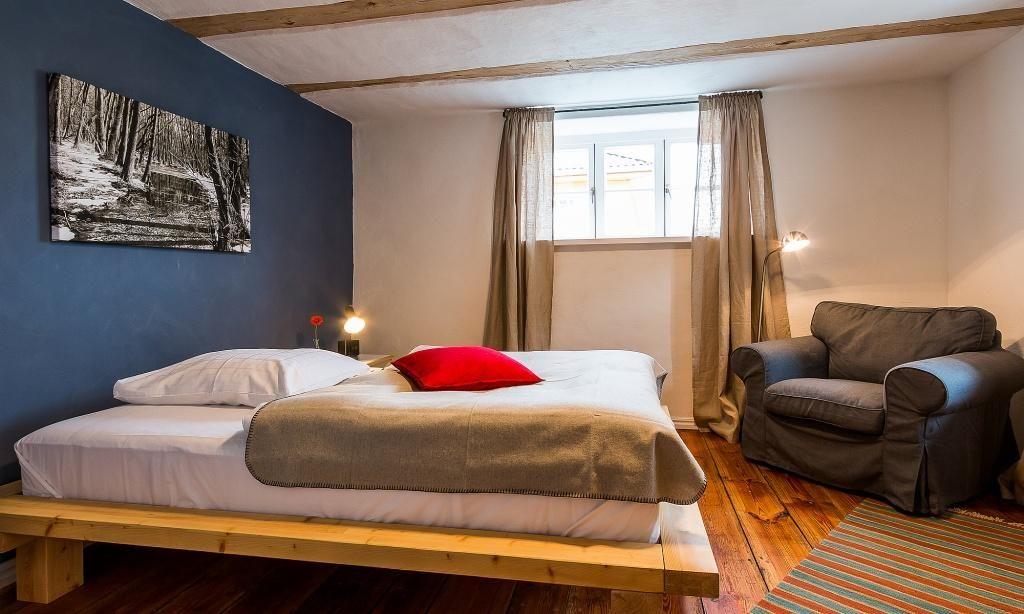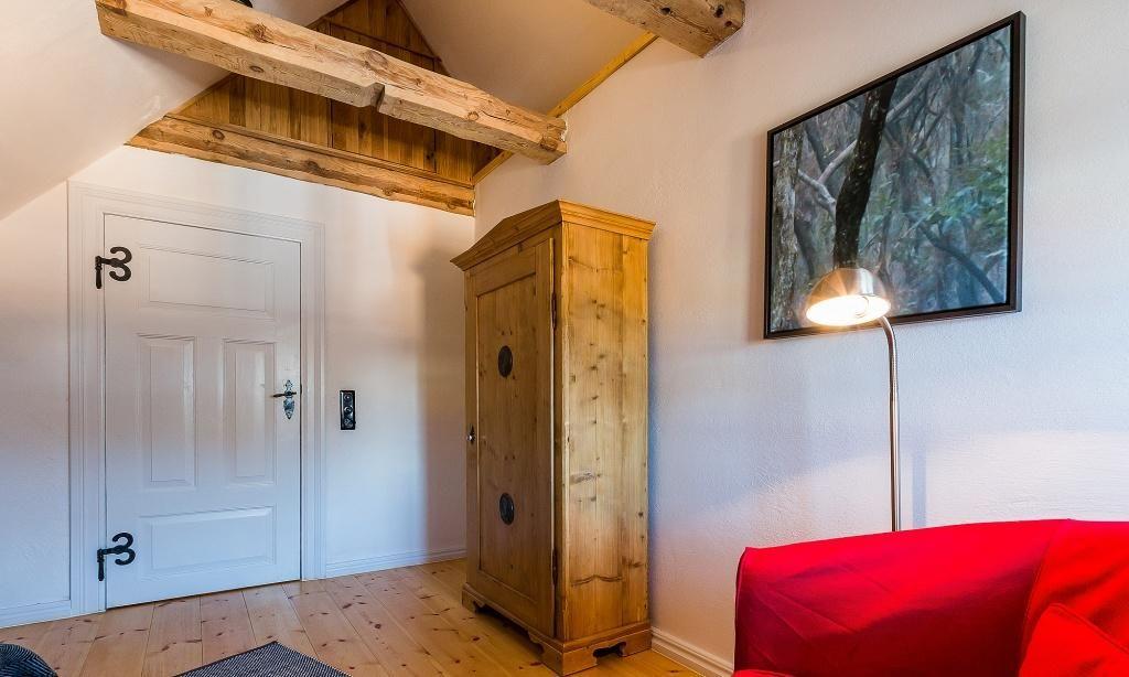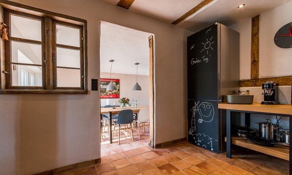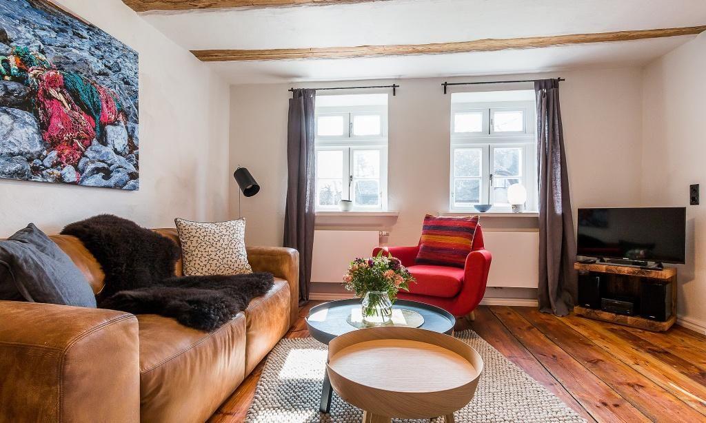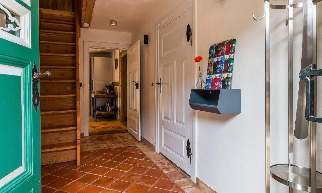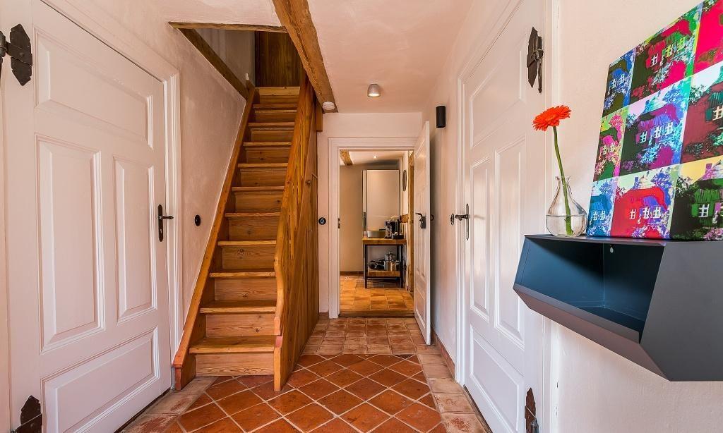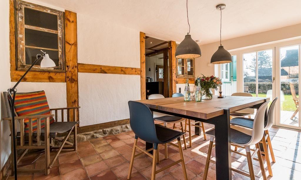 Mit viel Liebe zum Detail wurde diese denkmalgeschützte Büdnerei restauriert. Viele alte Elemente wurden erhalten und versprechen eine kleine Zeitreise, mit den alten Fenstern im Innenbereich, den liebevoll aufbereiteten alten Holztüren und dem ortstypischen Fachwerk. Den historischen Elementen wurden teilweise sehr moderne Ausstattungsdetails gegenüber gestellt, so dass sich ein spannender und doch harmonischer Kontrast von Alt und Neu ergibt. Im Erdgeschoss erwartet dich neben dem geräumigen Eingangsbereich eine hochwertige und voll ausgestattete Küche mit einem kleinen Esstisch. Hier kann nach Herzenslust gekocht und geklönt werden. Eine kleine Stufe führt dich in die lichtdurchflutete Veranda mit dem großen Esstisch, der viel Platz für Spieleabende mit der ganzen Familie bietet. An die Küche grenzt der moderne Wohnraum, der mit seiner bequemen Couch am Kaminofen entspannte Stunden verspricht. Ein wunderschön gestaltetes Schlafzimmer mit einem Doppelbett befindet sich ebenfalls ebenerdig. Auch das stylische Bad ist mit alten und modernen Elementen ausgestattet. Die bodengleiche Dusche und die Fußbodenheizung garantieren einen hohen Standard und absolutes Wohlfühlen. Ins Obergeschoss gelangest du über eine steile Stiege, welche aus Denkmalschutzgründen erhalten blieb. Die Treppe ist für gehbehinderte Gäste nicht geeignet. Bei Kindern wird hier um erhöhte Aufmerksamkeit gebeten. Oben angekommen, befinden sich zwei weitere Schlafzimmer. Urgemütlich und modern sind auch diese mit Doppelbetten und Stauraum ausgestattet. Ein zusätzliches Bad mit Badewanne/WC und Fußbodenheizung rundet diese Etage ab.