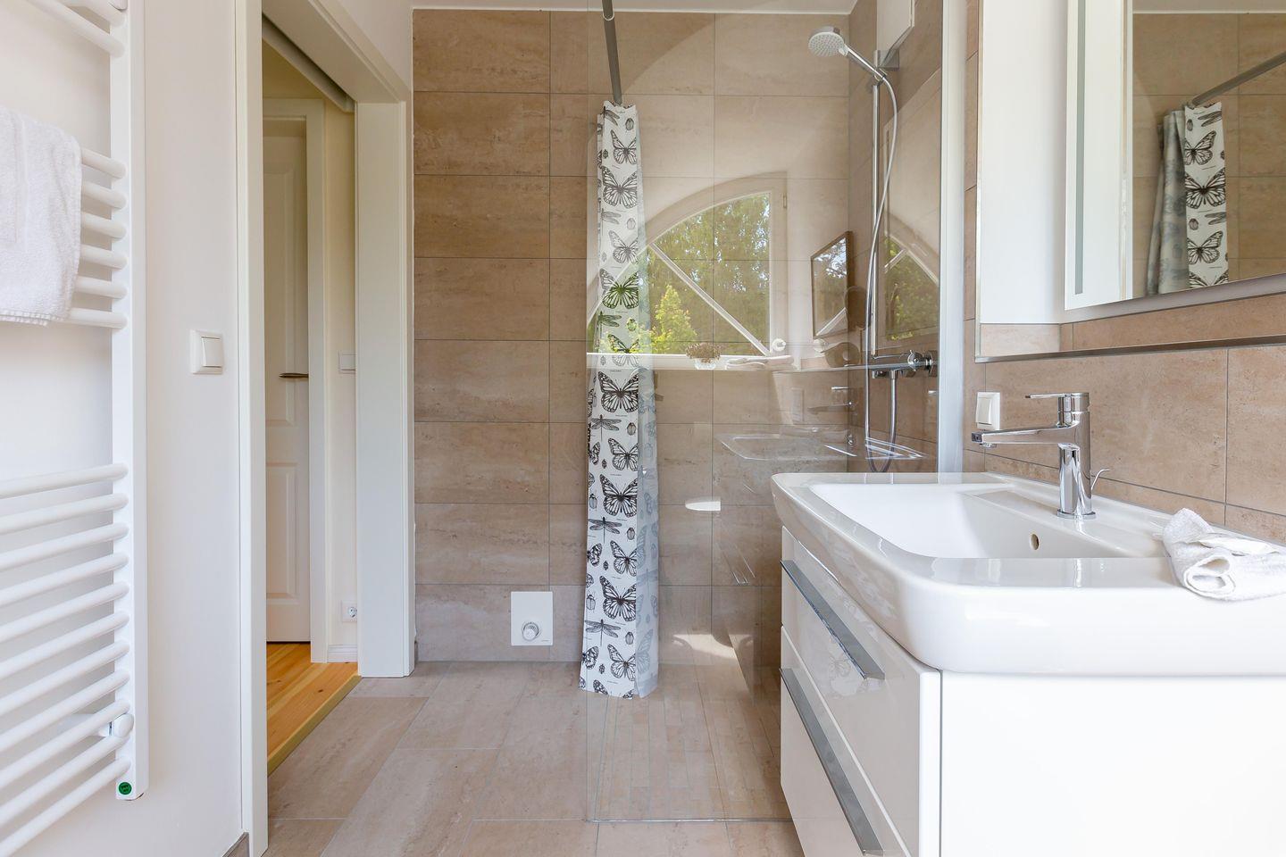 Herzlich willkommen in dieser wunderschönen Doppelhaushälfte. Hier ist wirklich an alles gedacht worden, das zum Wohnkomfort im Urlaub gehört. Durch den Flur gelangst du in den lichtdurchfluteten und großzügigen Wohn- und Küchenbereich. Dank der vollausgestatteten Küche und dem gemütlichen Essplatz kannst du hier mit der ganzen Familie nach Herzenslust kochen und klönen. Ein kleiner Loungebereich mit Ledercouch, Sessel und TV befindet sich nah am Kamin und lädt zu erholsamen Abendstunden ein. Ebenfalls im Erdgeschoss befindet sich ein Gäste-WC mit Waschmaschine und Trockner. Beide Geräte werden über einen Münzautomaten betrieben. Über die Treppe gelangst du in das erste Obergeschoss. Hier befinden sich die zwei identisch eingerichteten Schlafzimmer. Die hochwertigen Doppelbetten, Einbauschränke und je ein TV bieten den perfekten Rückzugsraum und erholsamen Schlaf, den du dir im Urlaub wünschst. Beide Schlafzimmer sind mit einem stylischen Bad en suite verbunden, dass du durch eine Schiebetür abtrennen kannst. Ein besonderes Highlight ist die großzügige Sauna im Dachgeschoss des Hauses. Hier kannst du dich nach erlebnisreichen Tagen entspannen, Kraft tanken und es dir einfach gut gehen lassen. Bitte beachte, dass die Sauna per Münzzahlung genutzt wird.
