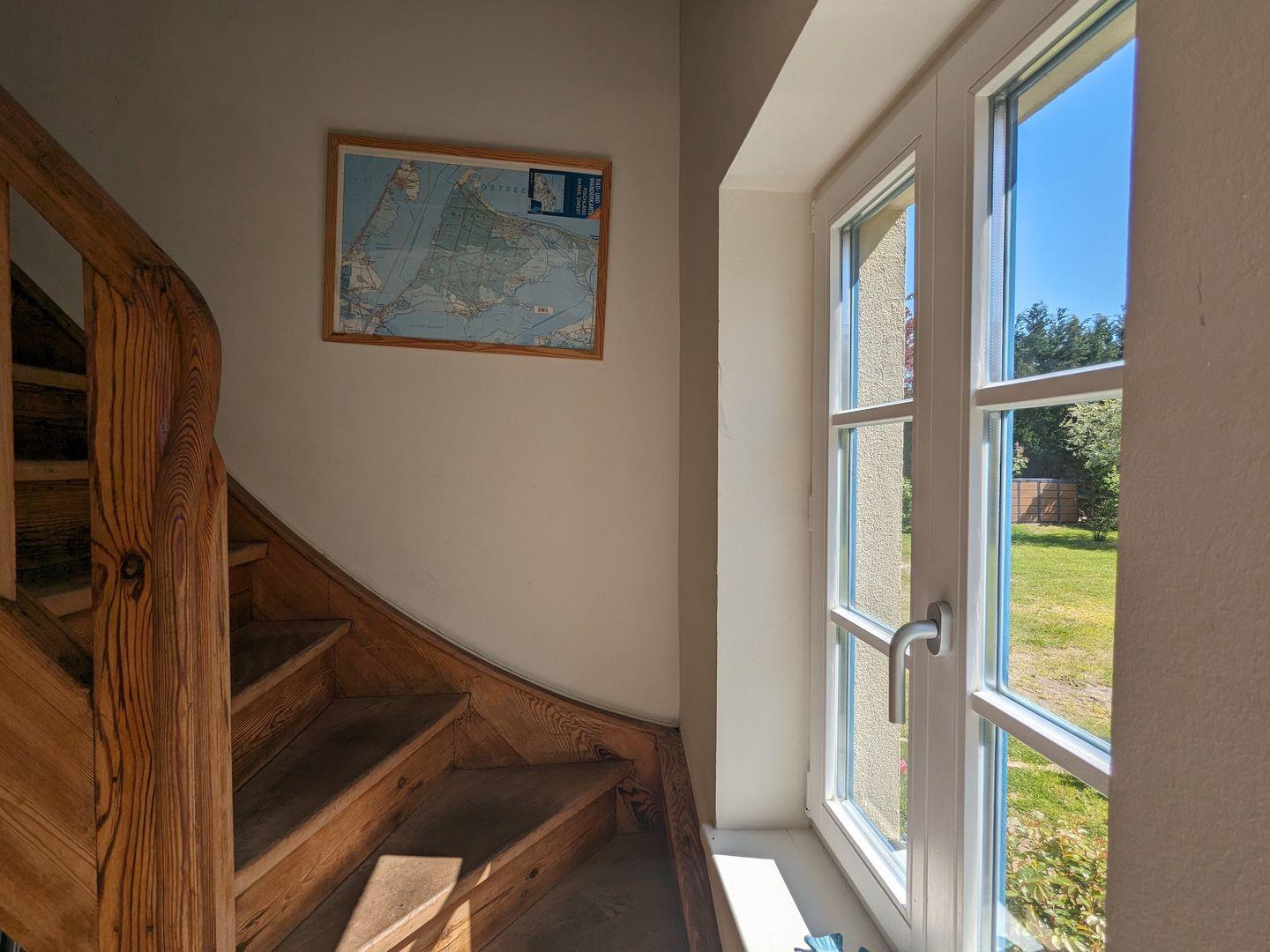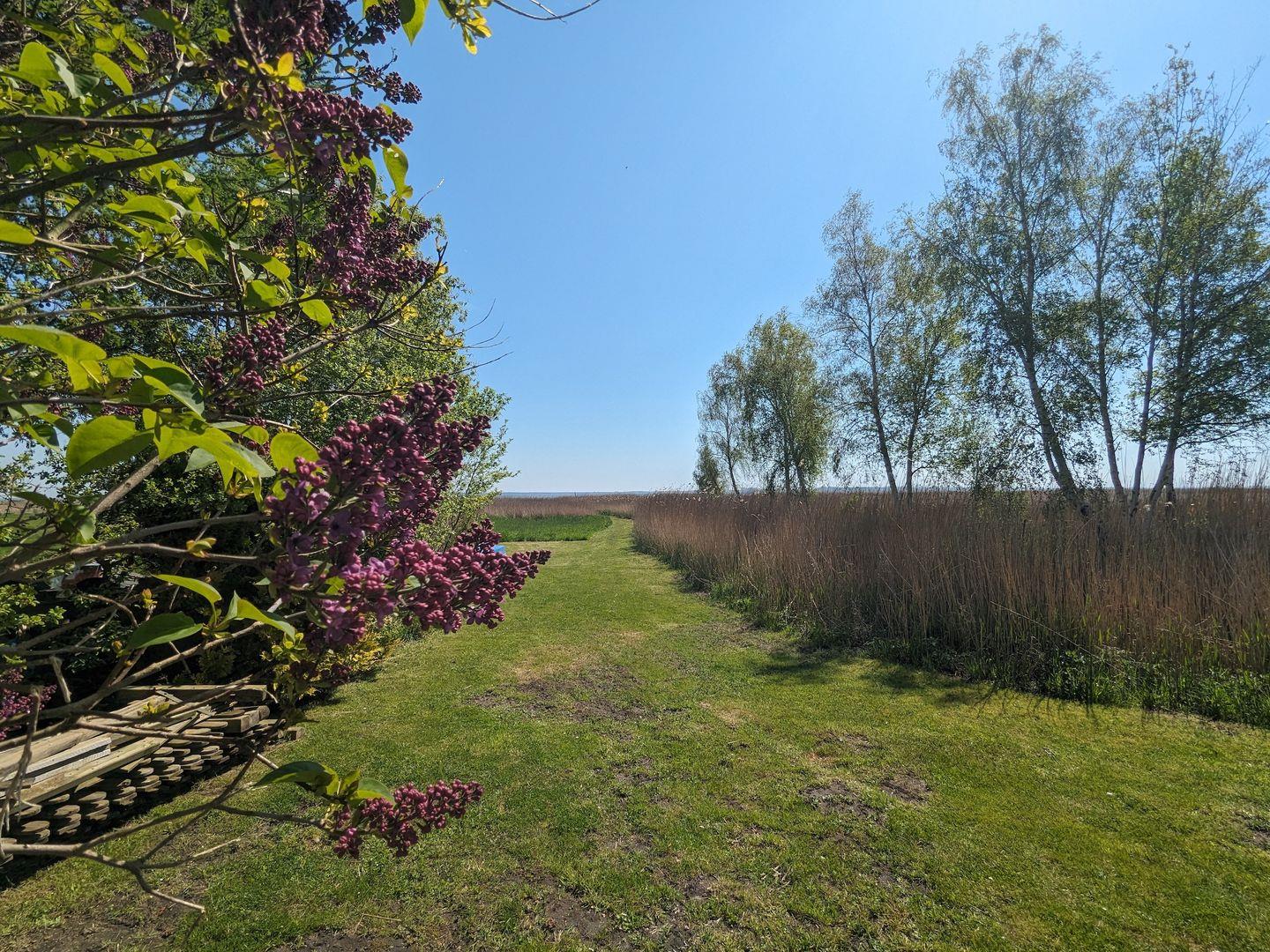 direkt auf den angrenzenden Bodden. Nur der Garten, mit alten Obstbäumen bewachsen und ein Schilfgürtel trennt Sie vom Wasser. An kühleren Tagen verzaubert Sie das Knistern des Kamins nach einem Spaziergang an der aufgewühlten Ostsee und dazu eine heiße Tasse Tee...Jede Jahreszeit ist ein "Boddenblick" wert!