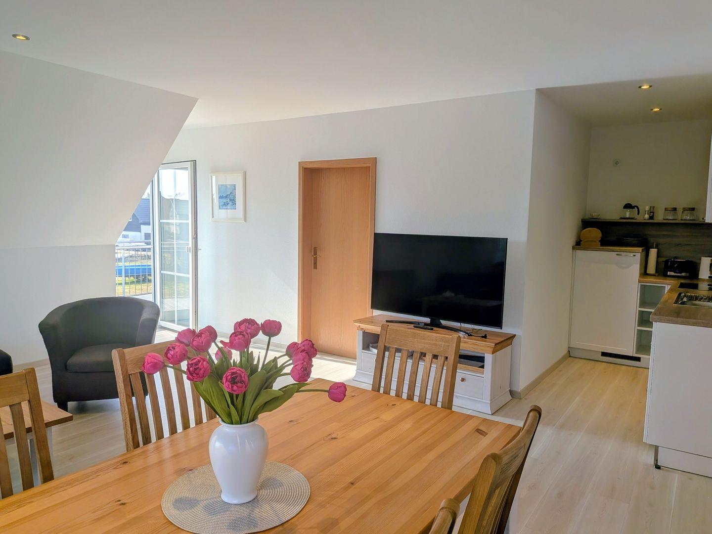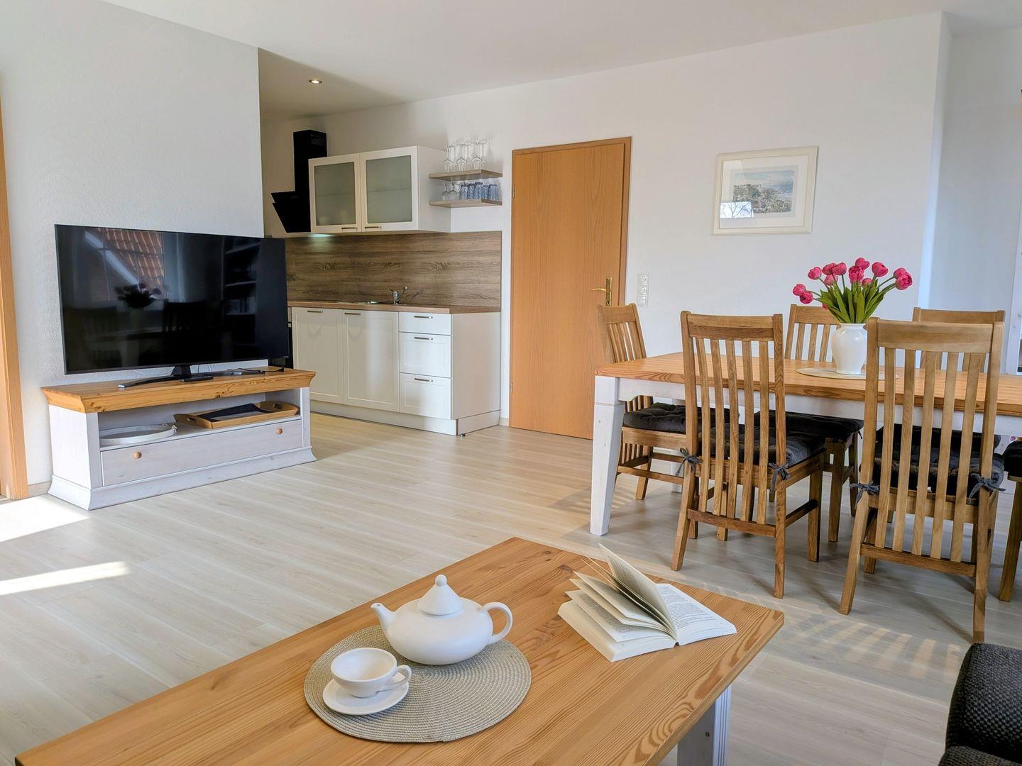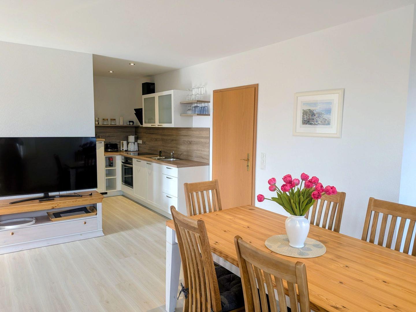 Die Ferienwohnung überzeugt durch eine offene Küchen-Living-Atmosphäre, die viel Licht und Platz bietet. Die vollständig ausgestattete Küche mit einem Ceranherd, Backofen, Kühlschrank und Geschirrspüler lässt beim Kochen keine Wünsche offen. Gemeinsame Mahlzeiten können am Esstisch im Wohnzimmer genossen werden, der zu entspannten Abenden und herzhaften Gesprächen einlädt.