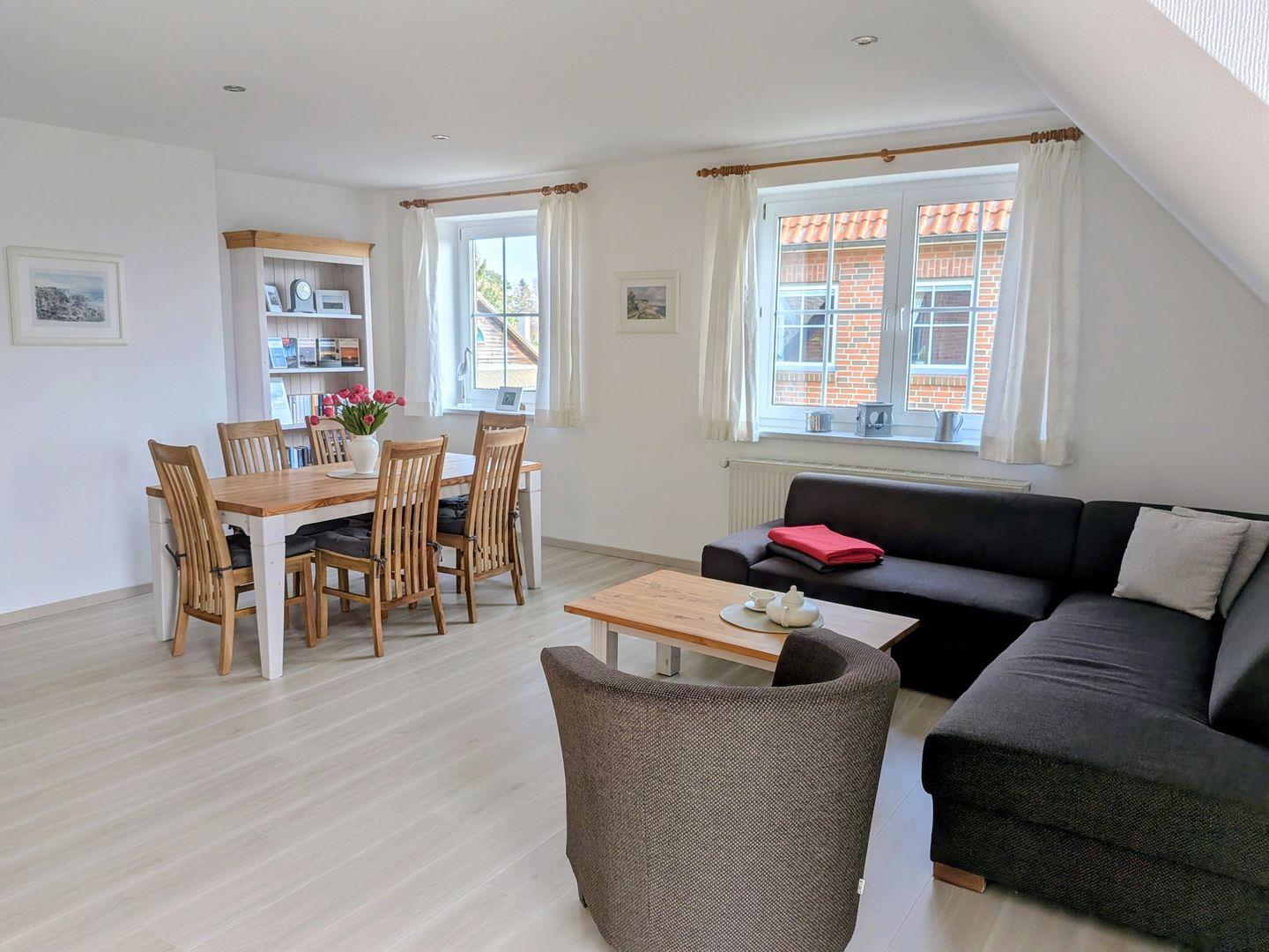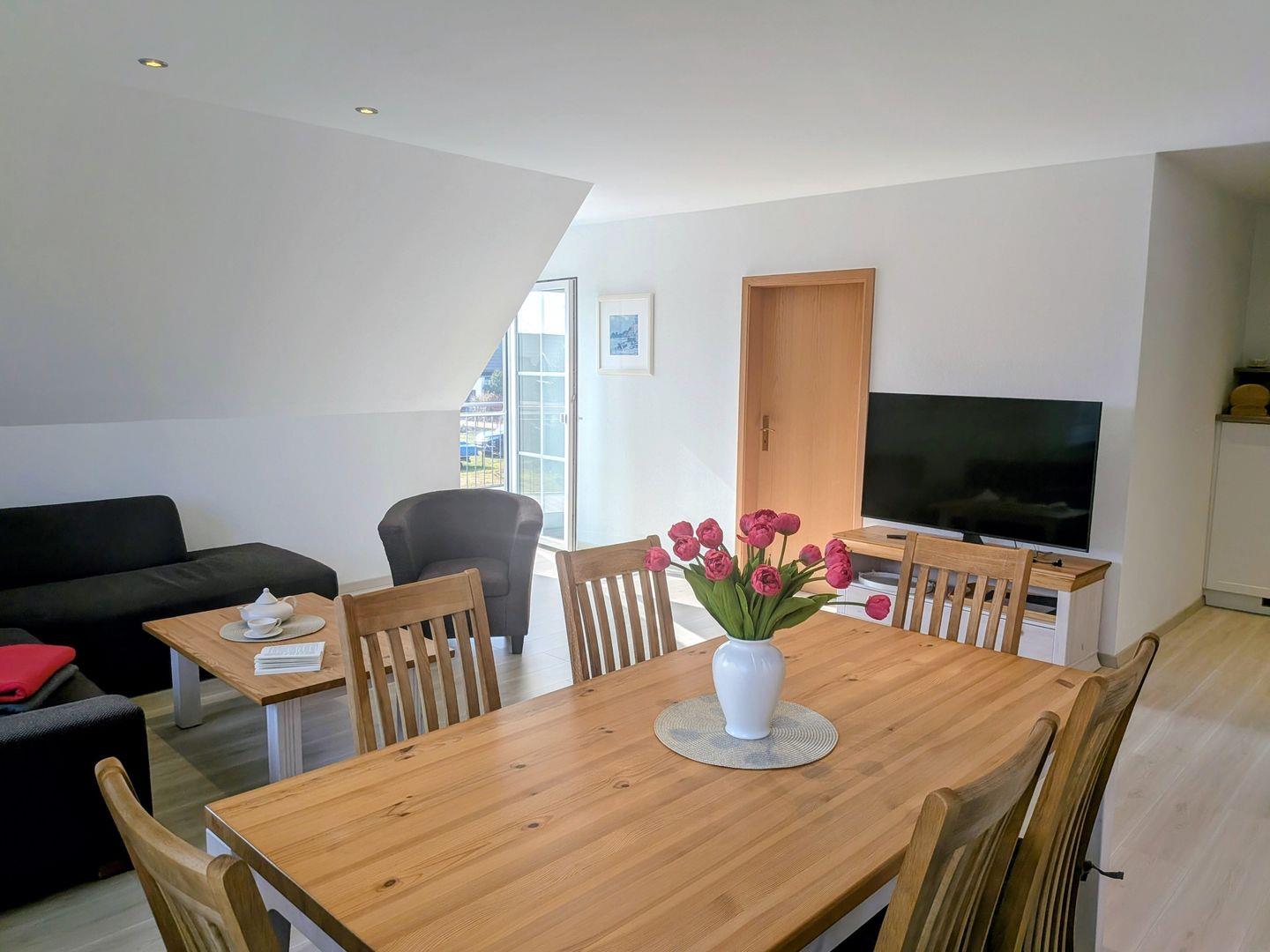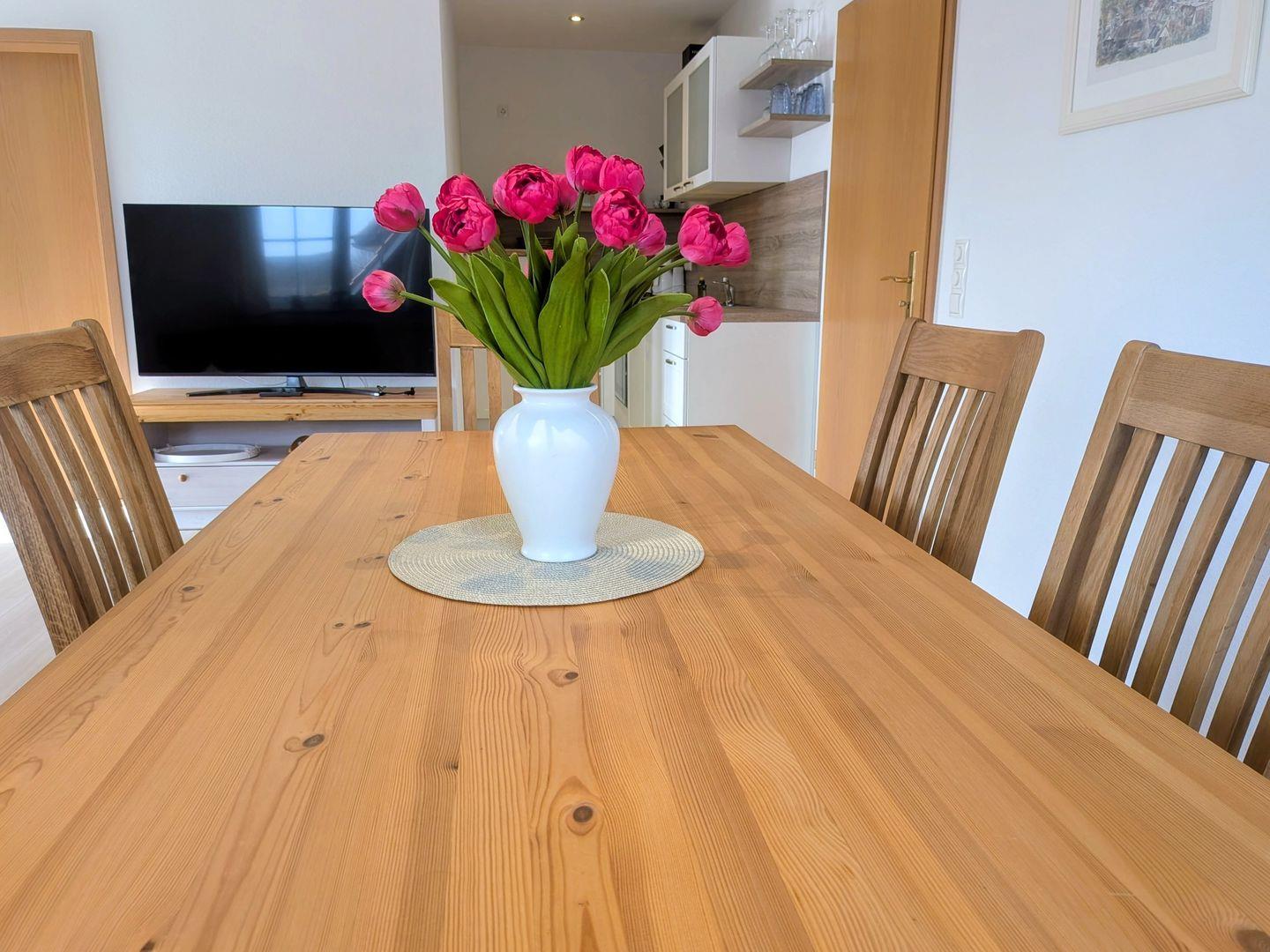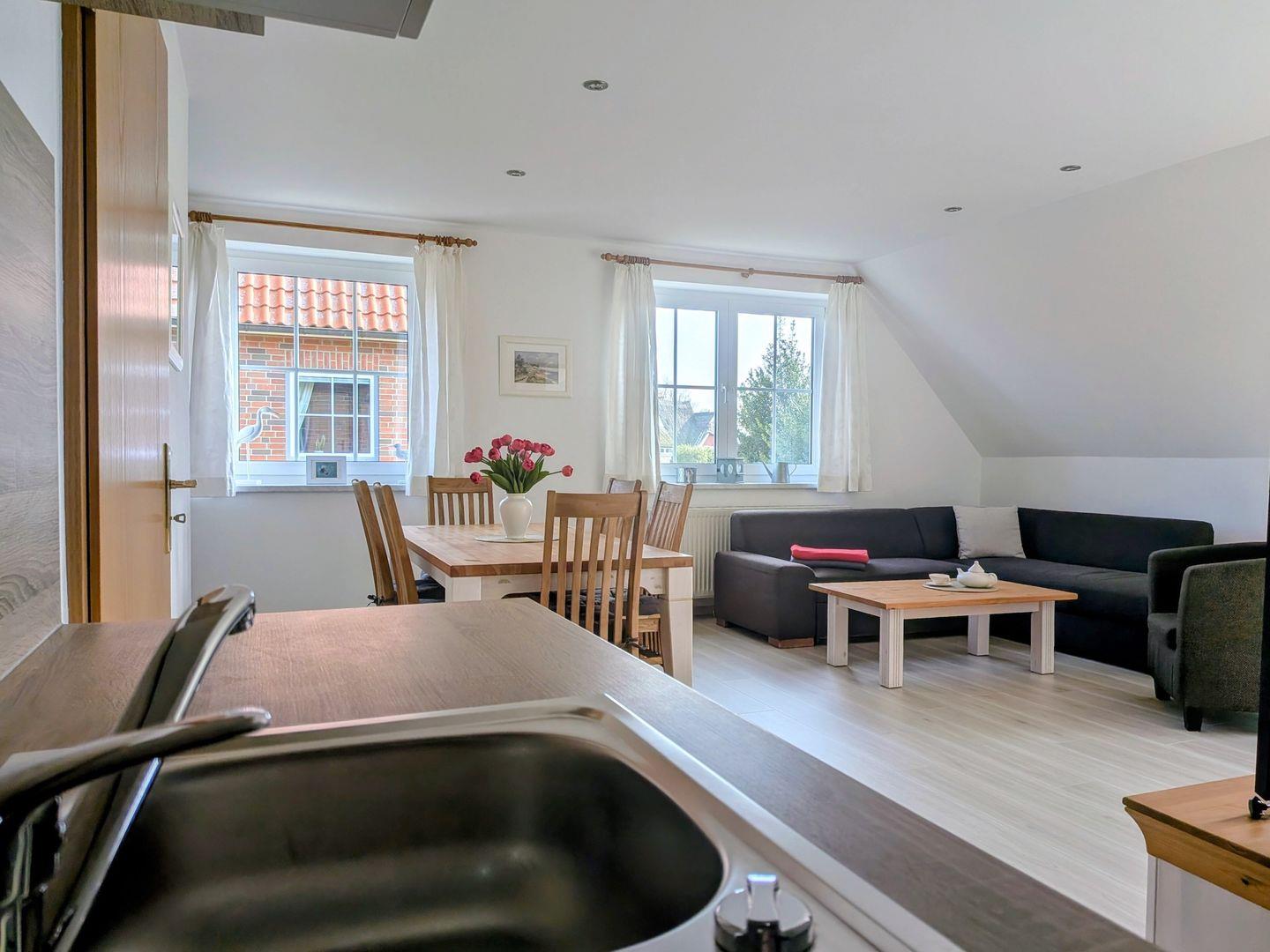 Die Ferienwohnung überzeugt durch eine offene Küchen-Living-Atmosphäre, die viel Licht und Platz bietet. Die vollständig ausgestattete Küche mit einem Ceranherd, Backofen, Kühlschrank und Geschirrspüler lässt beim Kochen keine Wünsche offen. Gemeinsame Mahlzeiten können am Esstisch im Wohnzimmer genossen werden, der zu entspannten Abenden und herzhaften Gesprächen einlädt.