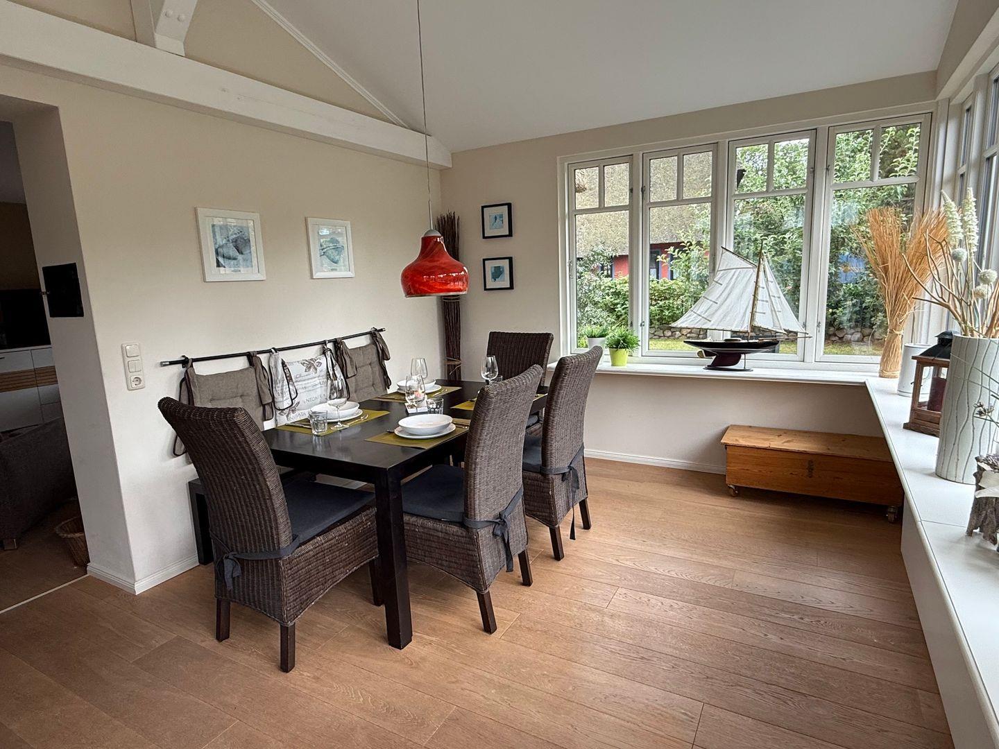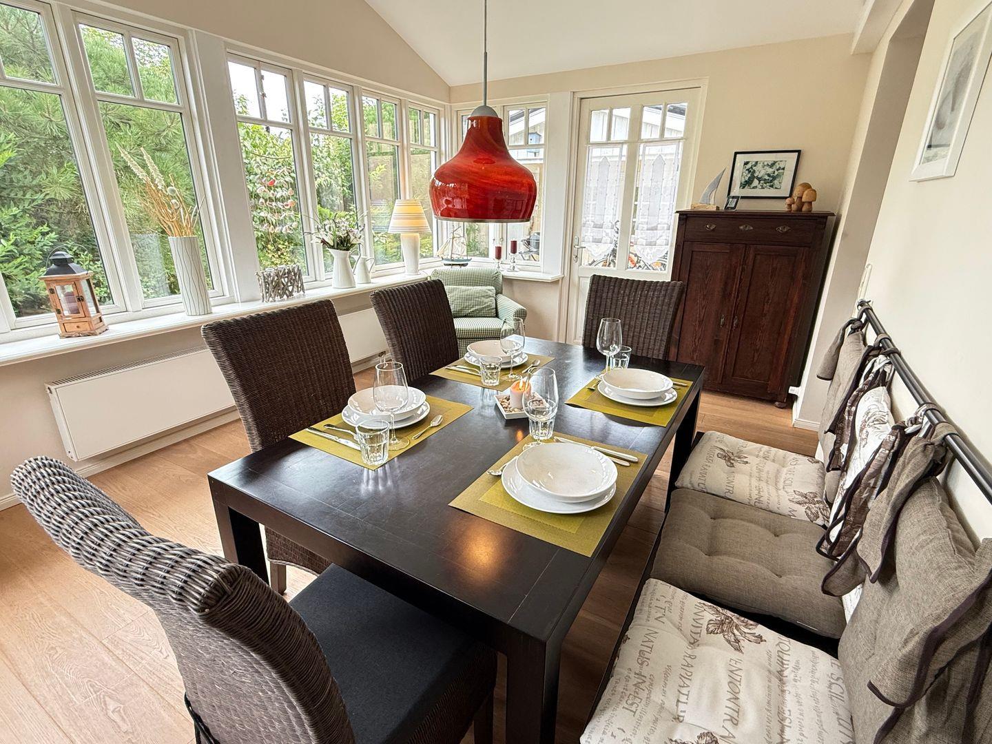 Das Ferienhaus Windflüchter ist idyllisch gelegen und umgeben von einem schönen Garten und einer blickgeschützen Terrasse. Die offene Küche ist durch ein beidseitig nutzbares Küchenboard vom gemütlichen Wohnzimmer mit Kamin getrennt. Vom Wohnzimmer aus gelangen sie in den lichtdurchfluteten Wintergarten mit Esstisch und Sitzmöglichkeiten bis zu 7 Personen. Für Ihren Aufenthalt stehen Ihnen ausßerdem 2 Schlafzimmer, 2 moderne Bäder und eine Sauna am Carport zur Verfügung.