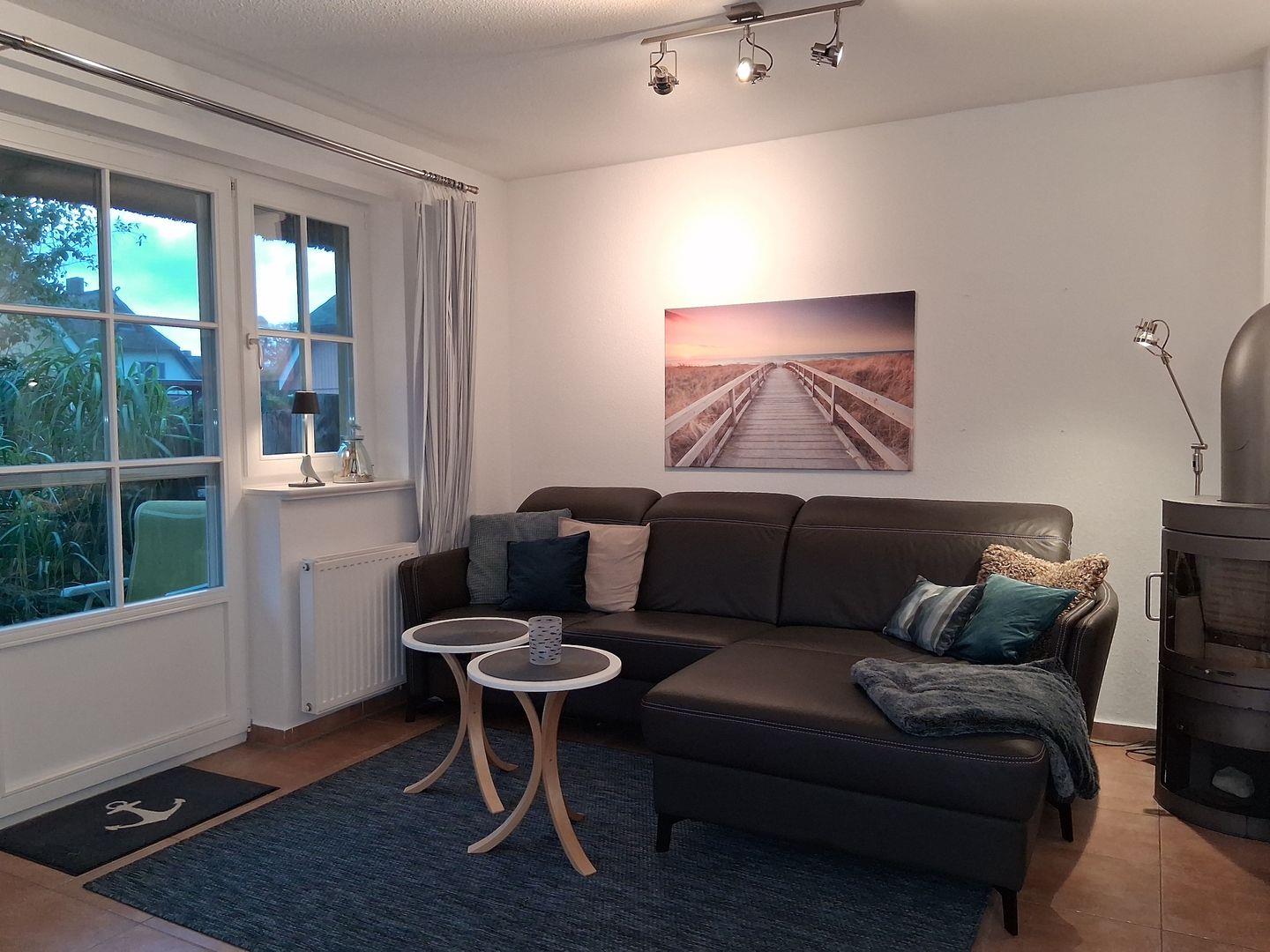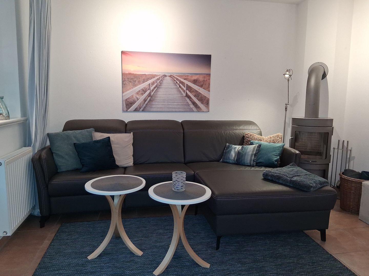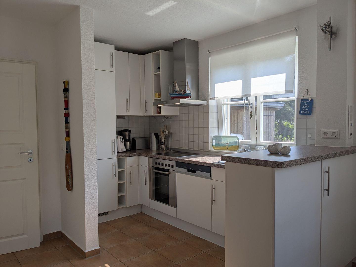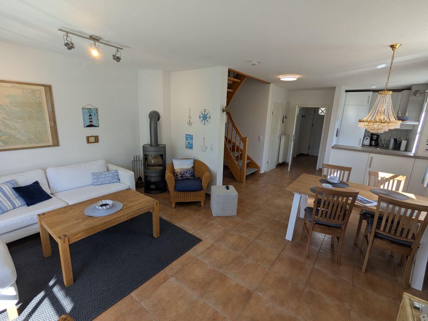 Die Ferienwohnung besticht durch eine offene, lichtdurchflutete Küche, die sowohl funktional als auch einladend gestaltet ist. Sie ist ausgestattet mit einem Cerankochfeld, Backofen, Geschirrspüler und allen notwendigen Küchenutensilien, um selbst die feinsten Speisen zuzubereiten. Der angrenzende Essbereich mit einem gemütlichen Esstisch lädt zu gemeinsamen Mahlzeiten ein, während das Wohnzimmer mit einem Kaminofen für wohlige Wärme und eine hyggelige Atmosphäre sorgt. Hier können Sie es sich nach einem langen Tag am Strand mit einem guten Buch oder einem Film, dank des vorhandenen DVD- und CD-Players, gemütlich machen.