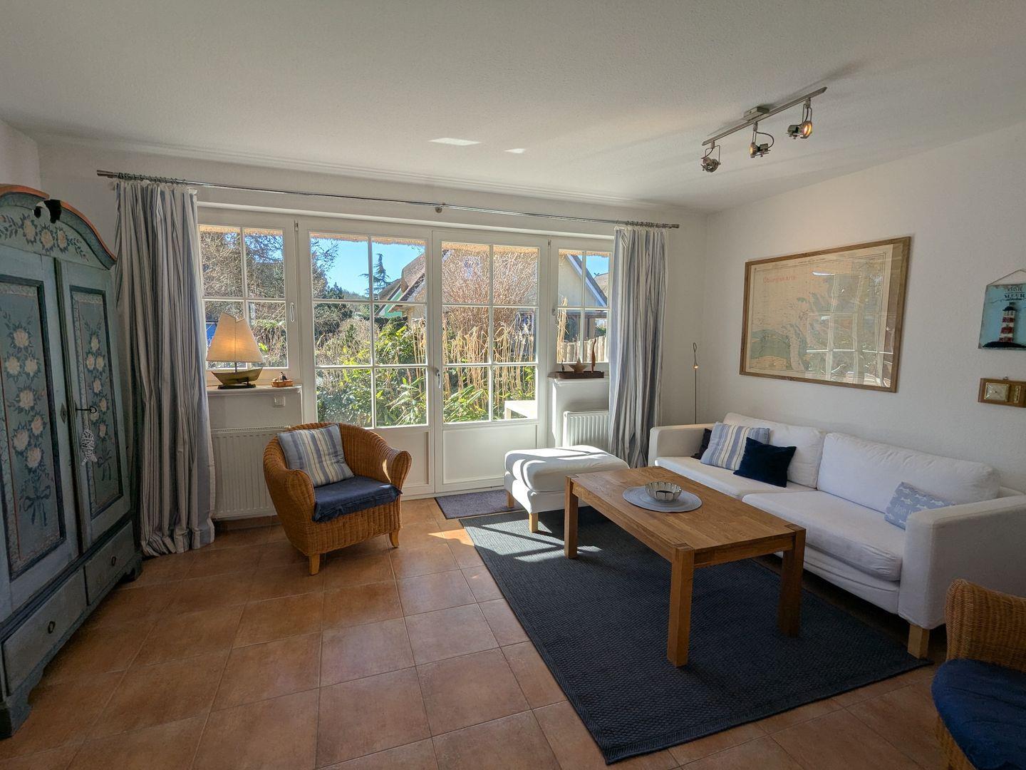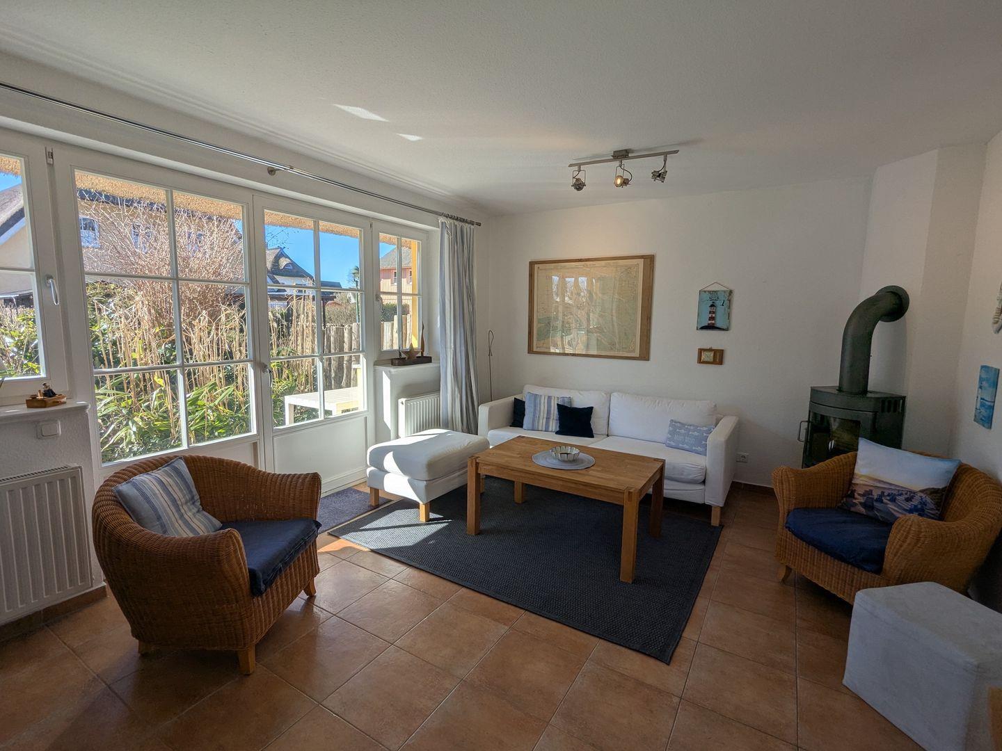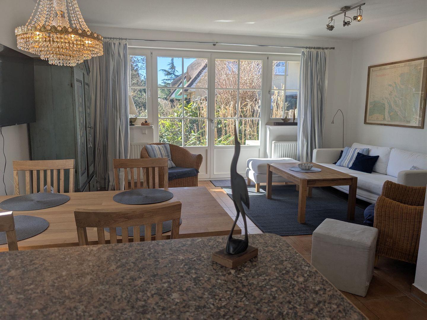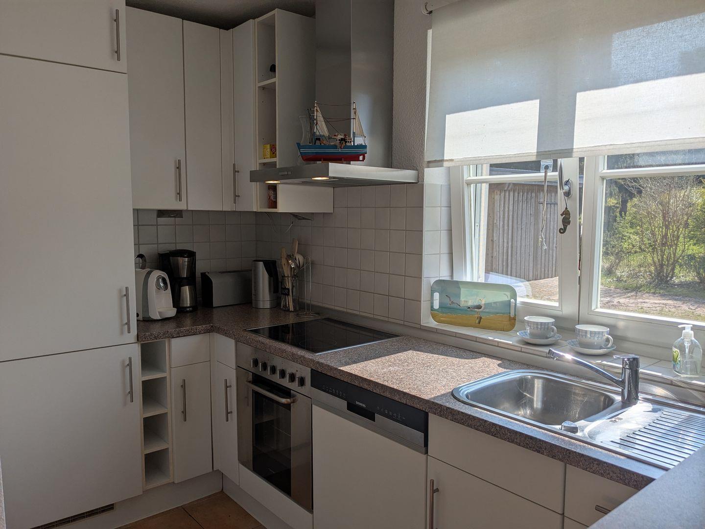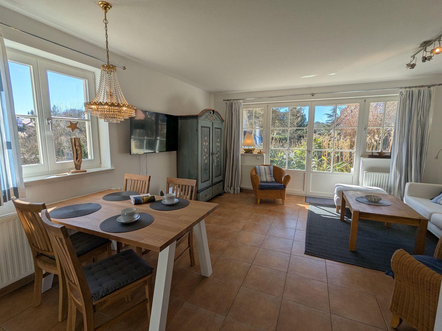 Die Ferienwohnung besticht durch eine offene, lichtdurchflutete Küche, die sowohl funktional als auch einladend gestaltet ist. Sie ist ausgestattet mit einem Cerankochfeld, Backofen, Geschirrspüler und allen notwendigen Küchenutensilien, um selbst die feinsten Speisen zuzubereiten. Der angrenzende Essbereich mit einem gemütlichen Esstisch lädt zu gemeinsamen Mahlzeiten ein, während das Wohnzimmer mit einem Kaminofen für wohlige Wärme und eine hyggelige Atmosphäre sorgt. Hier können Sie es sich nach einem langen Tag am Strand mit einem guten Buch oder einem Film, dank des vorhandenen DVD- und CD-Players, gemütlich machen.
