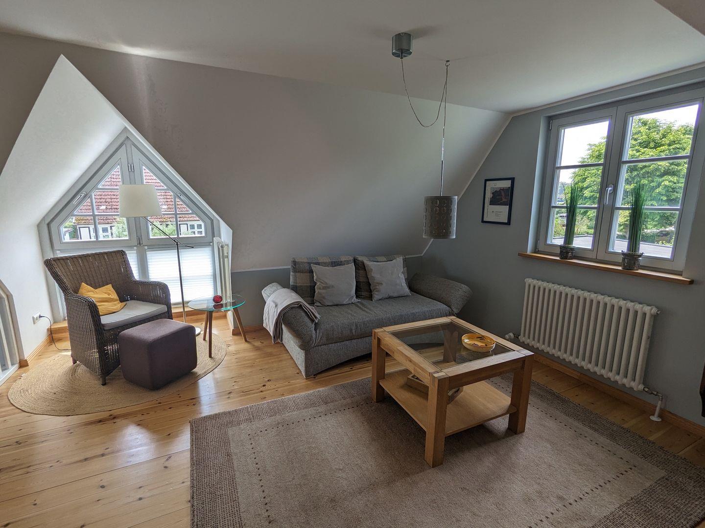 Gemütliche Ferienwohnung mit großem Balkon und Strandkorb.