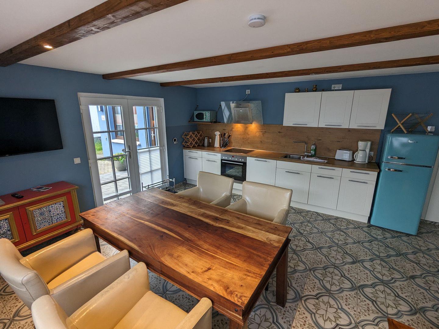 Willkommen im Dat smucke Reethus (EG), einer charmanten Ferienwohnung in ländlicher Umgebung, ideal für Ruhesuchende. Die moderne Unterkunft bietet ein gemütliches Schlafzimmer, ein Wohnzimmer mit offener Küche und einen einladenden Essbereich. Genießen Sie entspannte Stunden auf der überdachten Terrasse. WLAN, ein Privatparkplatz und die Nähe zu einem Supermarkt runden das Angebot ab. Entdecken Sie die Schönheit der Natur – buchen Sie jetzt Ihren Aufenthalt!