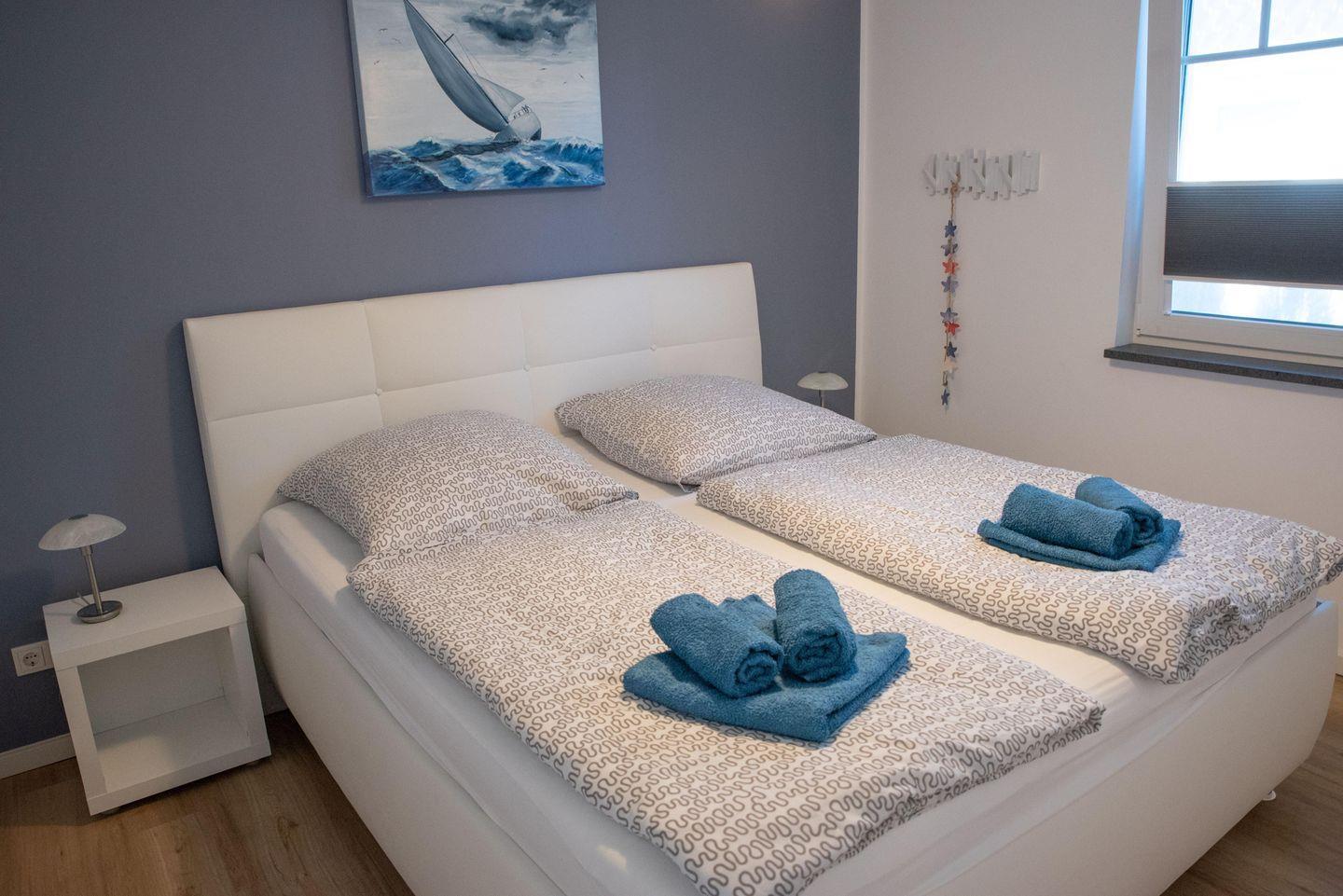 Schlafzimmer mit zwei Einzelbetten (je 0,9 x 2 m) sowie einem Schlafzimmer mit