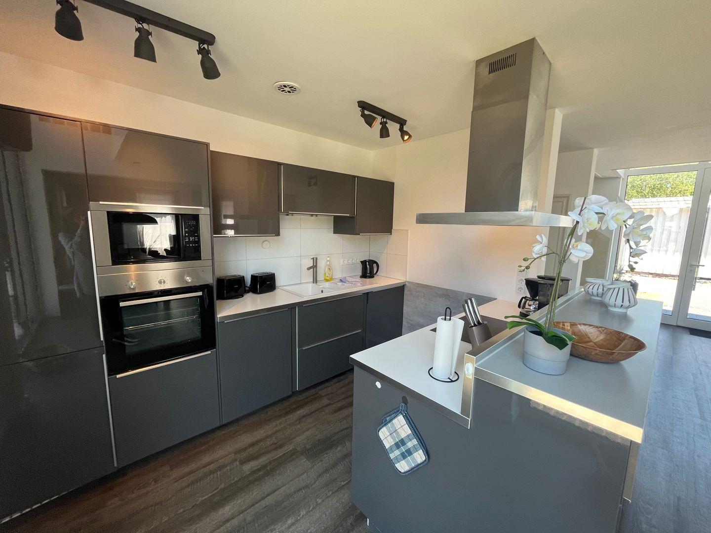 Flatscreen-Fernseher und Sofas, einer angrenzenden vollausgestatteten Küche mit