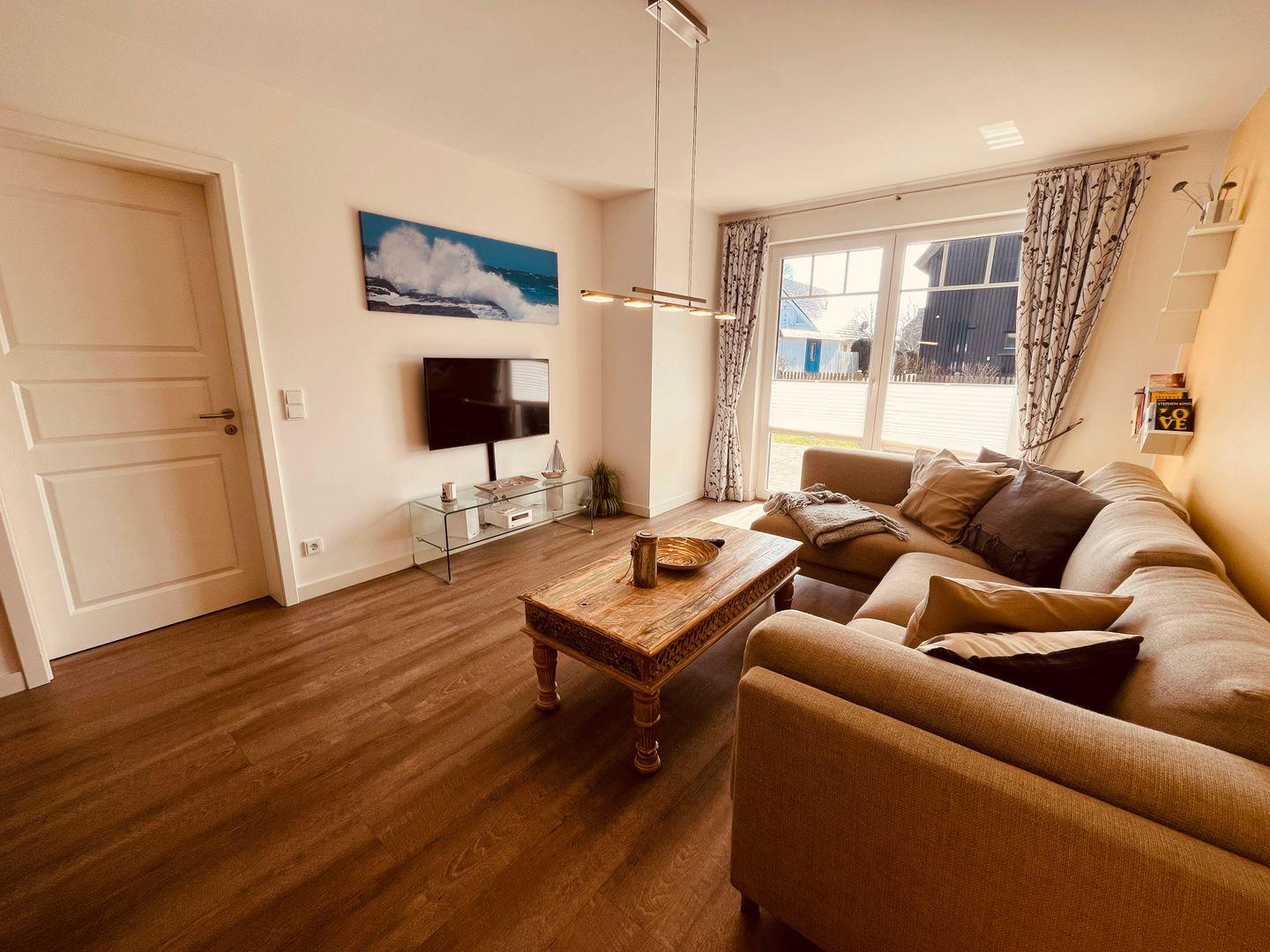 Wohnzimmer mit Flatscreen-Fernseher und großem Sofa, einer angrenzenden voll