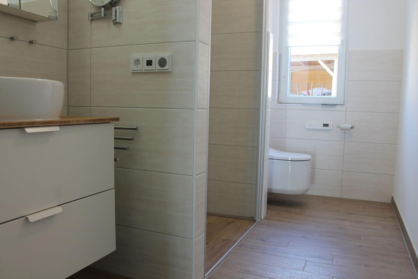 Fernbedienung. Ergänzt wird die Ausstattung mit einer großen bodenebenen Dusche