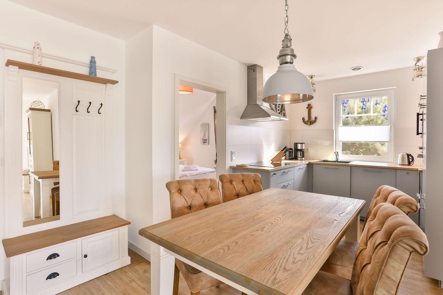 ausgestatteten Küche mit Herd, Backofen, Kaffeemaschine und Essecke, sowie