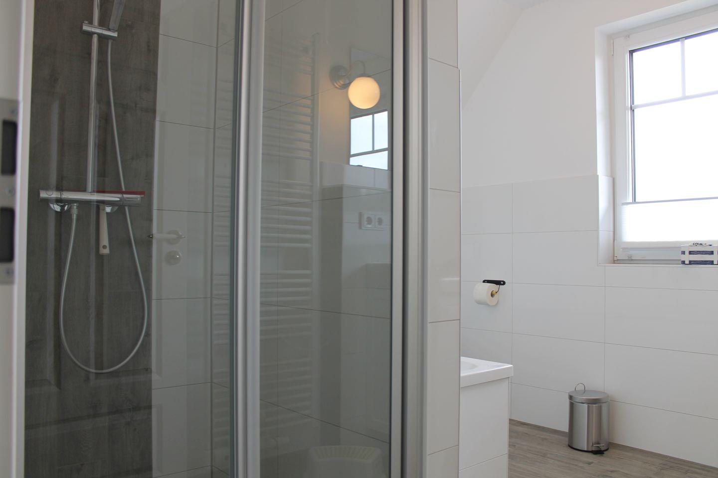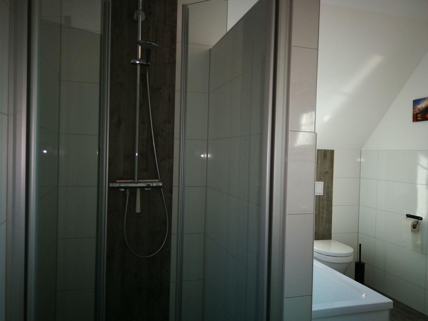 mit zwei Einzelbetten (90 x 200 cm) und das Badezimmer, mit einer Dusche und
