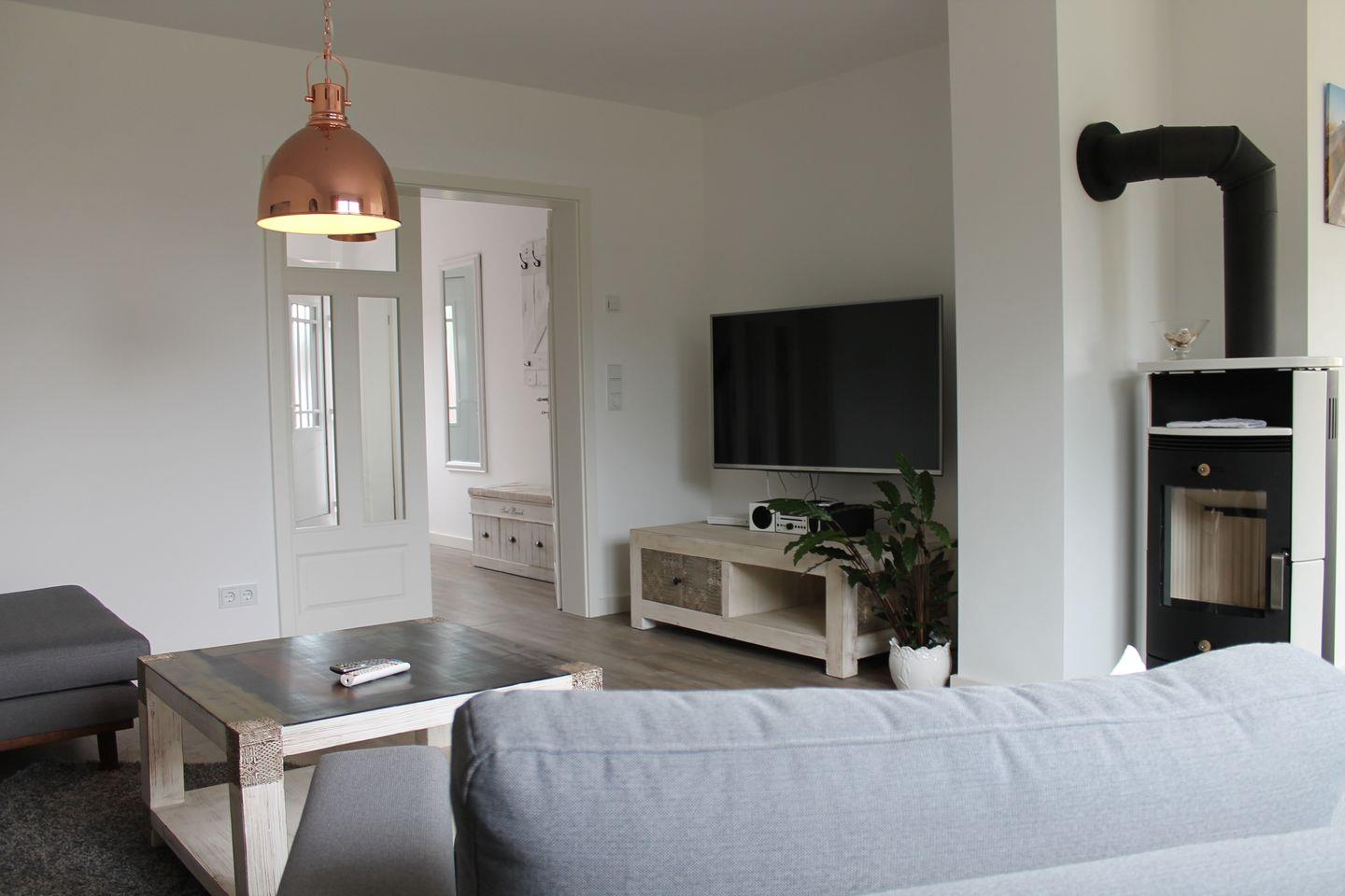 etwa 150 m² groß, besteht aus einem Wohnzimmer mit Flatscreen-Fernseher und