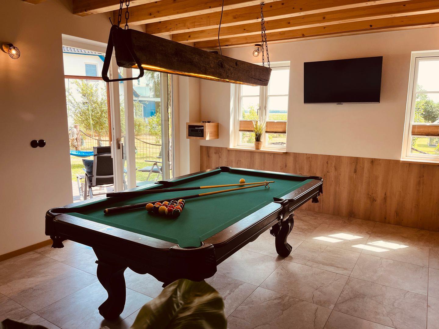 Relaxbereich und einem Billardtisch, Dartscheibe, TV und zusätzlichem Bad