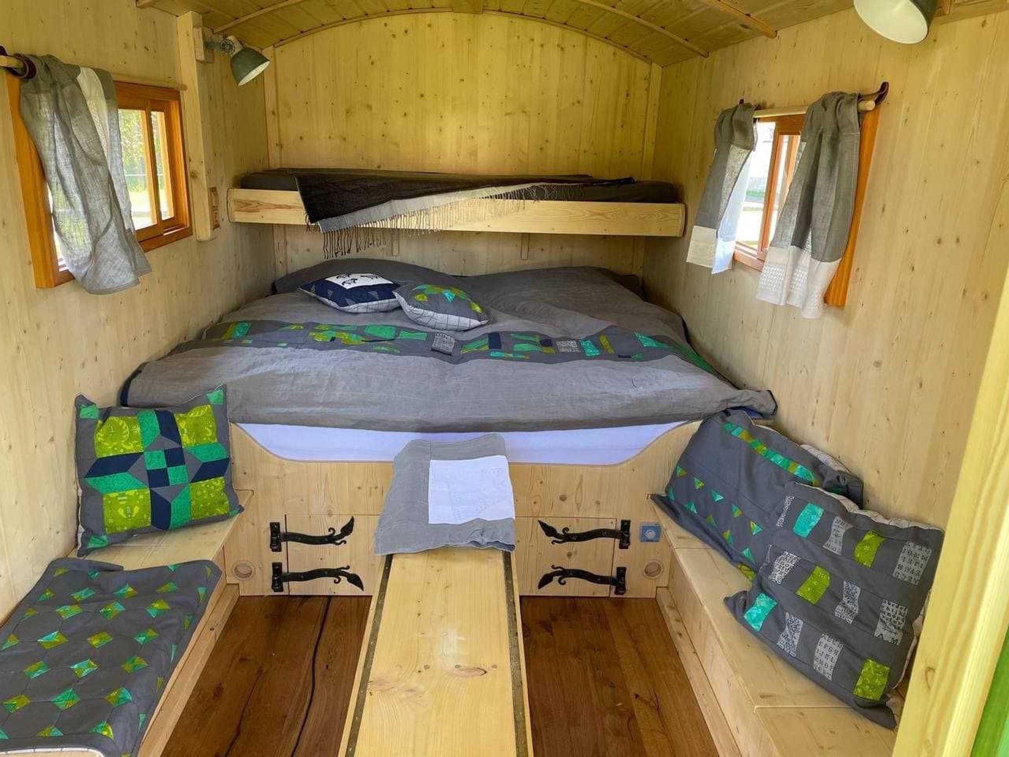 Die 3 in ökologischer Bauweise neu errichteten Wagen bieten jeweils Platz für 2 Erwachsene (Bettgröße 2 x 2 Meter) und ein Kind (Bettgröße 1,6 x 0,8 Meter). Die Betten sind mit hochwertigen Matratzen und Bettzeug ausgestattet.
