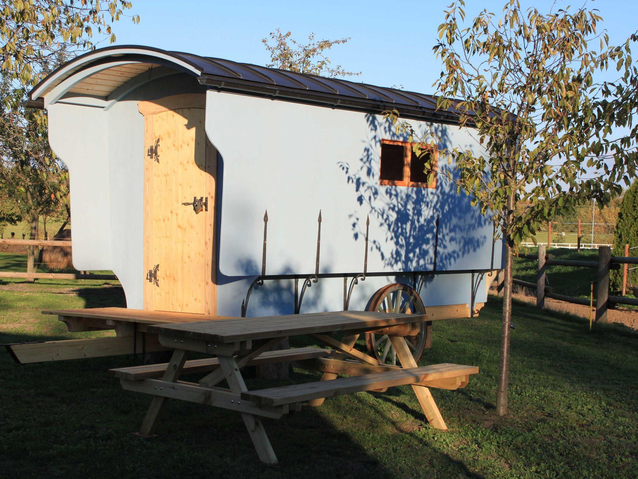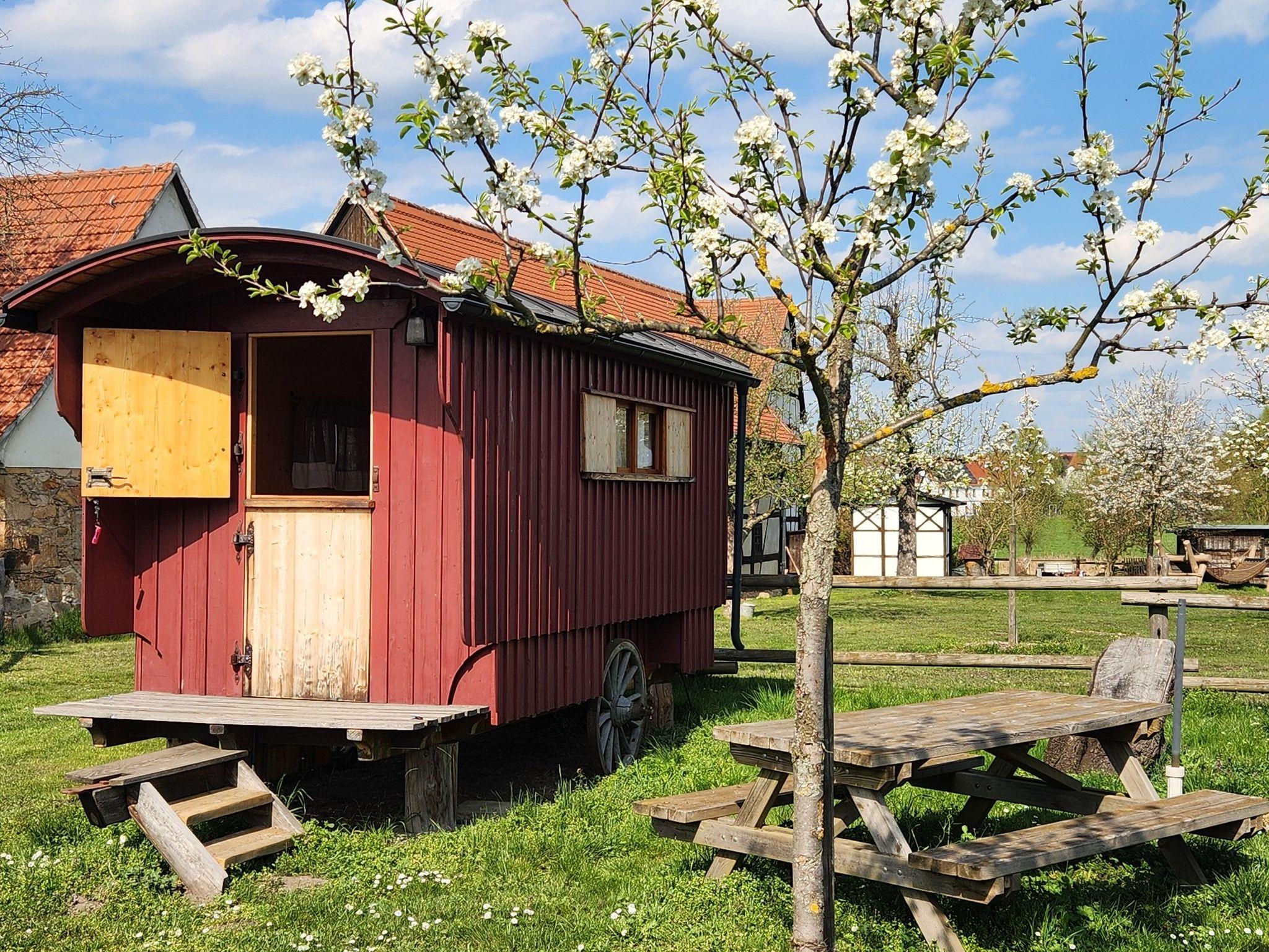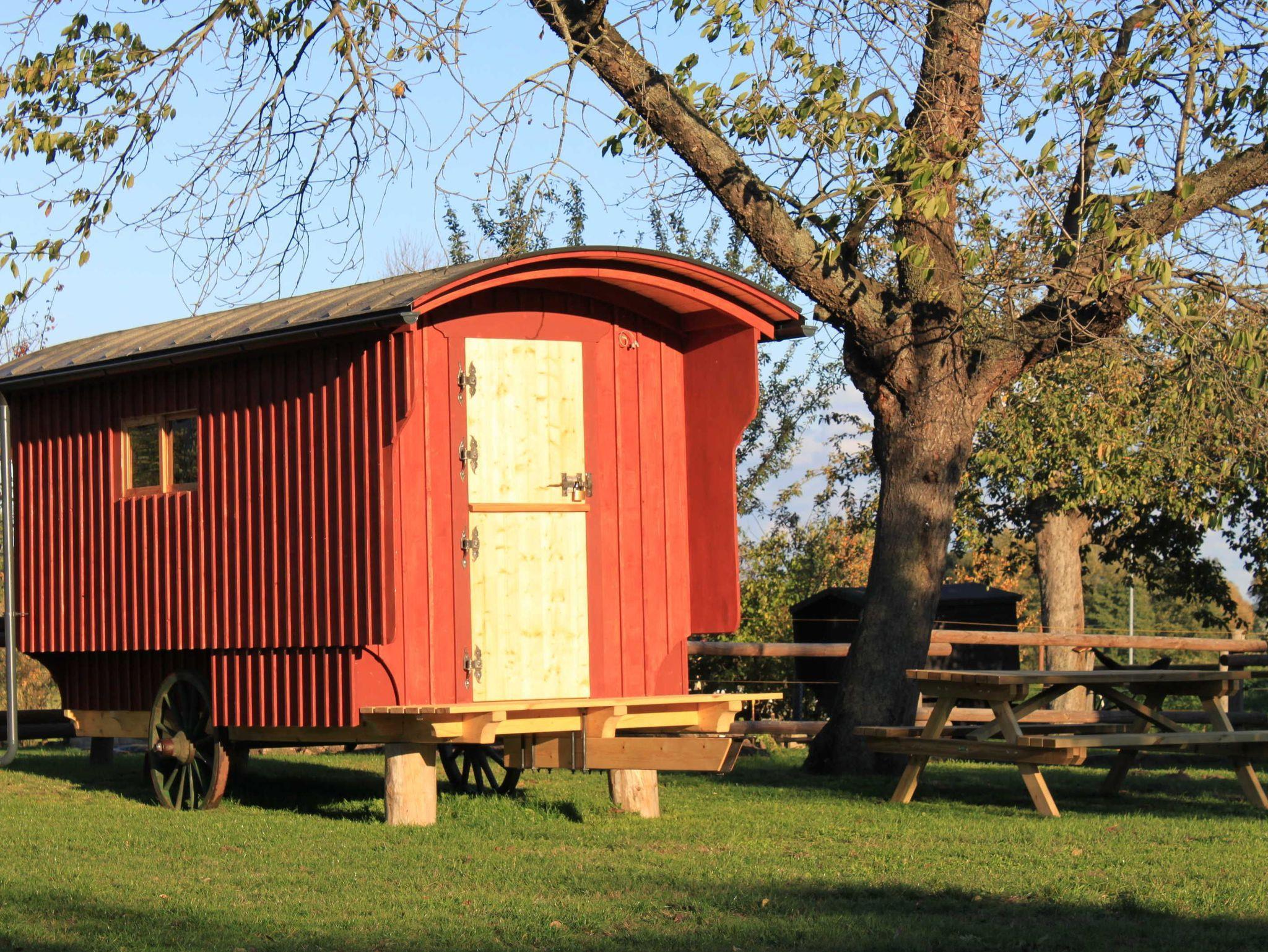 Die 3 Schäferwagen bieten ein uriges Übernachtungserlebnis mitten auf der schönen Streuobstwiese, über der nachts noch die Sterne funkeln und Fuchs und Hase persönlich zum Gute-Nacht-Sagen vorbeikommen.