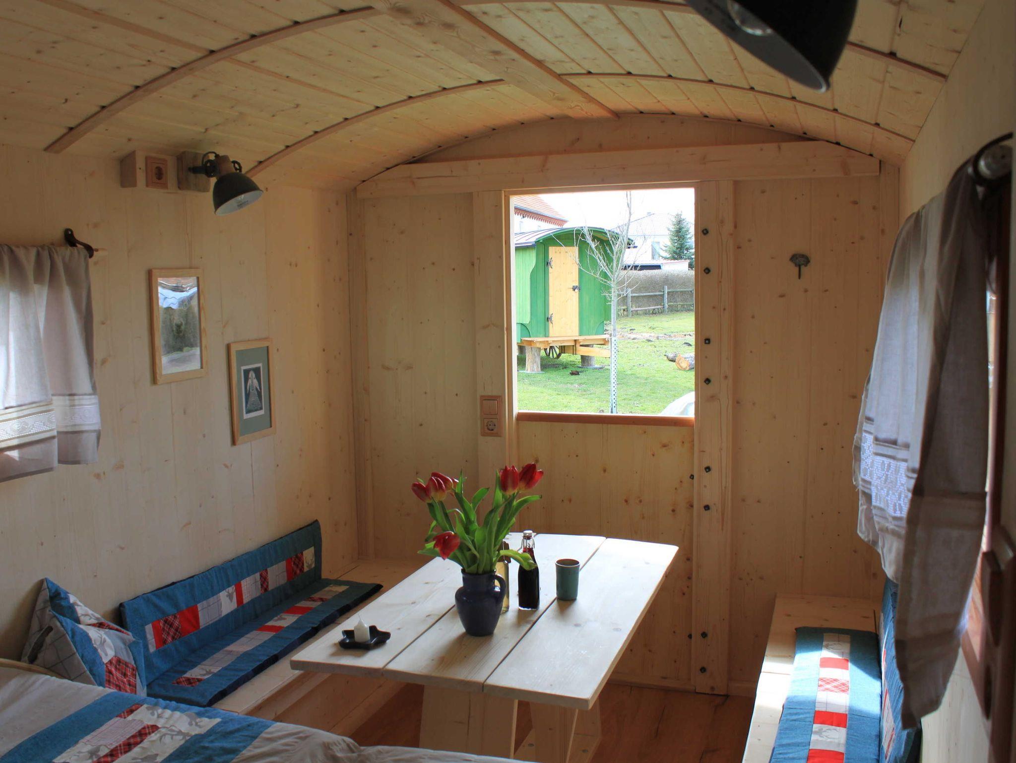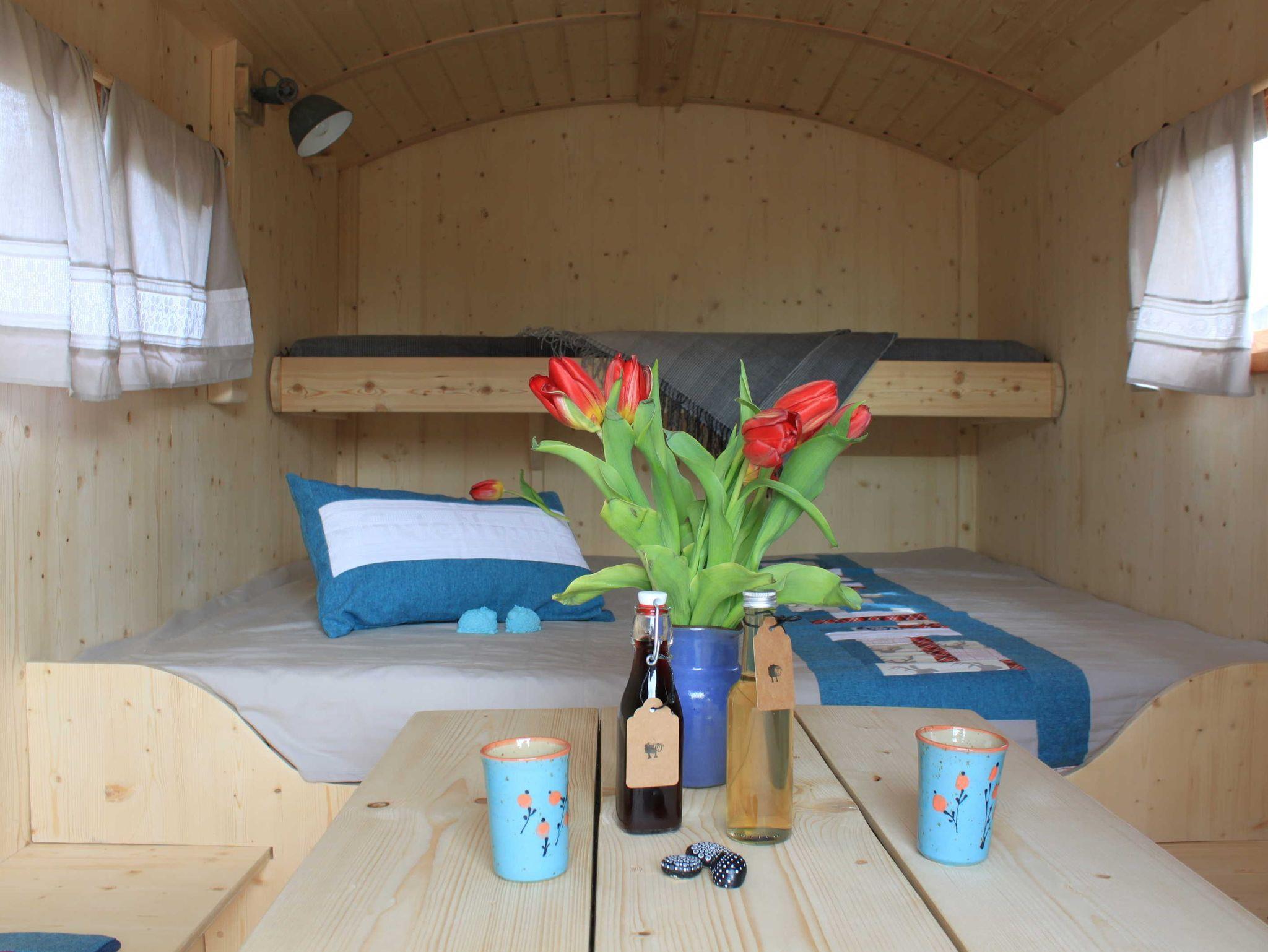 Die 3 in ökologischer Bauweise neu errichteten Wagen bieten jeweils Platz für 2 Erwachsene (Bettgröße 2 x 2 Meter) und ein Kind (Bettgröße 1,6 x 0,8 Meter). Die Betten sind mit hochwertigen Matratzen und Bettzeug ausgestattet.