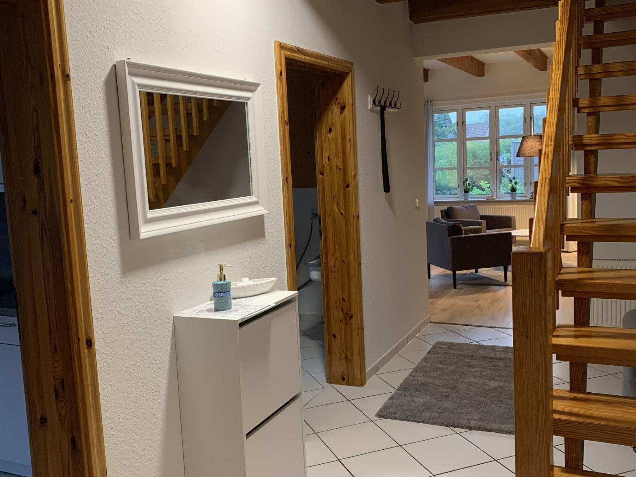 In der Küche selbst wartet auf Sie ein kleiner Sitzbereich für zwei Personen für ein schnelles Frühstück. Von der Diele aus haben Sie auch einen Zugang in einen Hauswirtschaftsraum in der sich eine Waschmaschine für Sie befindet. Ein Gäste-WC ist selbstverständlich im Erdgeschoss vorhanden. Von der Diele aus betreten Sie auch den großzügigen Wohnraum in dem sich dann eine Sofaecke so wie ein Essbereich befindet. Selbstverständlich ist der Wohnzimmerbereich mit einem TV ausgestattet.