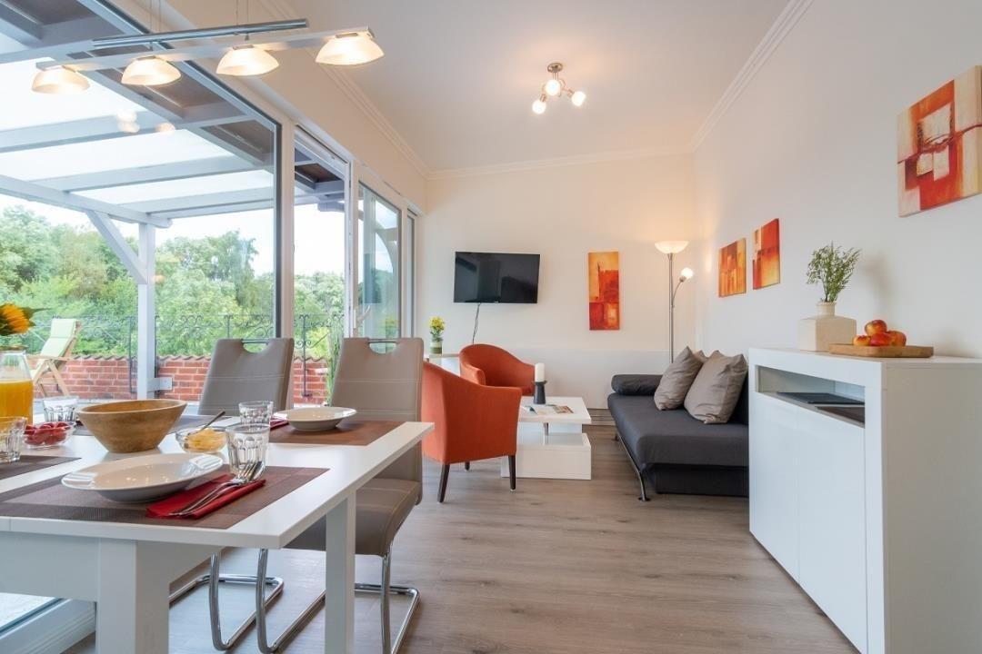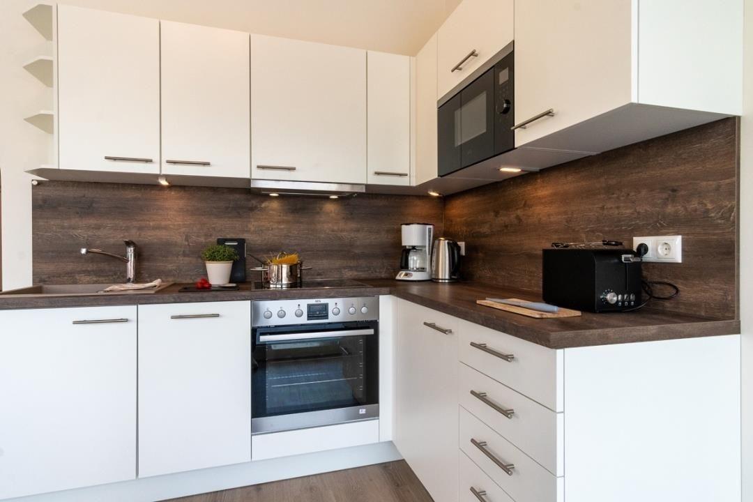 Im lichtdurchfluteten Wohnbereich erwartet Sie ein gemütliches Sofa, ein Flatscreen-TV, sowie eine kleine Essecke direkt am Terrassenfenster. Direkt daneben befindet sich der Zugang zur großen Dachterrasse mit direktem Blick zum Bischofsee. Die offene Küchenzeile ist komplett eingerichtet. Besteck, Essgeschirr, Töpfe und Pfannen sind ausreichend vorhanden. Außerdem steht Ihnen neben einer Kaffeemaschine, einem Wasserkocher und einem Toaster auch noch eine Geschirrspüler zur Verfügung. Das angrenzende geräumige Duschbad verfügt über ein WC, ein Waschbecken mit großem Spiegel, sowie eine Dusche mit Glaskabine.