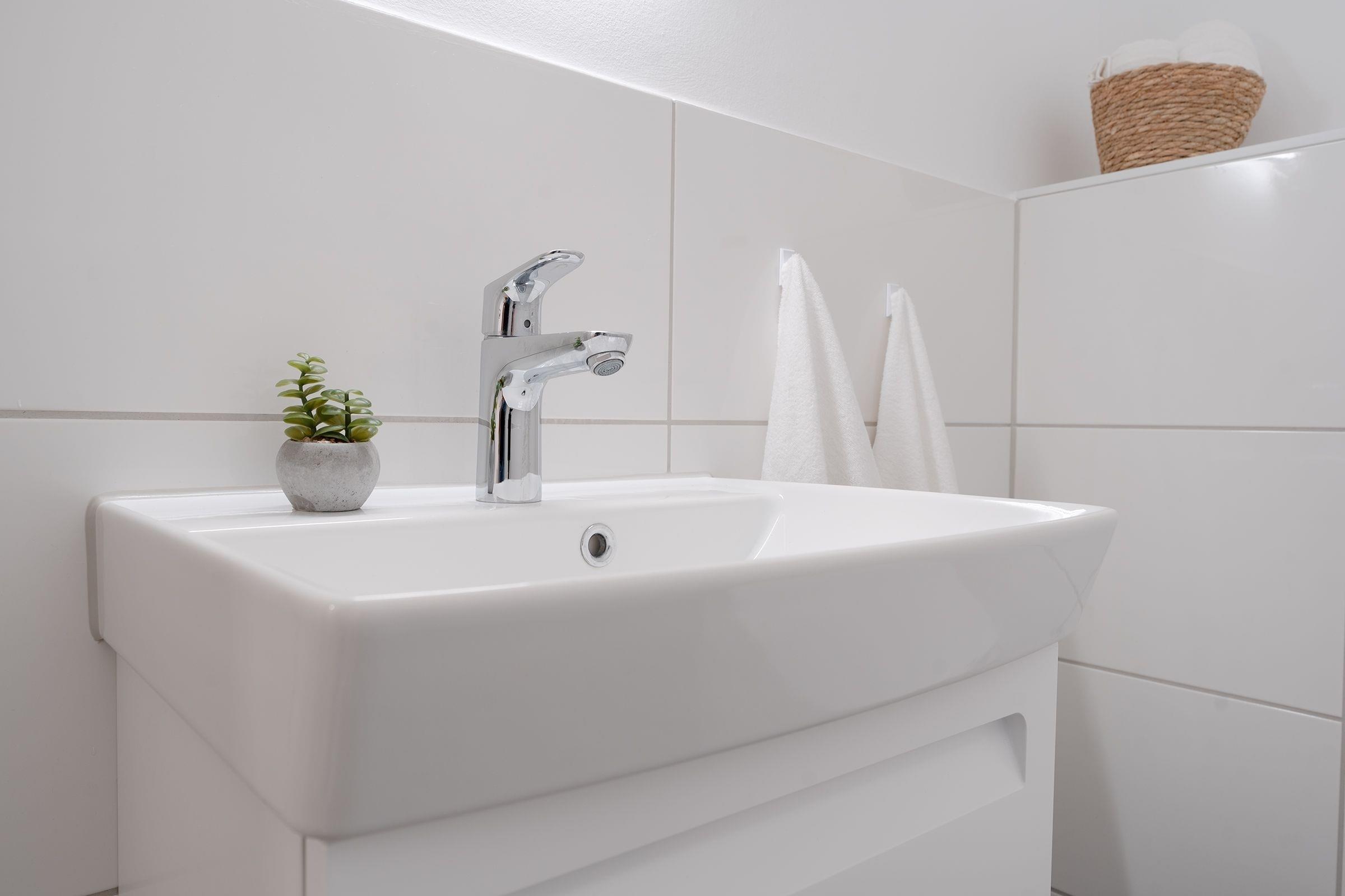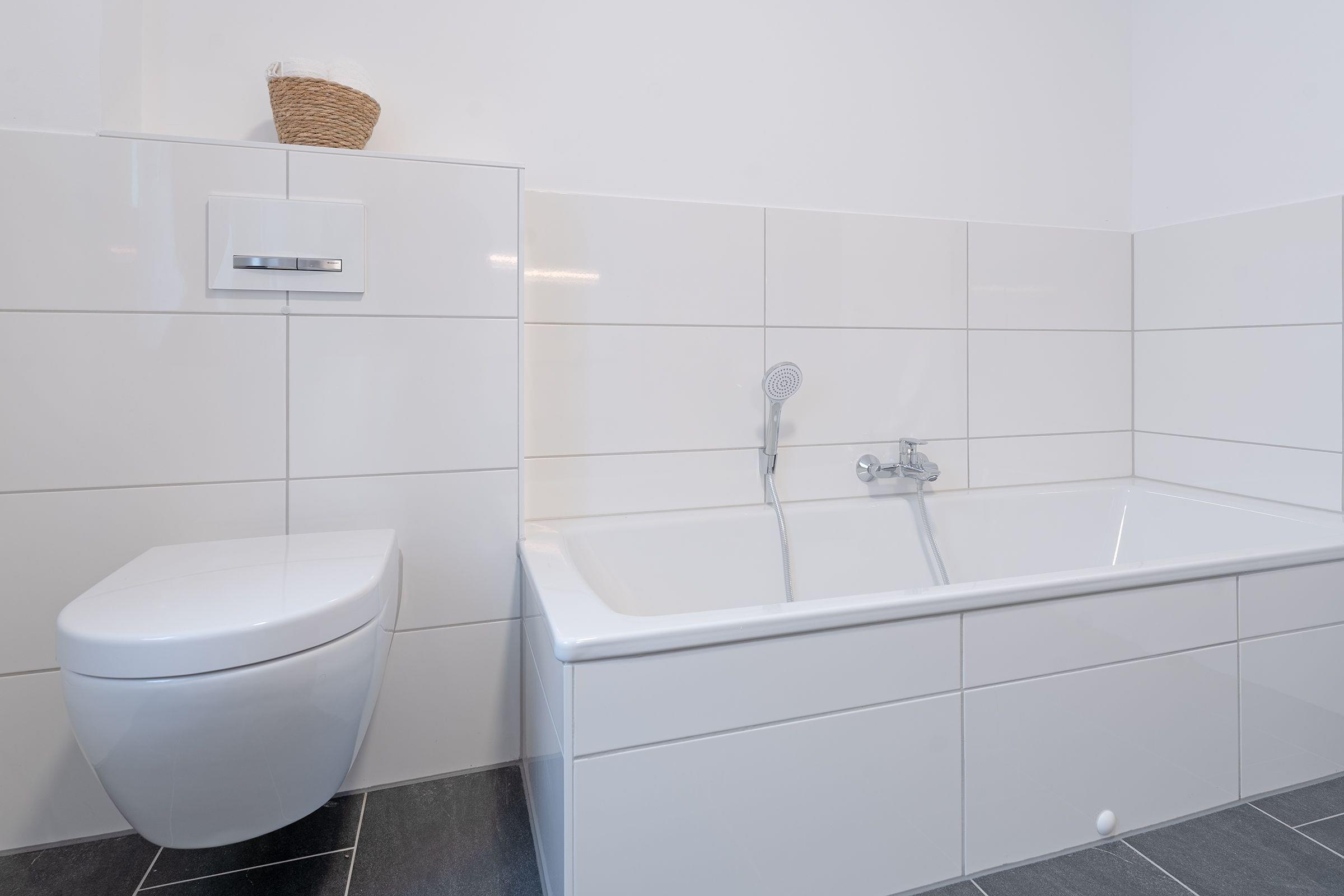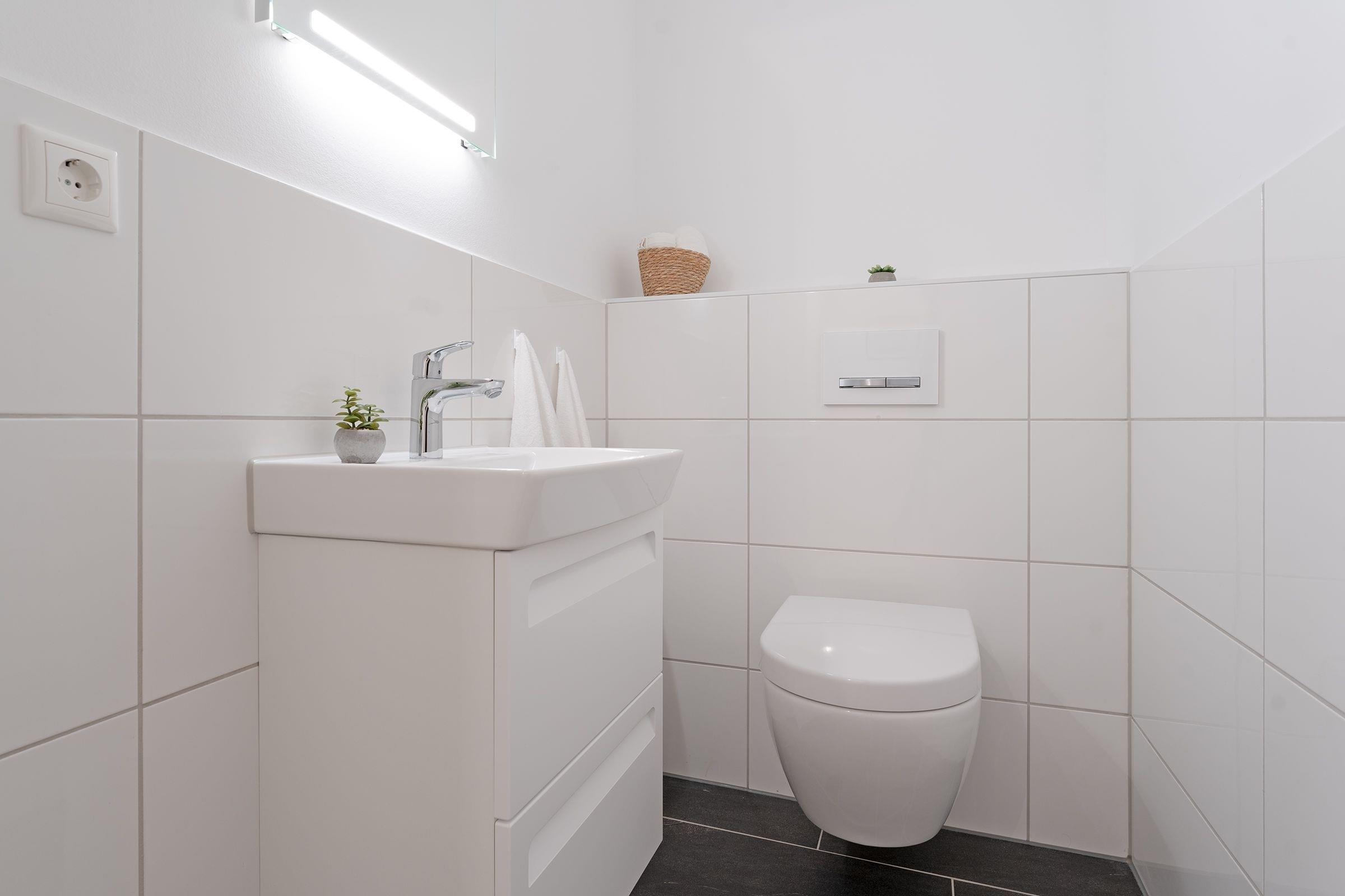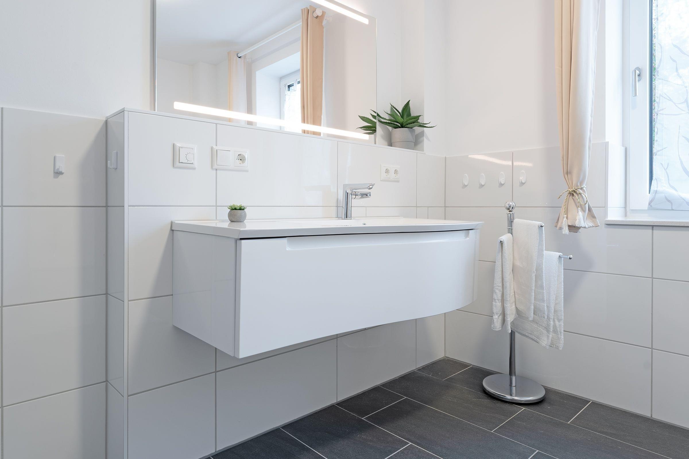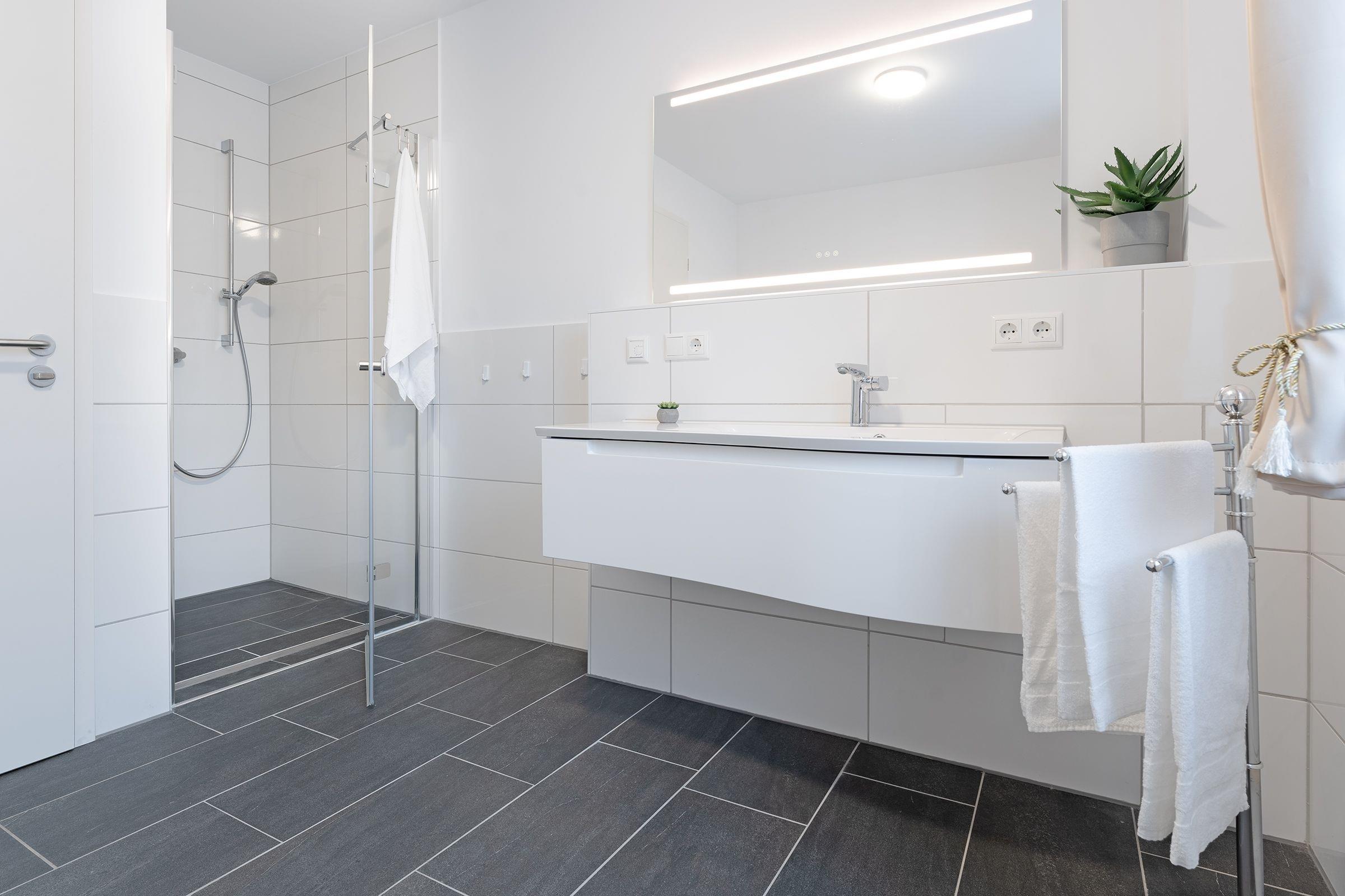 Das Badezimmer ist modern und mit einer bodengleichen Dusche, Fußbodenheizung und einem Haartrockner ausgestattet. Zusätzlich gibt es ein Gäste-WC.