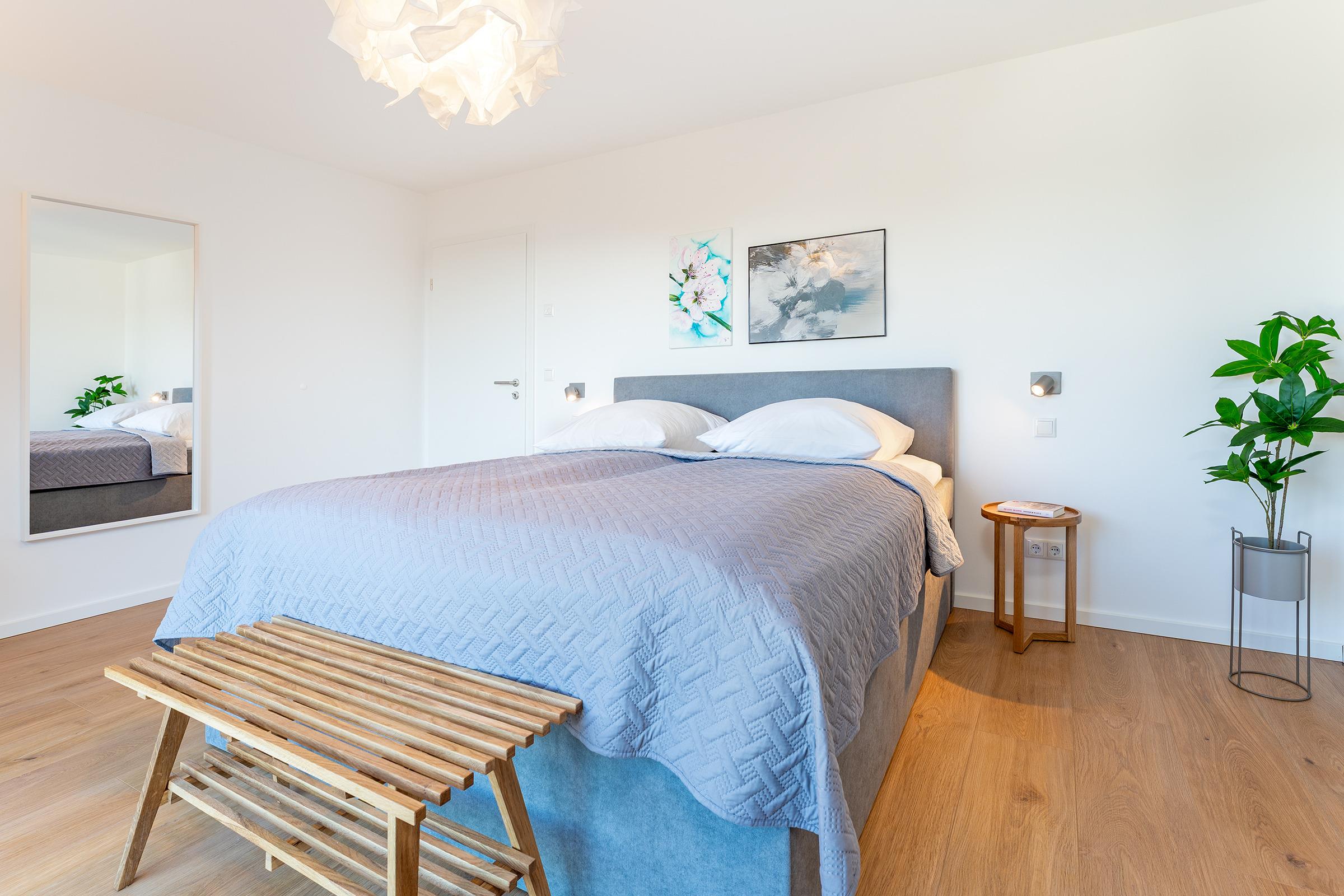 Die offene Küche ist hochwertig ausgestattet mit Backofen, Geschirrspüler, Ceran-Kochfeld, Kühlschrank sowie praktischen Extras wie einer Nespresso-Kapselmaschine. Der angrenzende Essbereich mit großem Tisch bietet reichlich Platz für gemeinsame Mahlzeiten in geselliger Runde. Drei geschmackvoll eingerichtete Schlafzimmer, ausgestattet mit komfortablen Doppelbetten, versprechen erholsame Nächte. Das moderne Badezimmer verfügt über Dusche und Duschwanne (Einstiegshöhe 5 cm) sowie Fußbodenheizung. Ein separates Gäste-WC ist ebenfalls vorhanden.