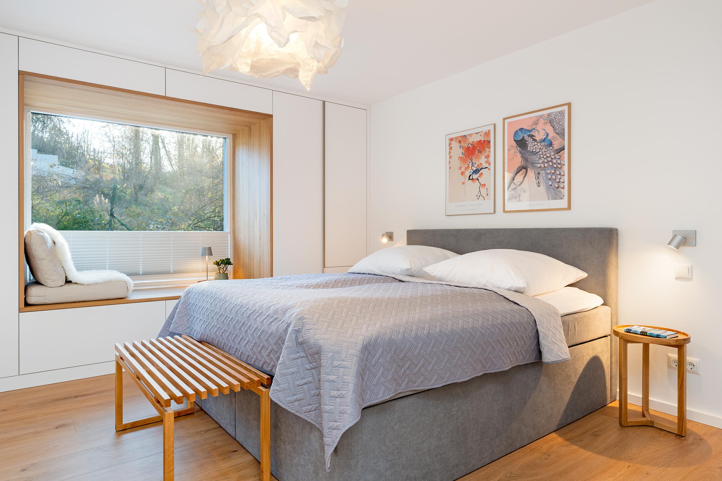 Schlafzimmer 1: 1 Doppelboxspringbett (180x200 cm mit durchgehendem Topper), Kleiderschrank, Verdunkelung: Plissee, Platz für ein Babybett vorhanden