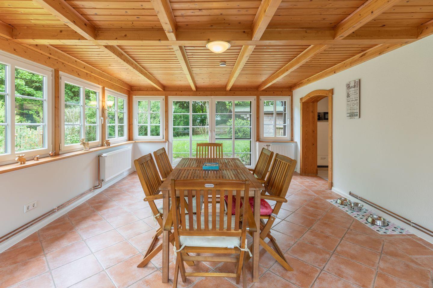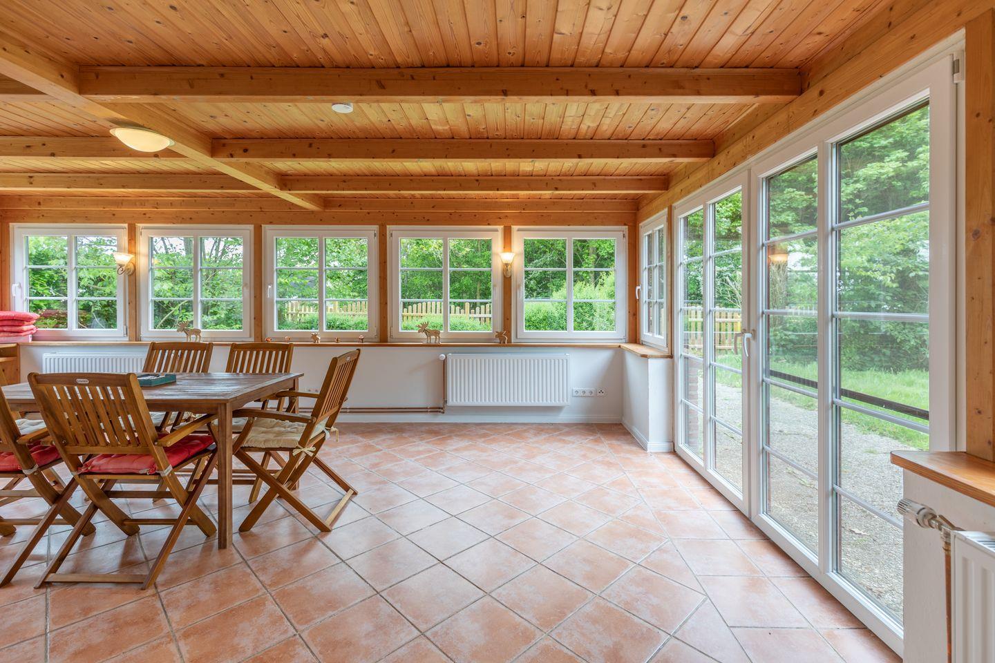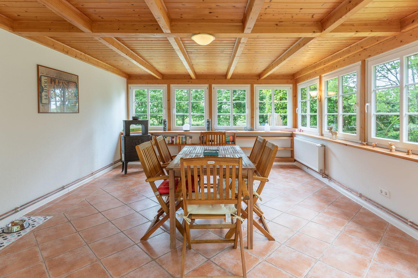 Ein weiteres Highlight ist der lichtdurchflutete Wintergarten, der einen Blick auf die umliegende Landschaft bietet und sich ideal als Rückzugsort eignet. Der gepflegte Garten mit Gartenmöbeln und einer Liegewiese lädt zum Entspannen im Freien ein. Hier können Sie die frische Luft der ländlichen Umgebung genießen und den Alltag hinter sich lassen.