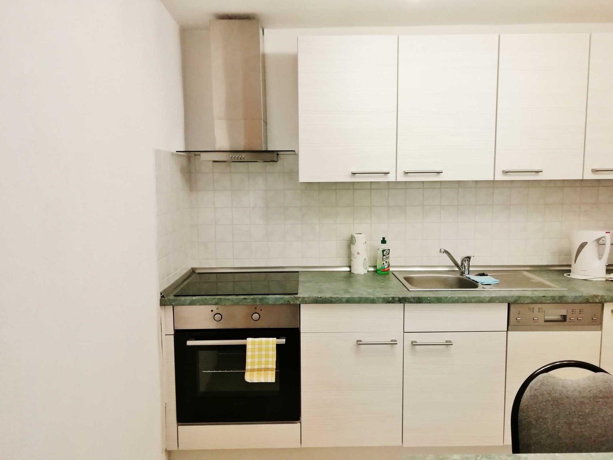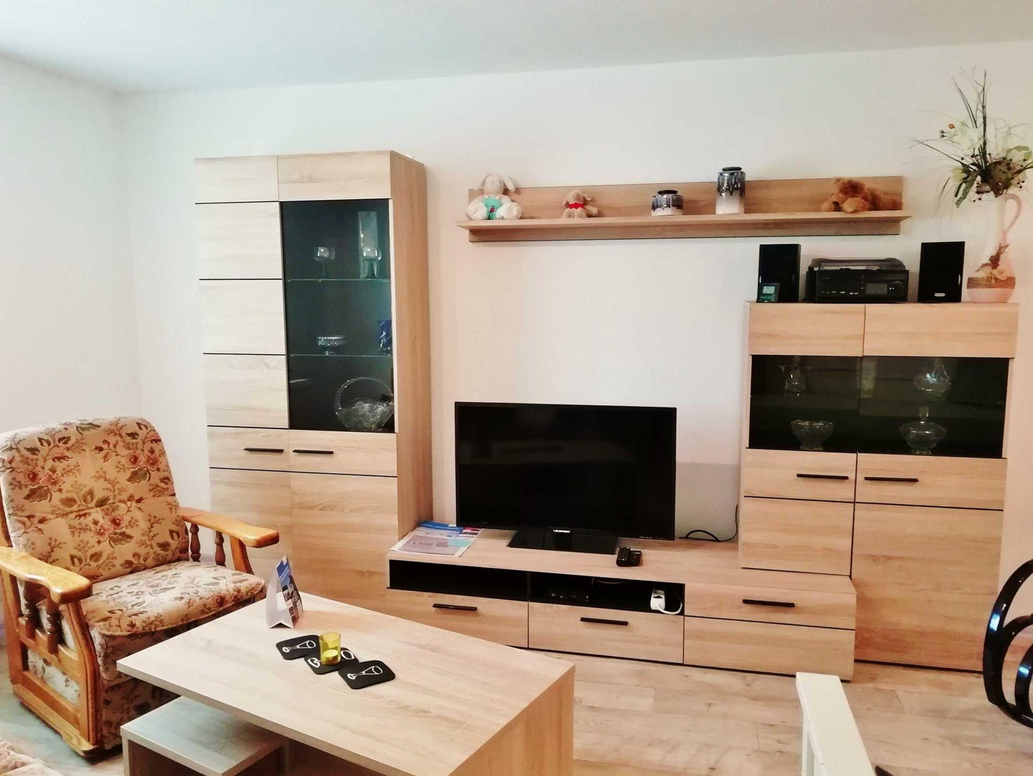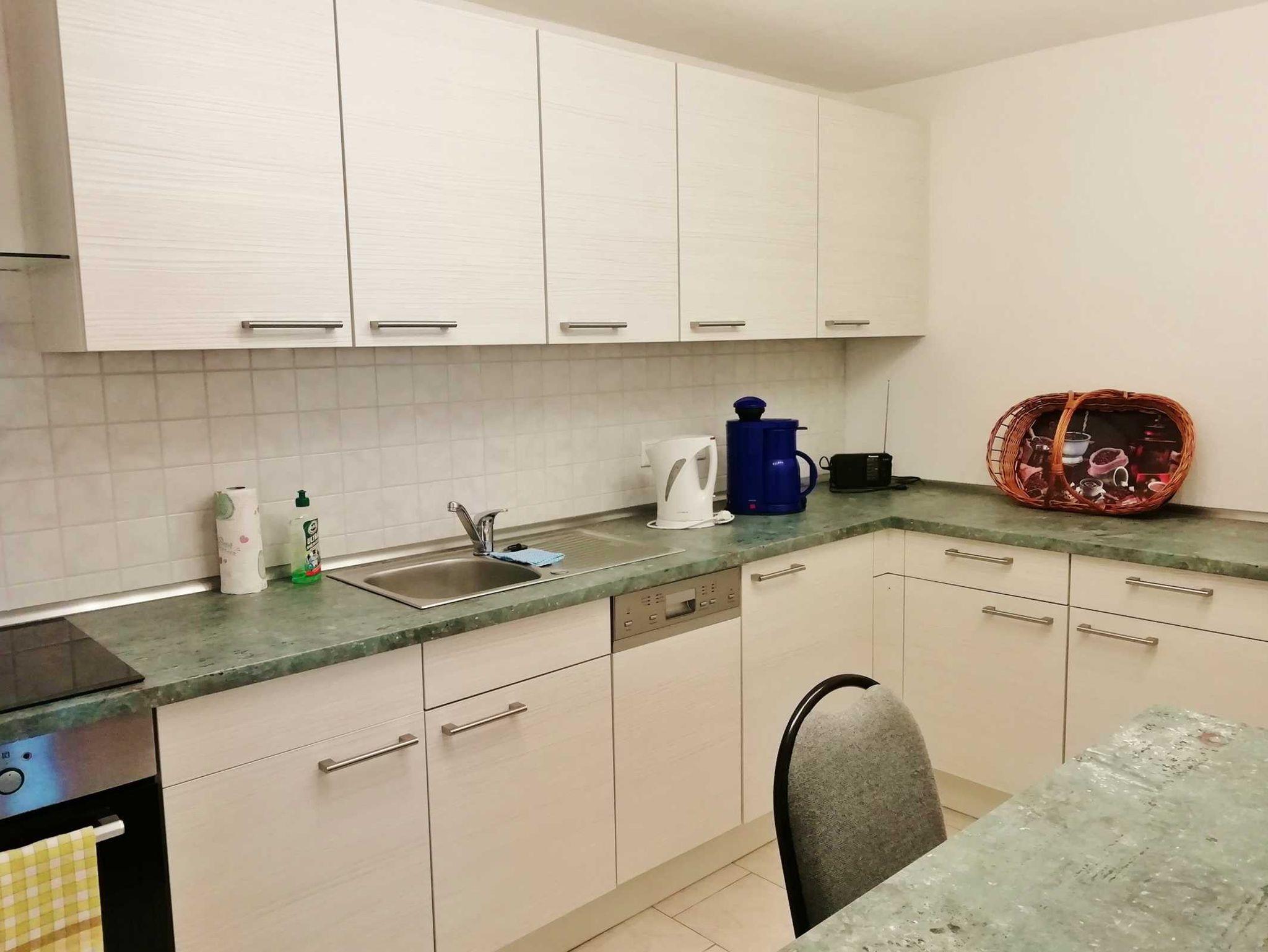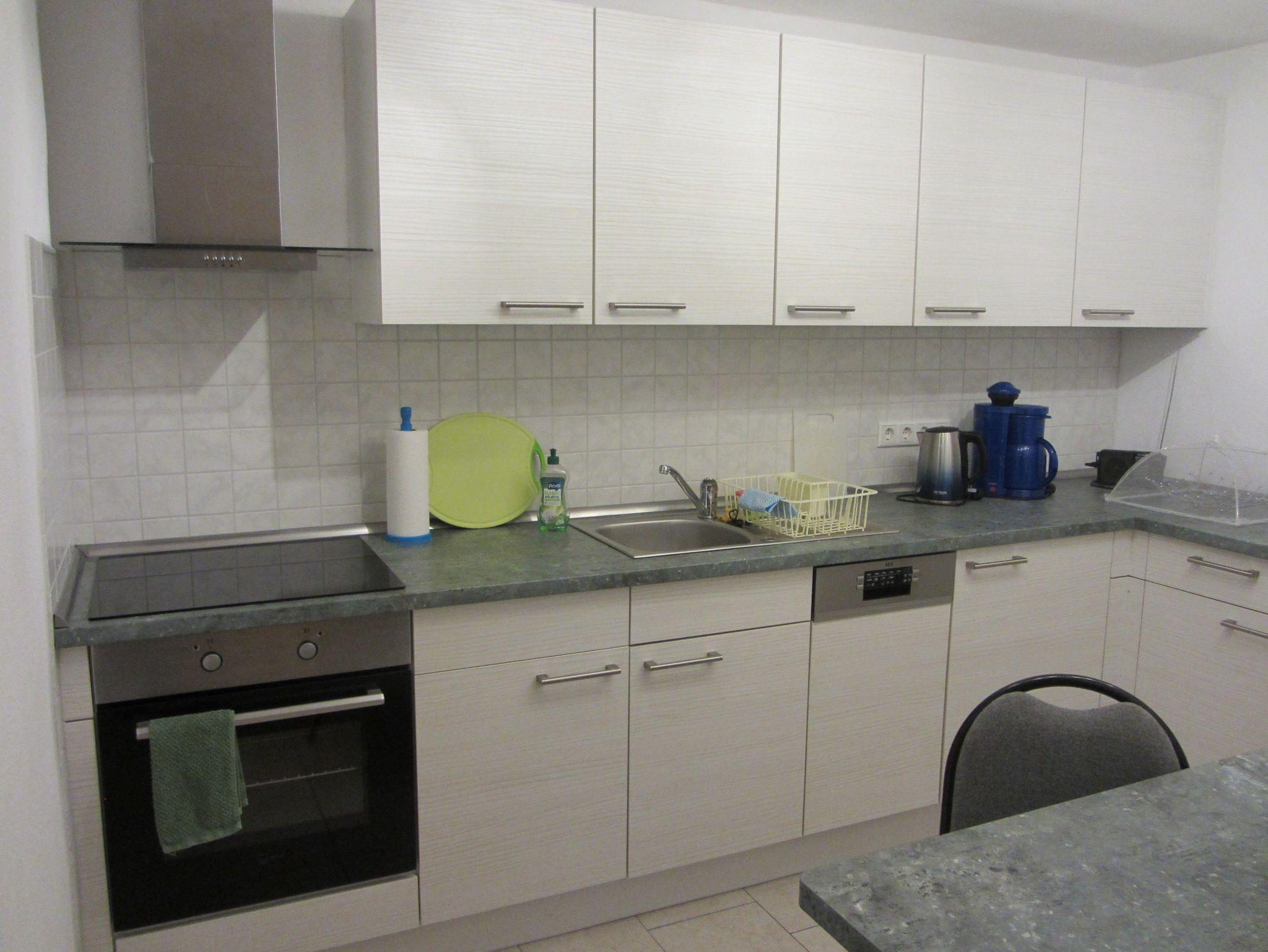Wir bieten Ihnen ein Wohnzimmer (Durchgangszimmer) offen zur Küche und zum separaten Schlafzimmer. Wohnzimmer mit Flachbildschirm, Plattenspieler, Sitzecke und ein Bett. Schlafzimmer mit französischem Bett (1,40m) und Kleiderschrank. Küche mit Küchenzeile, Induktionsherd, Backofen, Mikrowelle, Spüler und Esstisch. Bad mit WC und Badewanne. Handtücher und Bettwäsche vorhanden. Auch ein moderner Waschtrockner steht im Flur zur Verfügung.