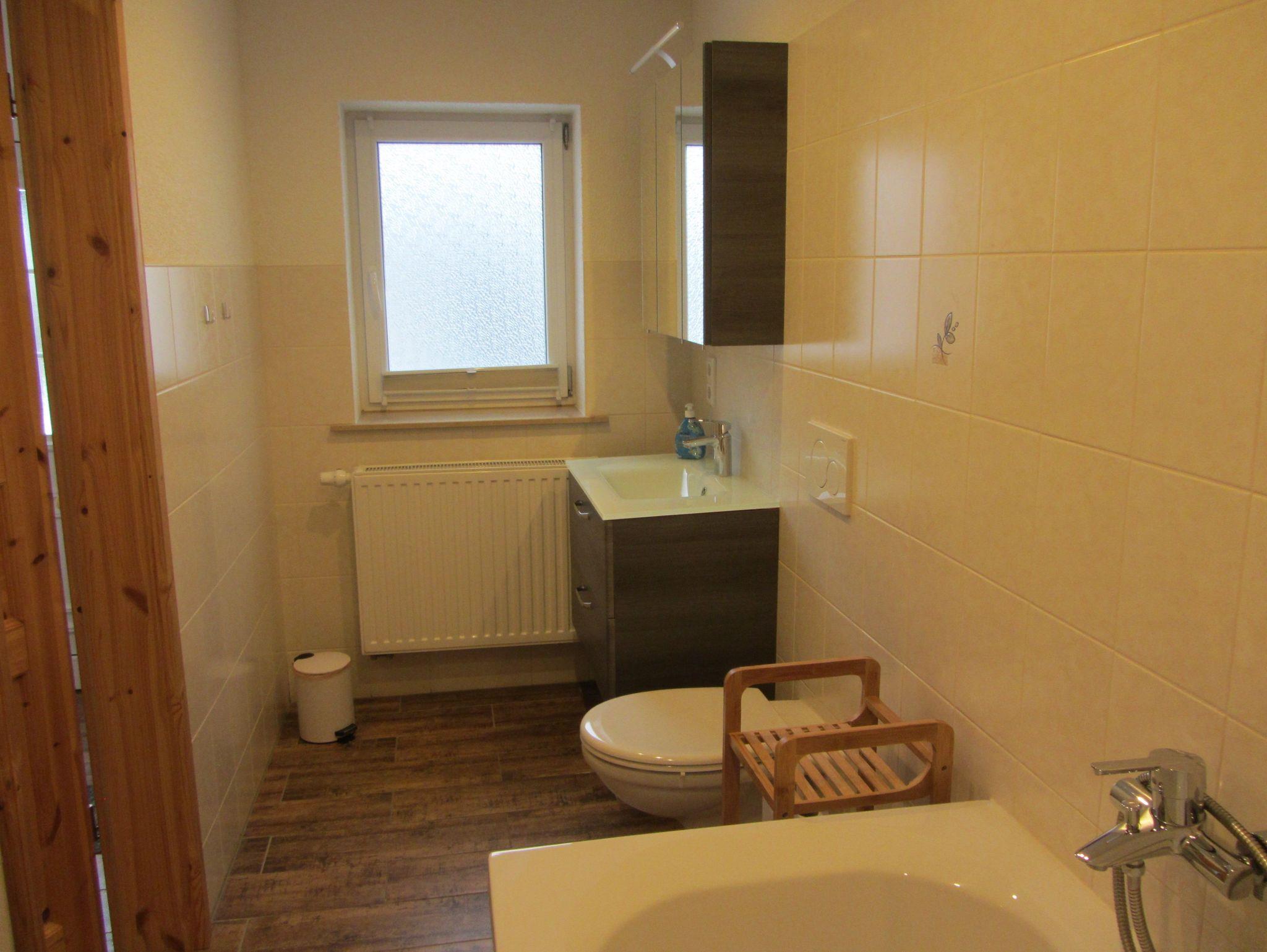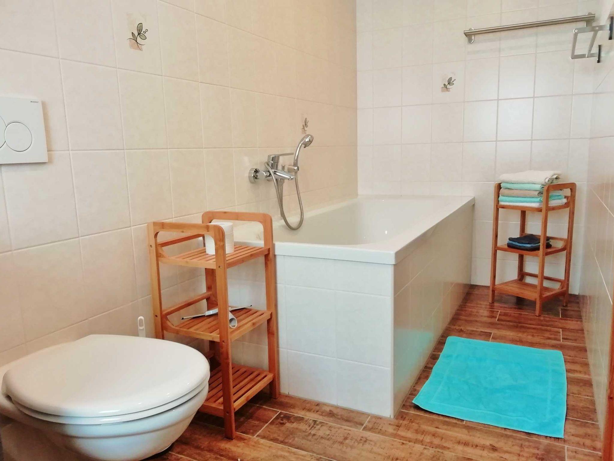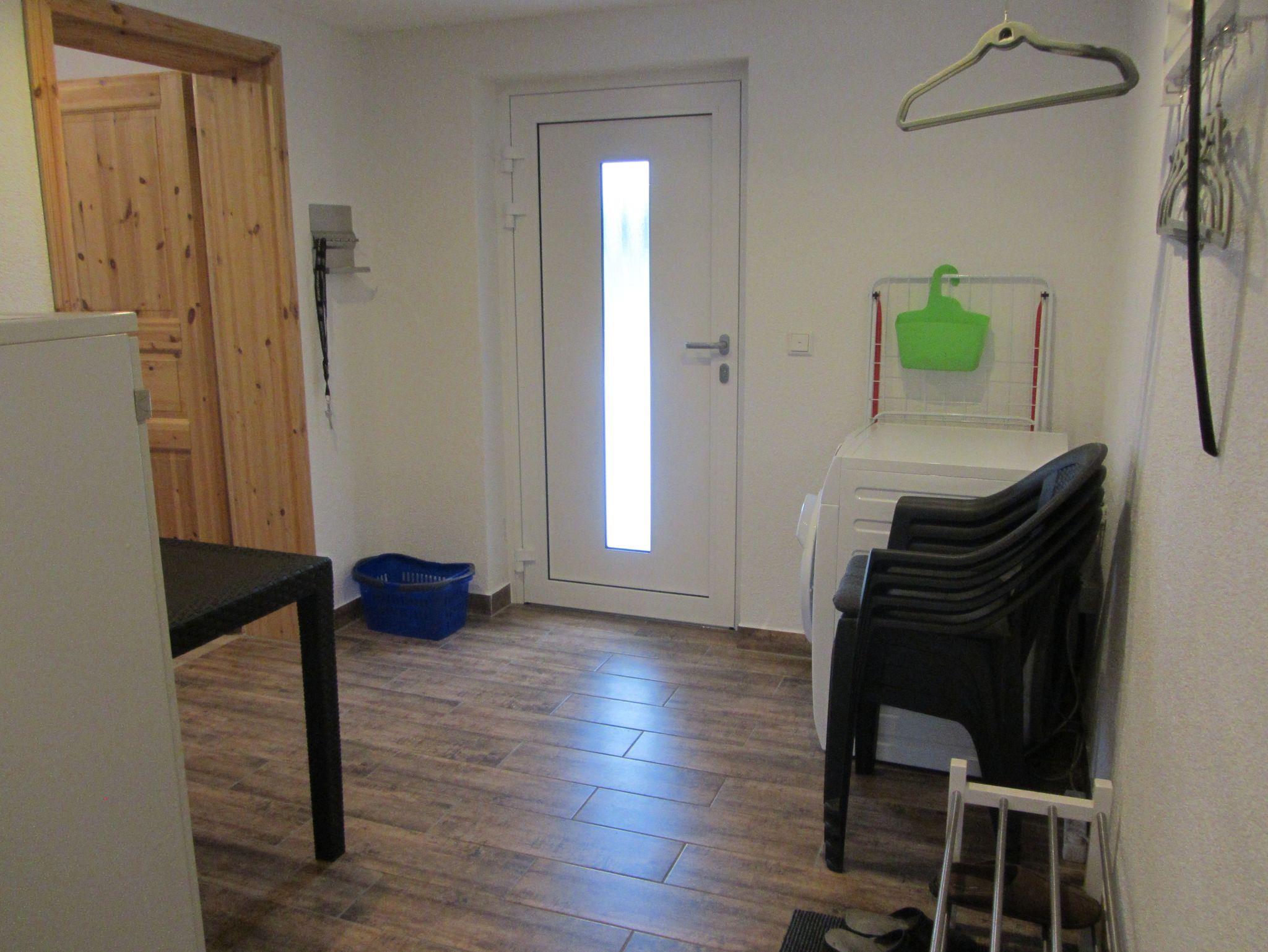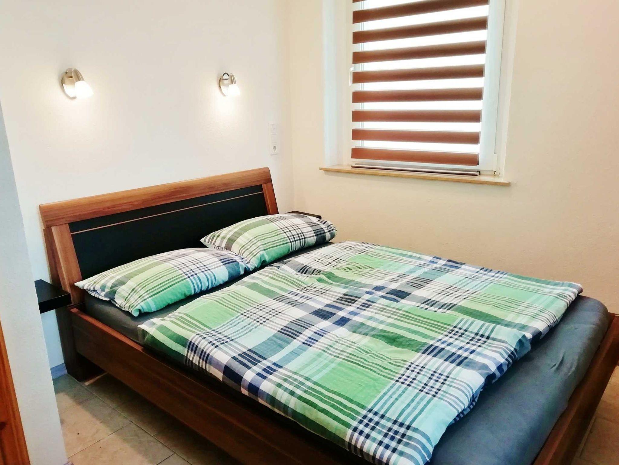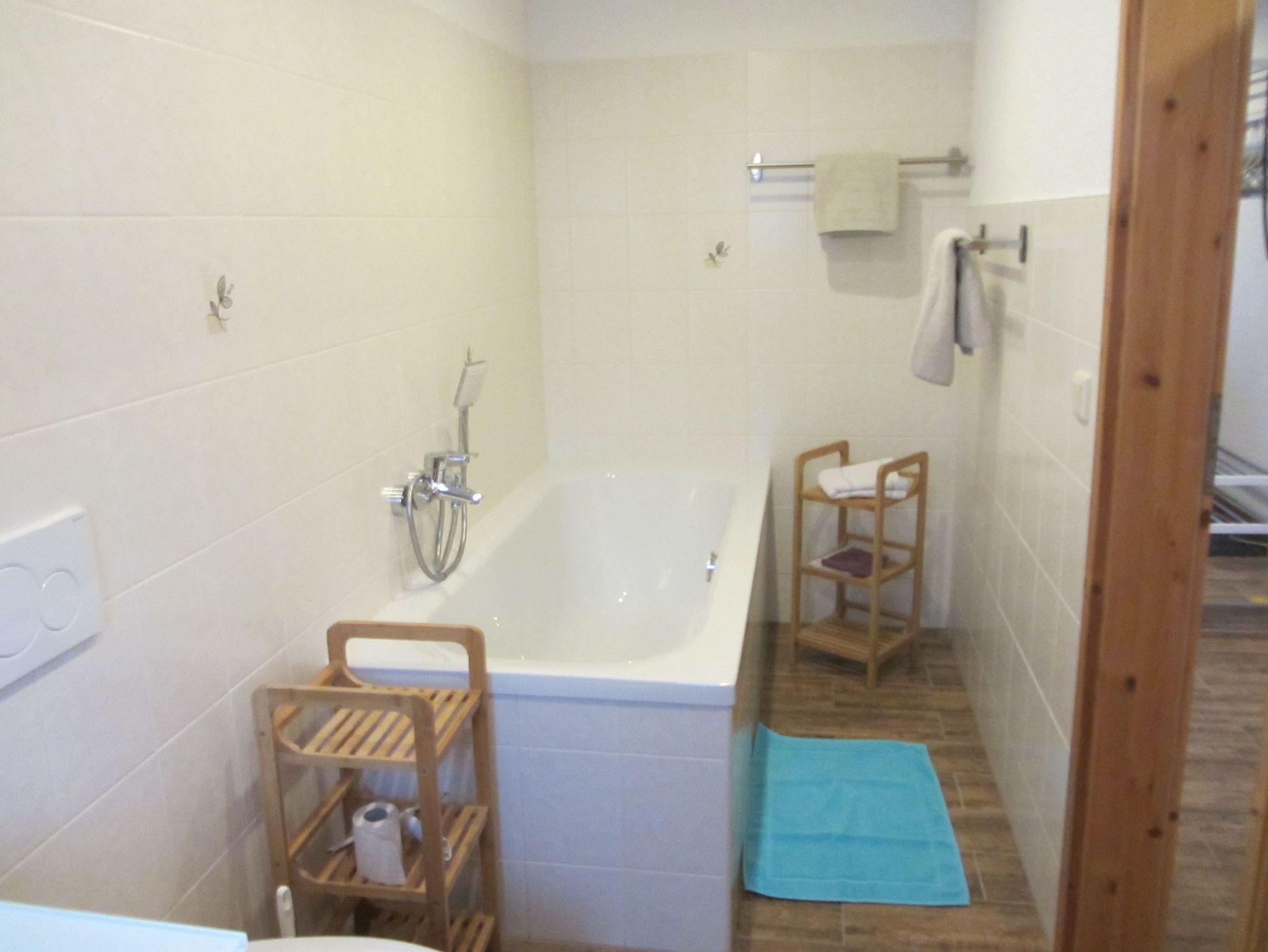 Wir bieten Ihnen ein Wohnzimmer (Durchgangszimmer) offen zur Küche und zum separaten Schlafzimmer. Wohnzimmer mit Flachbildschirm, Plattenspieler, Sitzecke und ein Bett. Schlafzimmer mit französischem Bett (1,40m) und Kleiderschrank. Küche mit Küchenzeile, Induktionsherd, Backofen, Mikrowelle, Spüler und Esstisch. Bad mit WC und Badewanne. Handtücher und Bettwäsche vorhanden. Auch ein moderner Waschtrockner steht im Flur zur Verfügung.