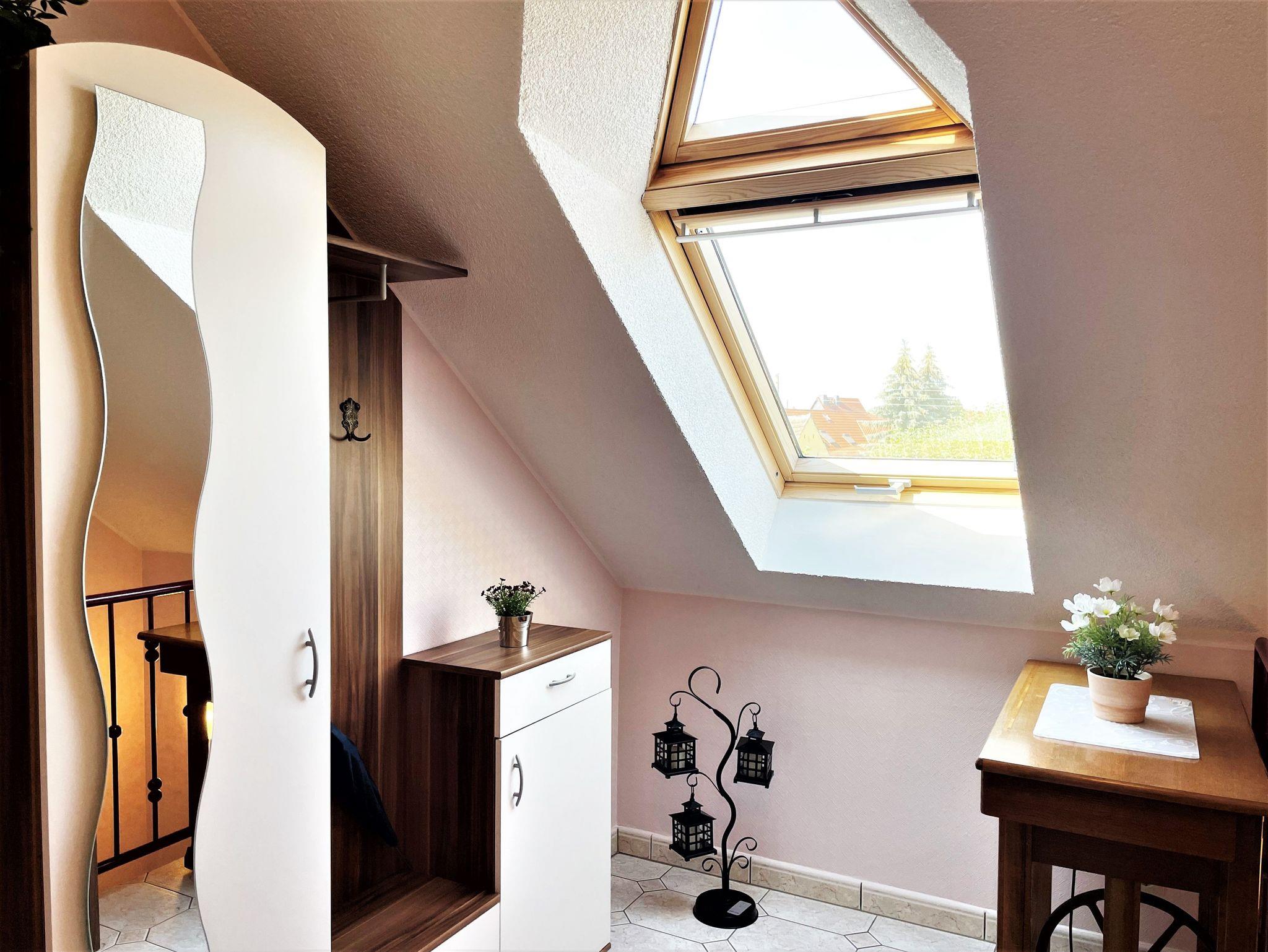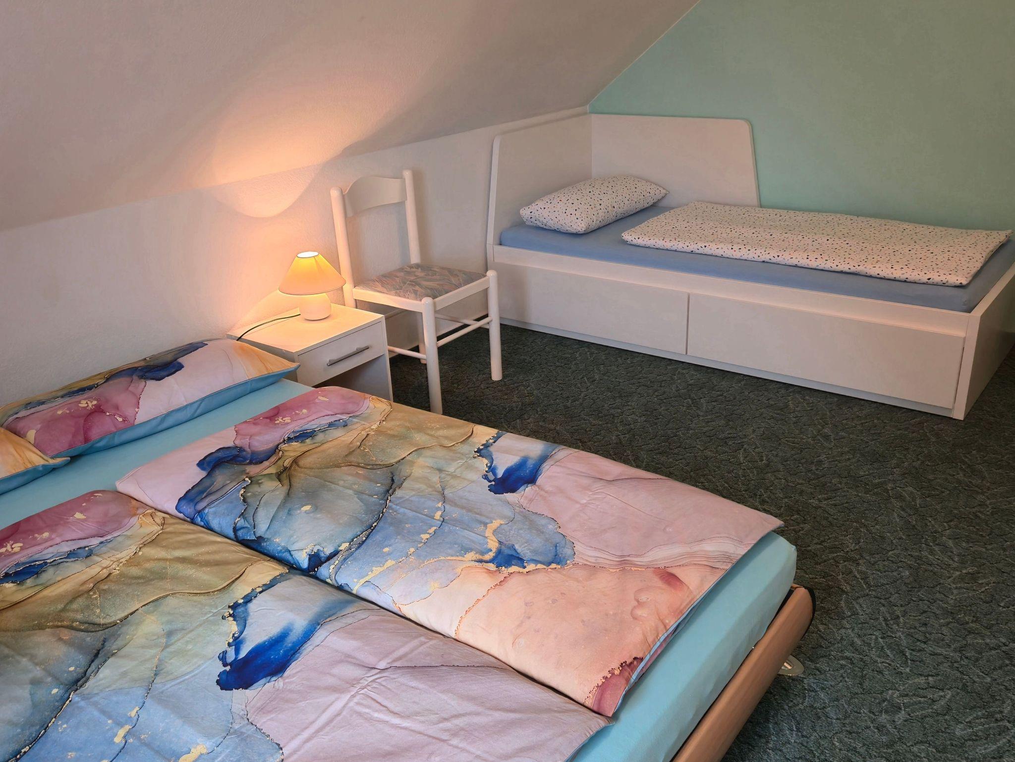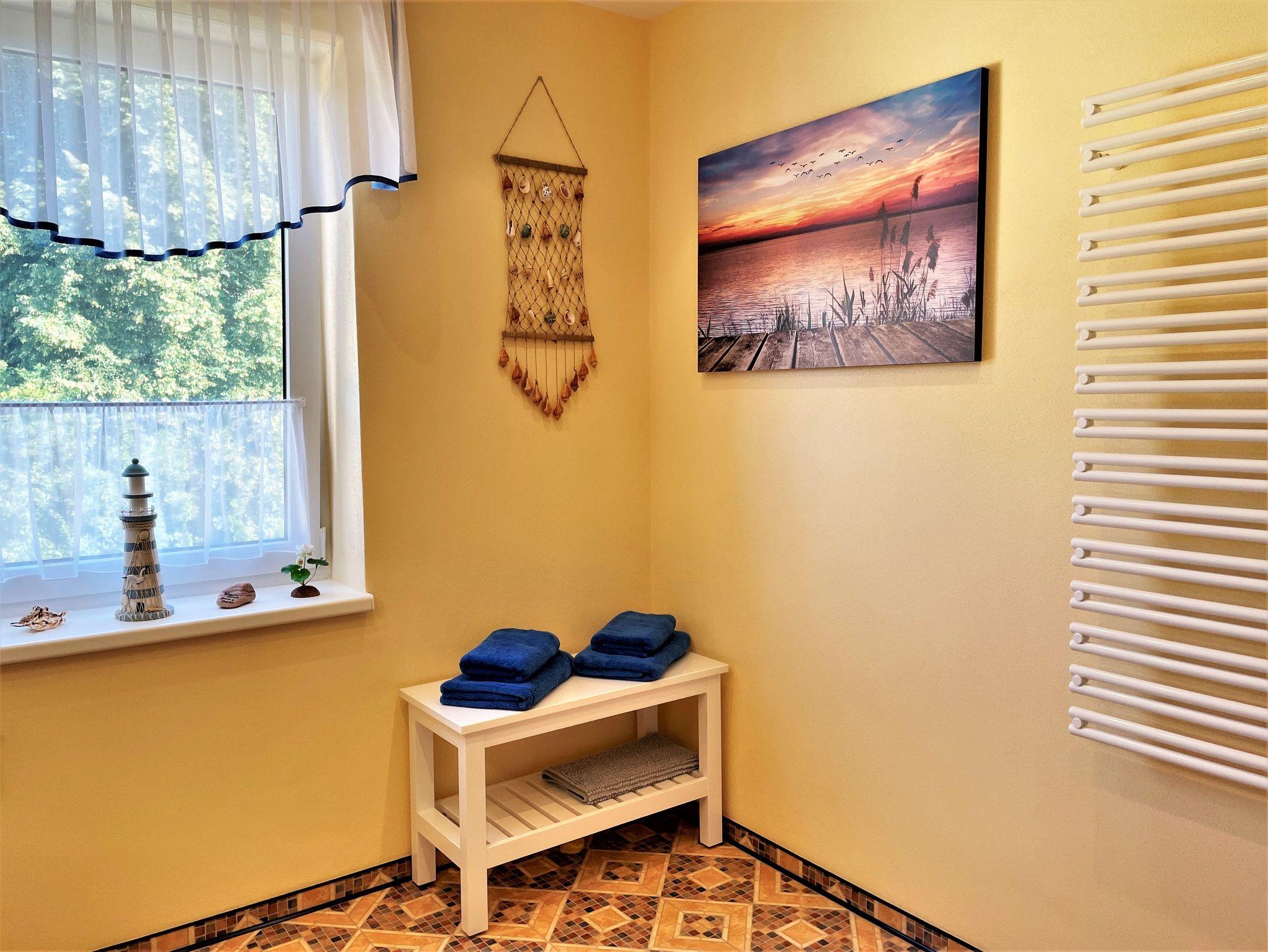 Die 60 m² große Ferienwohnung ist ideal für bis zu 5 Personen geeignet. Auf Anfrage kann ein Babybett und ein Hochstuhl zur Verfügung gestellt werden, so haben auch 6 Personen Platz. Das hell und freundlich eingerichtete Wohnzimmer verfügt über kleine Flachstrecken, Eckcouch und einen TV-Flachbildschirm. Ein im Wohnzimmer stehender Hometrainer darf gern genutzt werden. Auch für die Kleinsten in der Familie ist eine kleine Spielecke vorhanden.