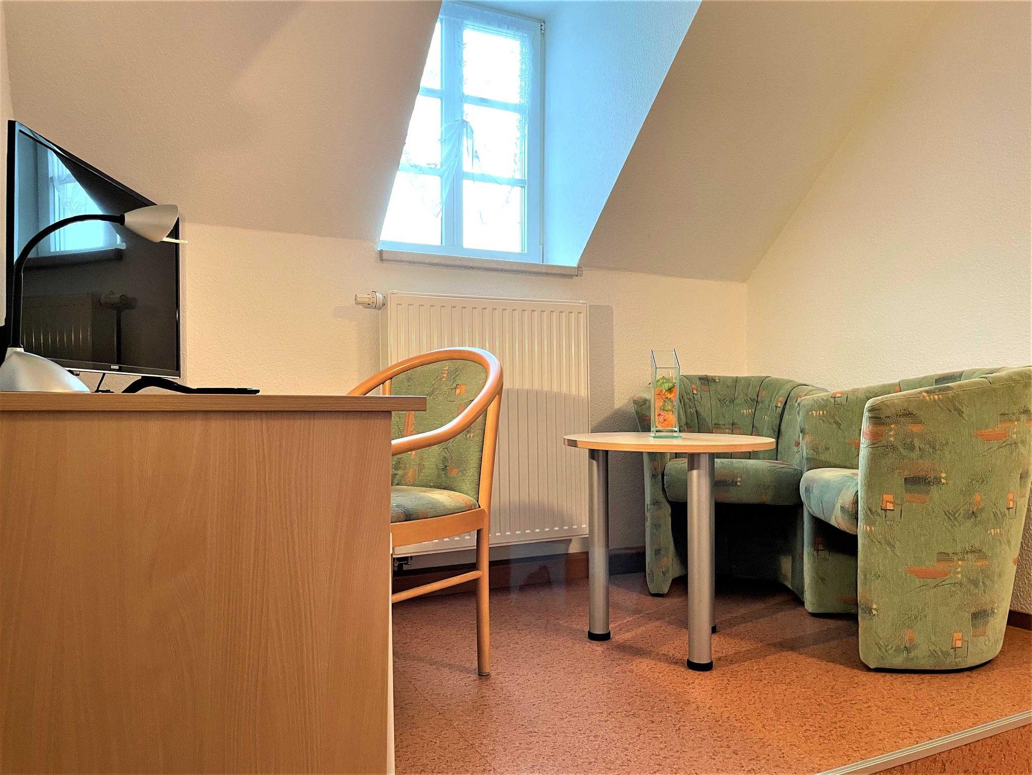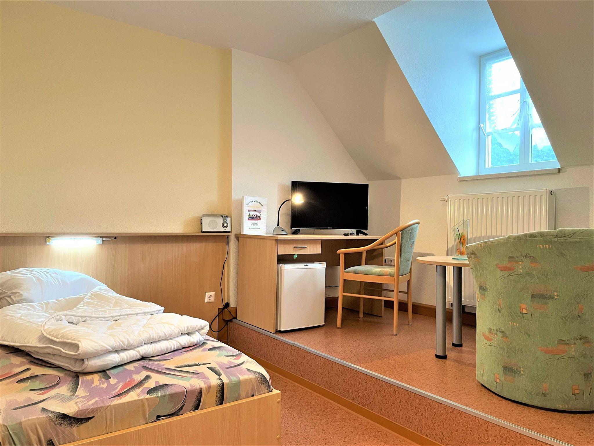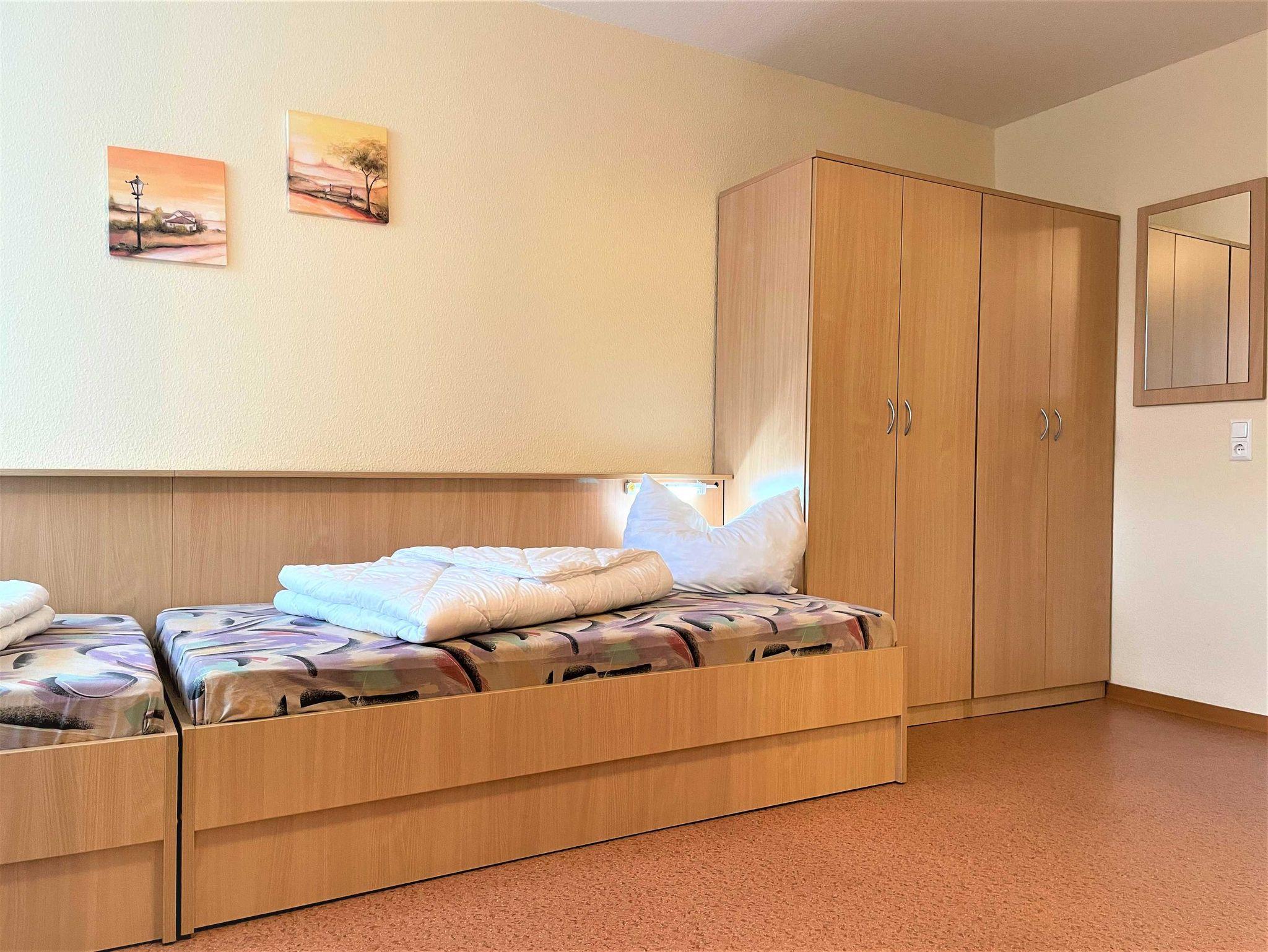 Das Ferienzimmer ist für bis zu 4 Personen geeignet. Es ist mit 2 hintereinander und getrennt stehenden Betten eingerichtet. Ein weiteres Einzelbett ist mit einem integriertem Rollbett ausgestattet und dient für eine 4 Person als Aufbettung. Weiterhin gibt es eine Sitzecke, ausgerüstet mit einem Tischchen und 2 Sessel. Zur Ausstattung gehört ein kleiner Kühlschrank im Zimmer. Für Unterhaltung sorgt ein TV-Flachbildschirm. Ein Bad mit Dusche und WC befindet sich im Zimmer. Auf Anfrage kann ein Frühstück und Bettwäsche gegen eine Gebühr gebucht werden.