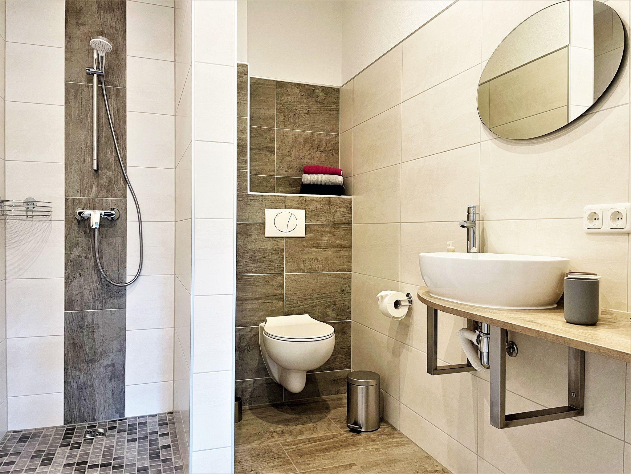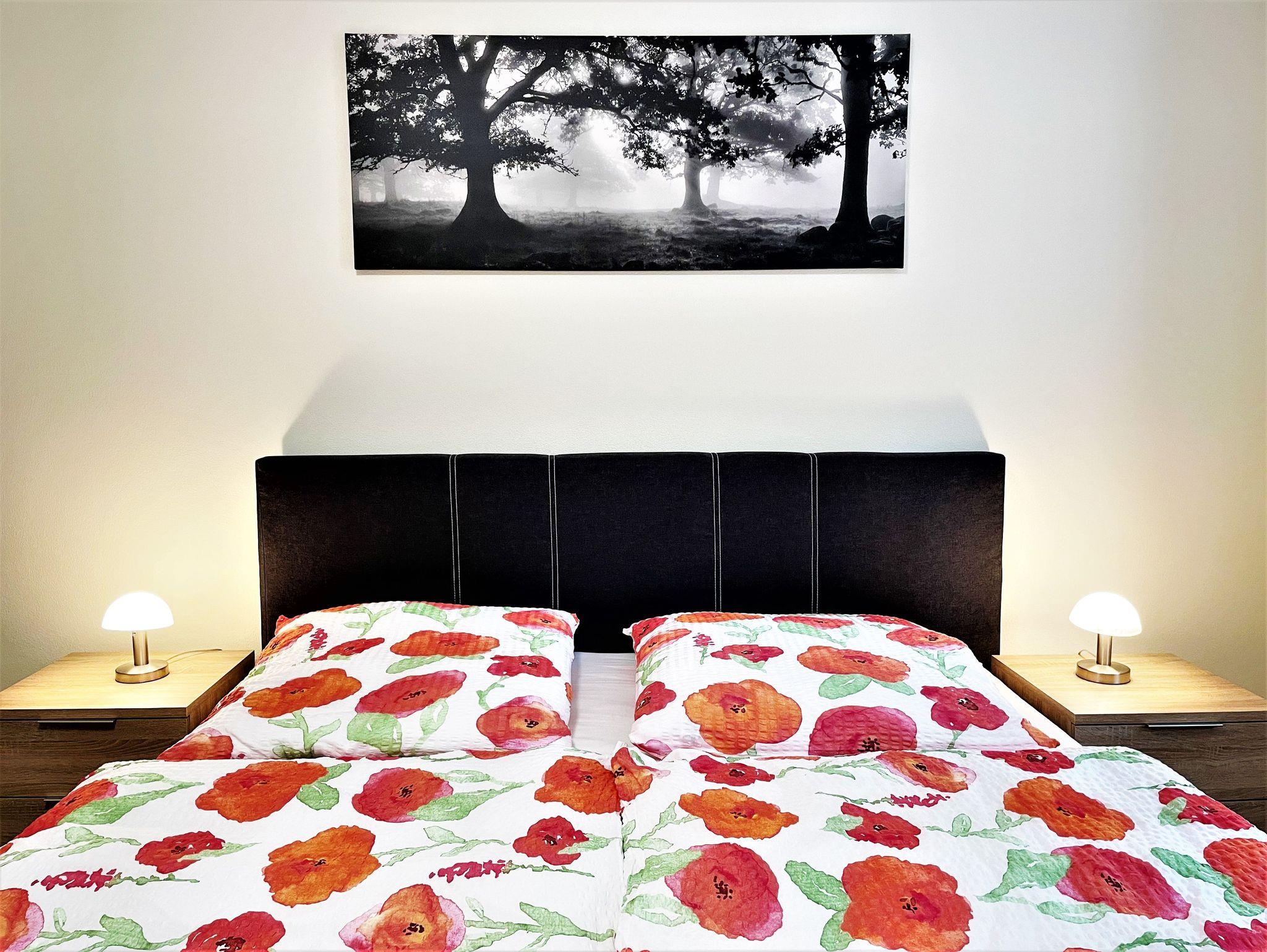 Die helle moderne eingerichtete 57 m² große 3 Raum Ferienwohnung ist für bis zu 6 Personen geeignet. Der große Wohnbereich verfügt über eine offene Küche, diese ist mit Kühlschrank und Gefriermöglichkeit, Geschirrspüler, Mikrowelle und weiteren Annehmlichkeiten ausgerüstet. Weiterhin befinden sich darin ein Esstisch und ein Sofa, welches für eine Aufbettung dient. Ein Schlafzimmer ist mit einem Boxspringbett (1,80 m x 2,00 m) und einem Kleiderschrank möbliert. Im 2. Schlafzimmer stehen 2 getrennt stehende Betten sowie ein Kleiderschrank zur Verfügung. Das stilvolle und moderne Bad ist mit einer ebenerdigen Dusche, WC und einem Waschtisch mit Spiegel ausgestattet. Alle Zimmer verfügen über Fußbodenheizung und großen TV-Flachbildschirm.