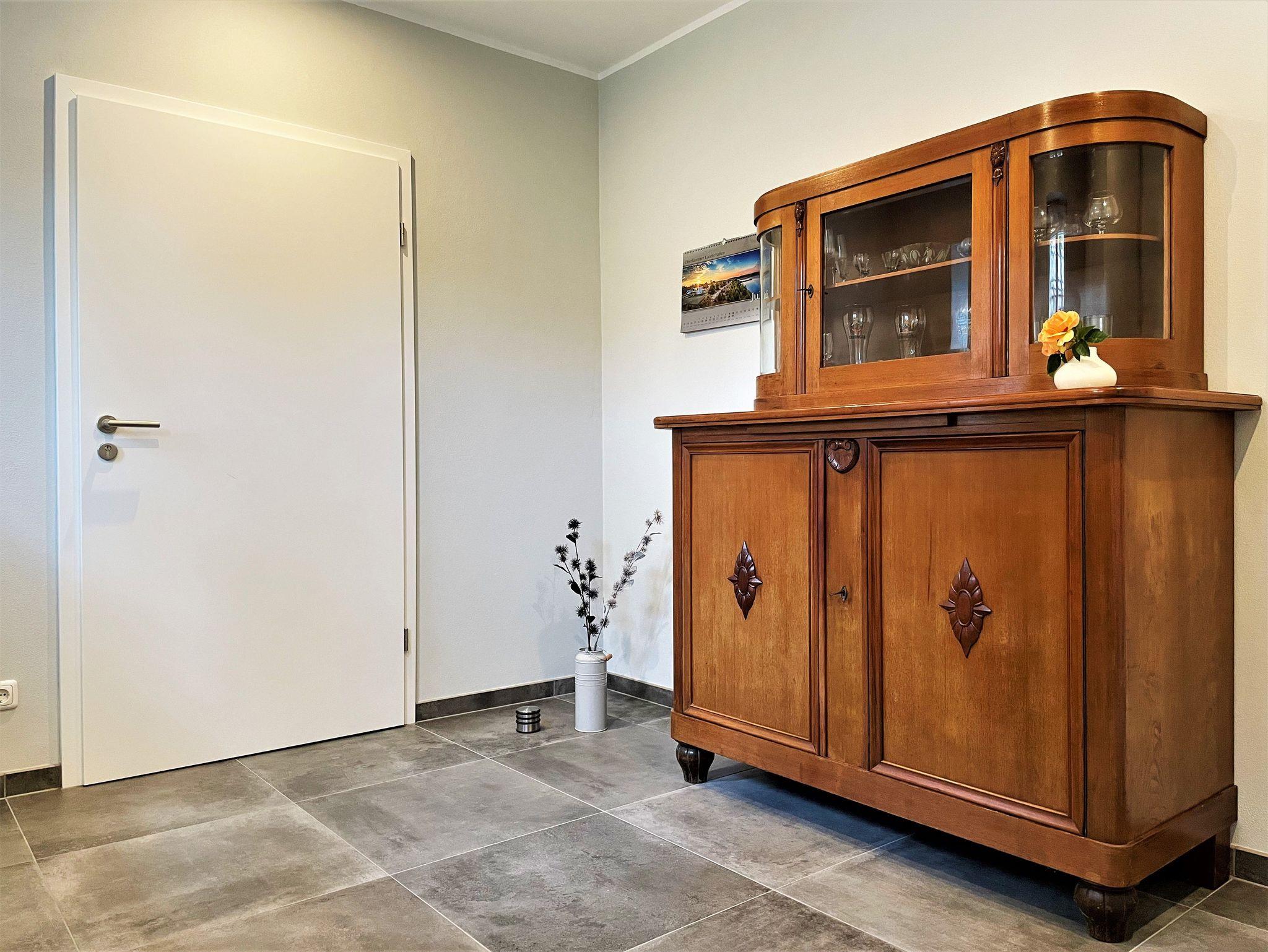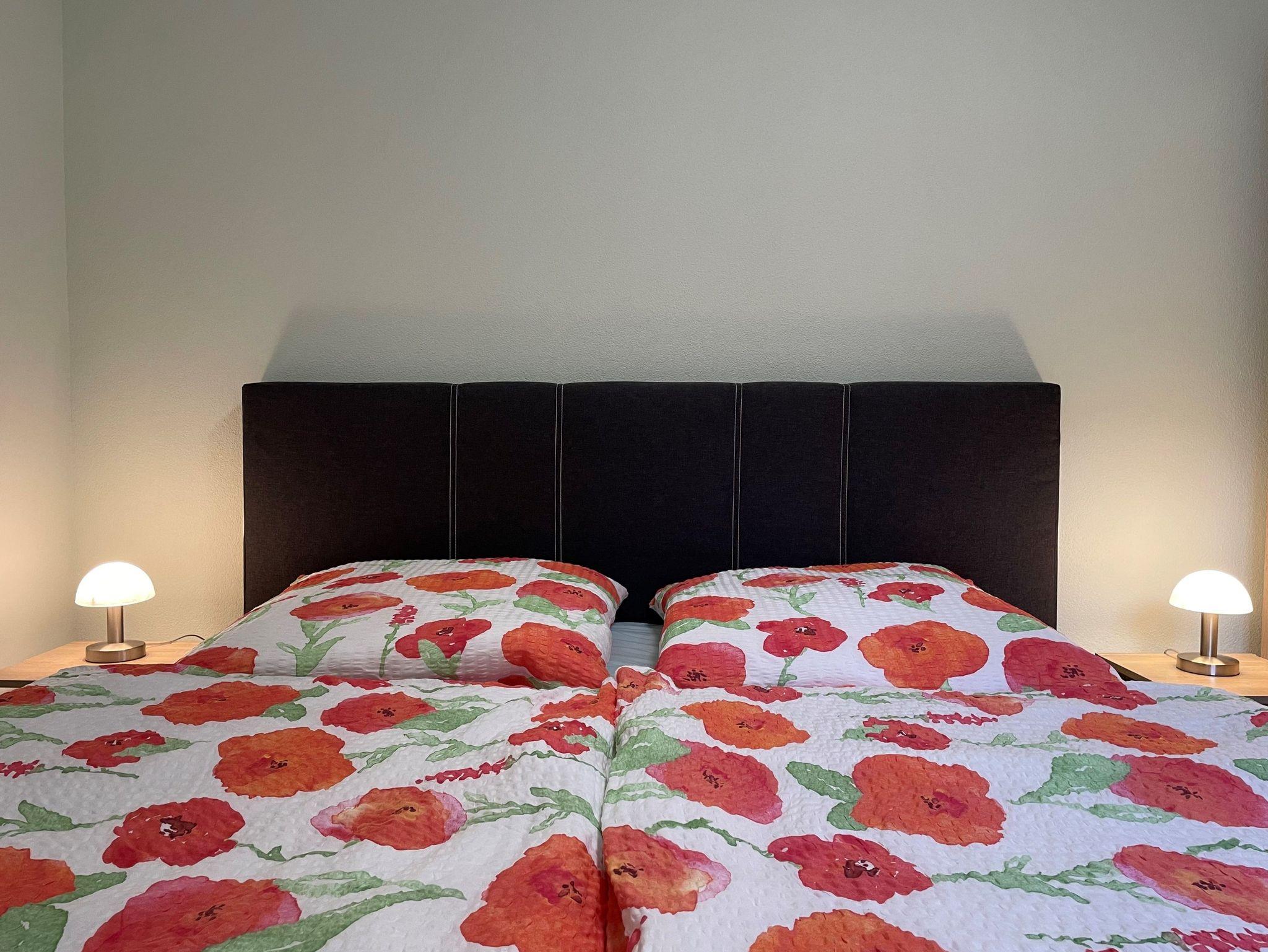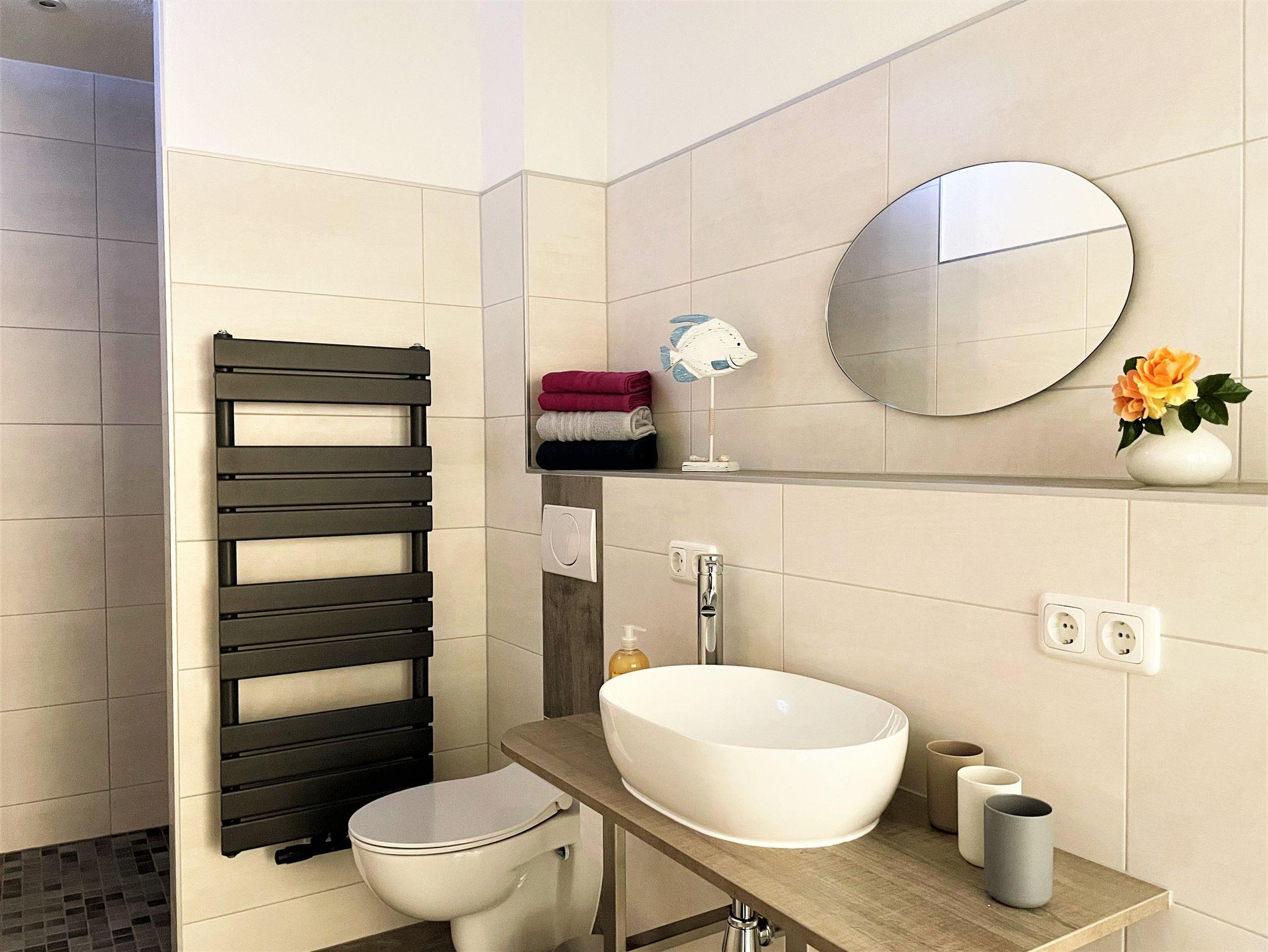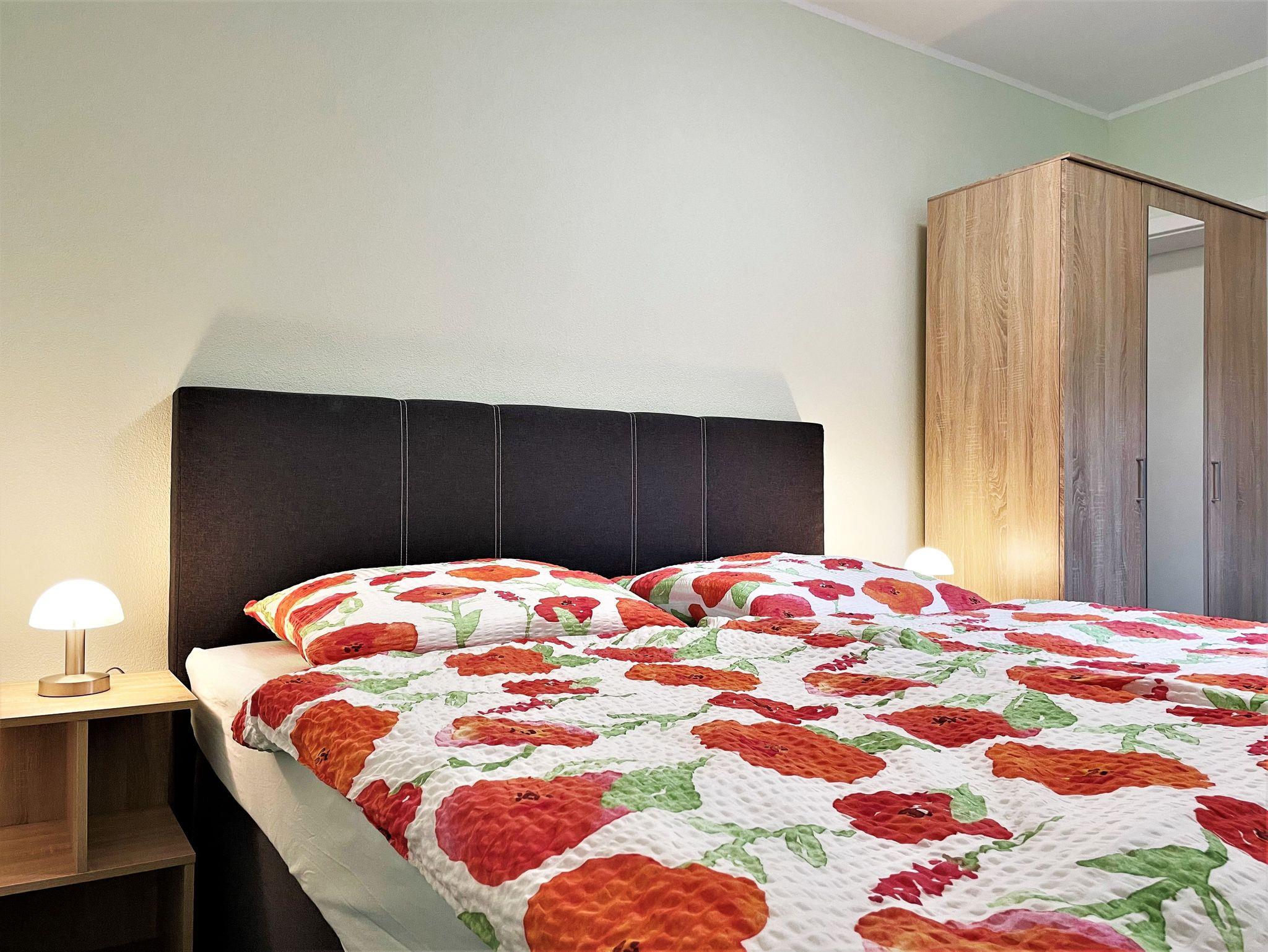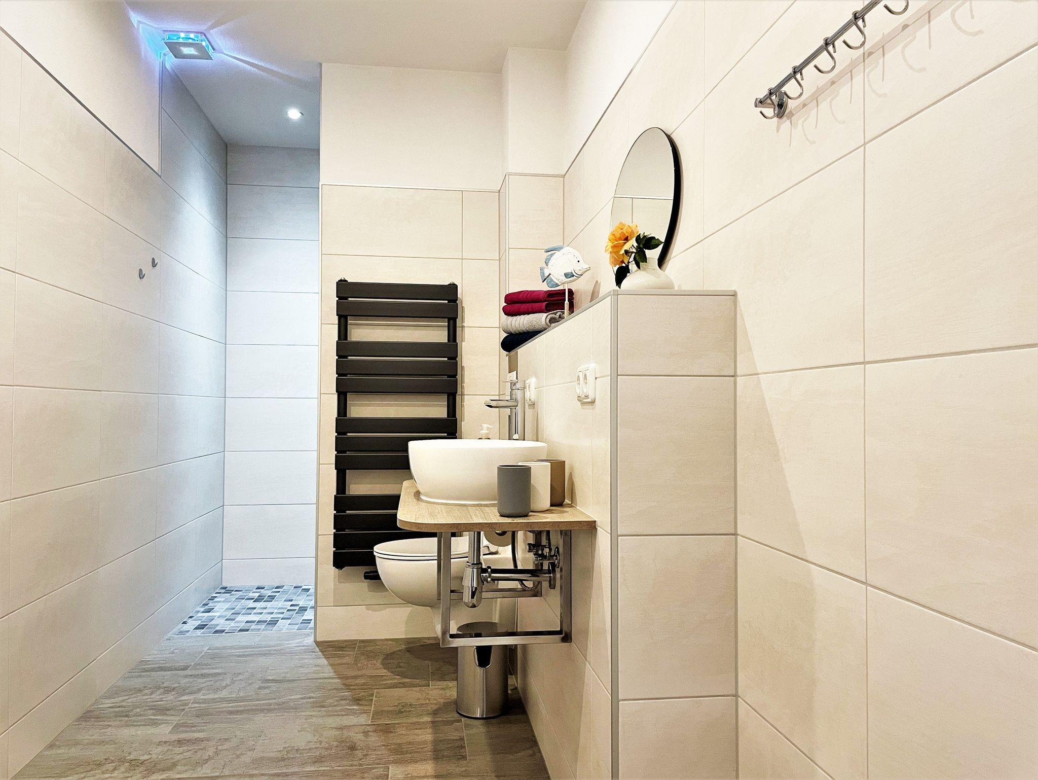 Die helle moderne eingerichtete 69 m² große 3 Raum Ferienwohnung ist für bis zu 6 Personen geeignet. Der große Wohnbereich verfügt über eine offene Küche, diese ist mit Kühlschrank und Gefriermöglichkeit, Geschirrspüler, Mikrowelle und weiteren Annehmlichkeiten ausgerüstet. Weiterhin befinden sich darin ein Esstisch und ein Sofa, welches für eine Aufbettung dient. Ein Schlafzimmer ist mit einem Boxspringbett (1,80 m x 2,00 m) und einem Kleiderschrank möbliert. Im 2. Schlafzimmer stehen 2 getrennt stehende Betten sowie ein Kleiderschrank zur Verfügung. Das stilvolle und moderne Bad ist mit einer ebenerdigen Dusche, WC einem Waschtisch mit Spiegel und zusätzlich mit einer Waschmaschine ausgestattet. Alle Zimmer verfügen über Fußbodenheizung und einen großen TV-Flachbildschirm.
