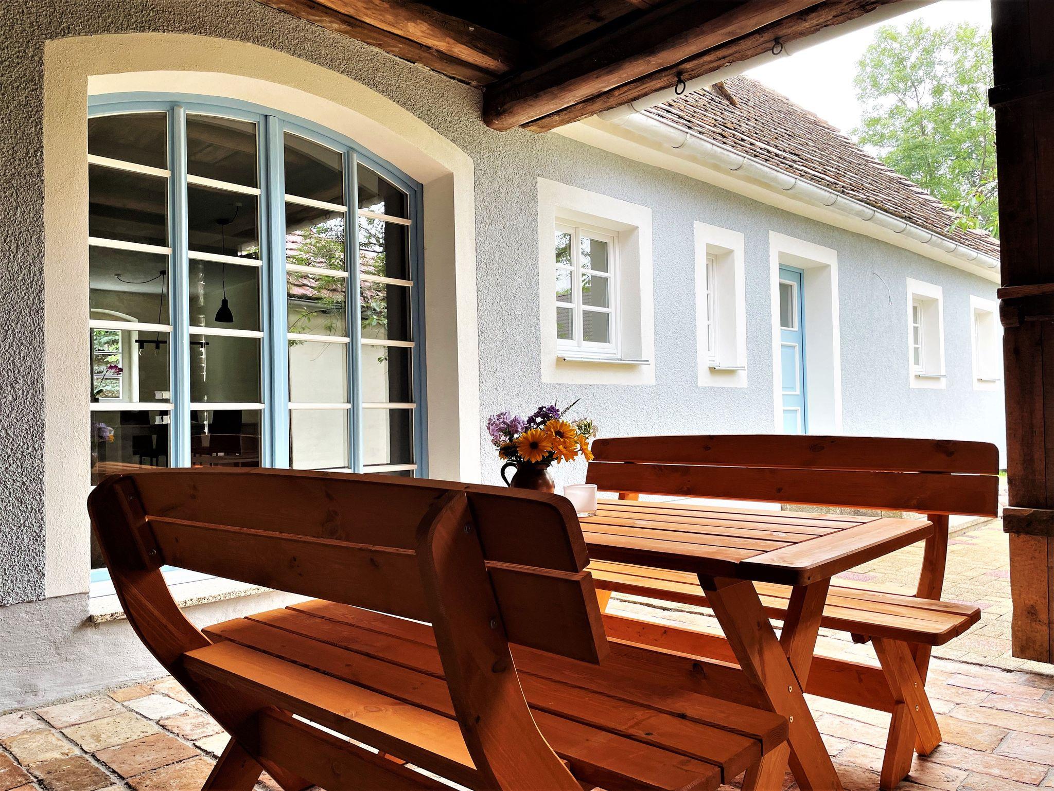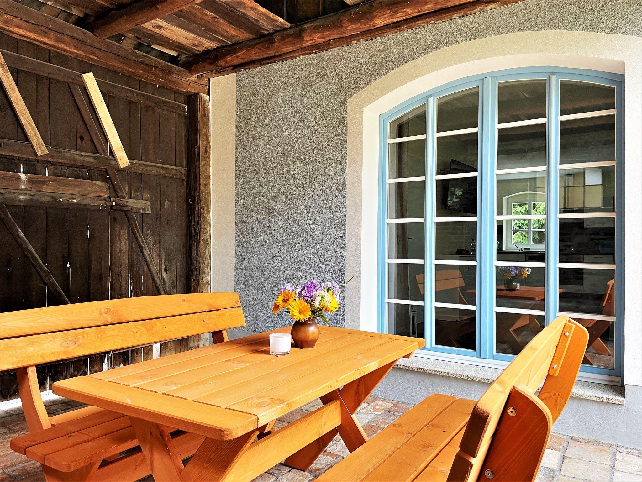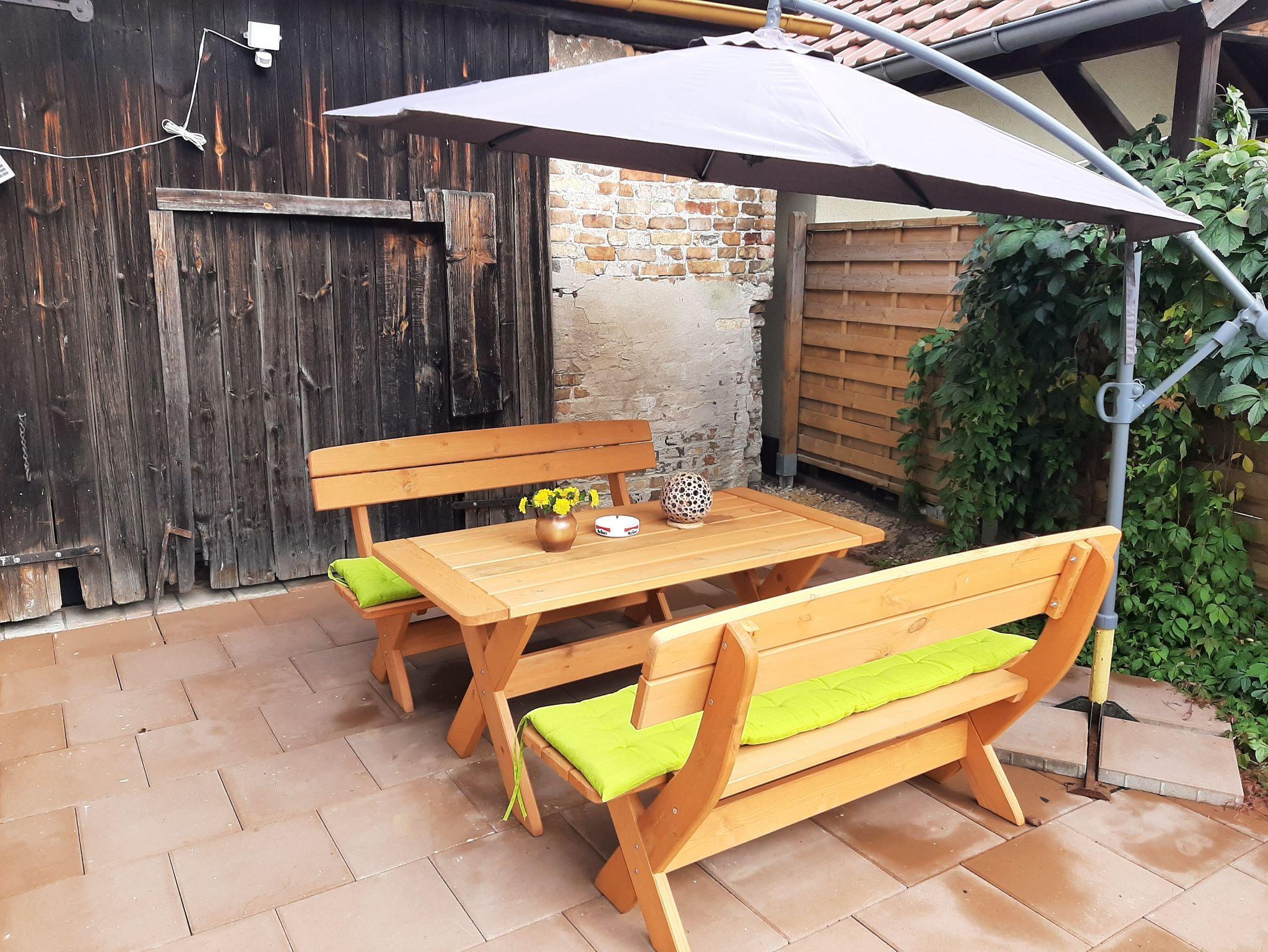 Direkt von der Ferienwohnung aus können Gäste den überdachten Außenbereich nutzen, um einen erlebnisreichen Urlaubstag bei einem schönen Essen und einem Gläschen Wein ausklingen zu lassen.