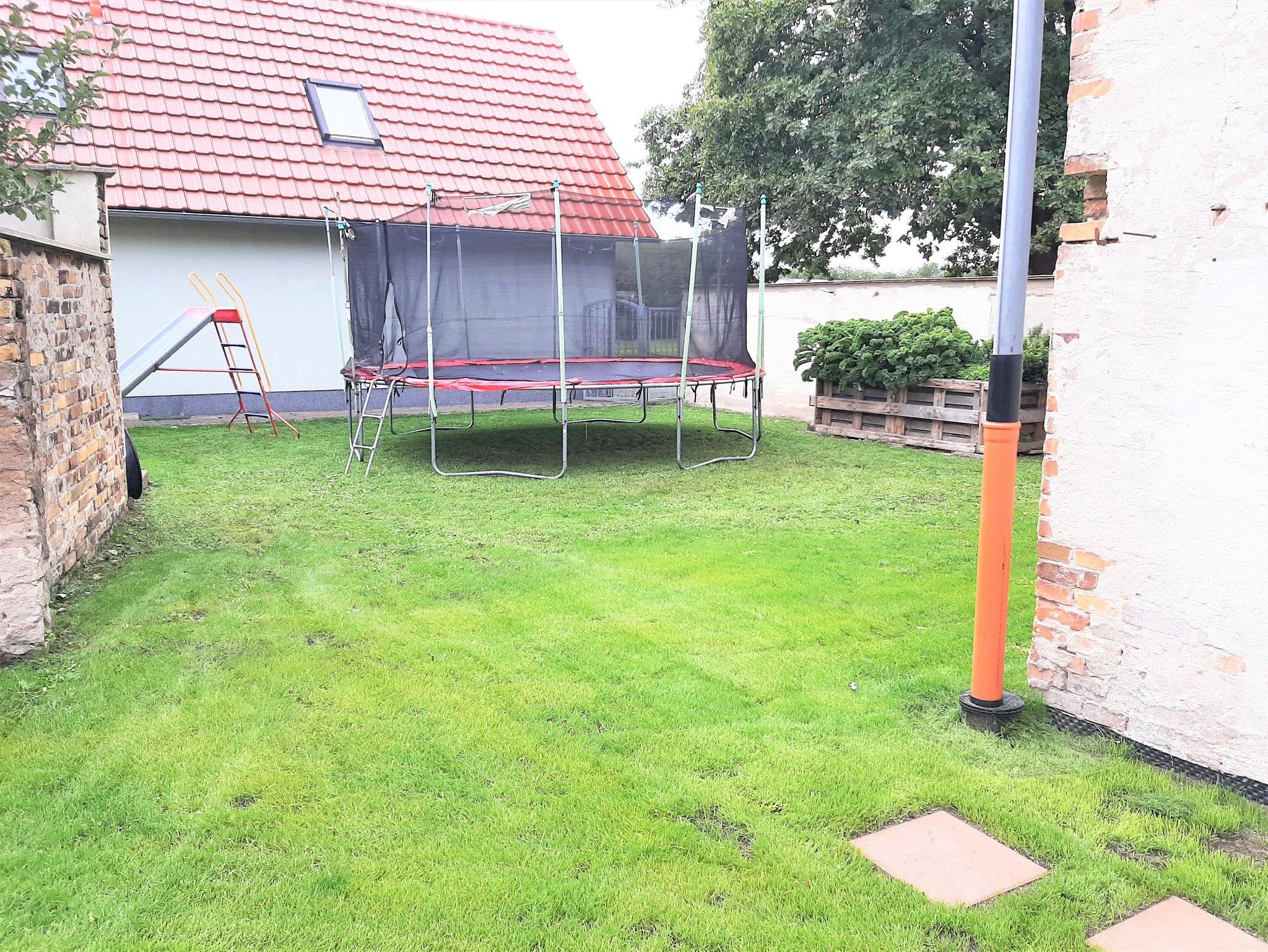 - Spielbereich im Garten mit Trampolin und Rutsche