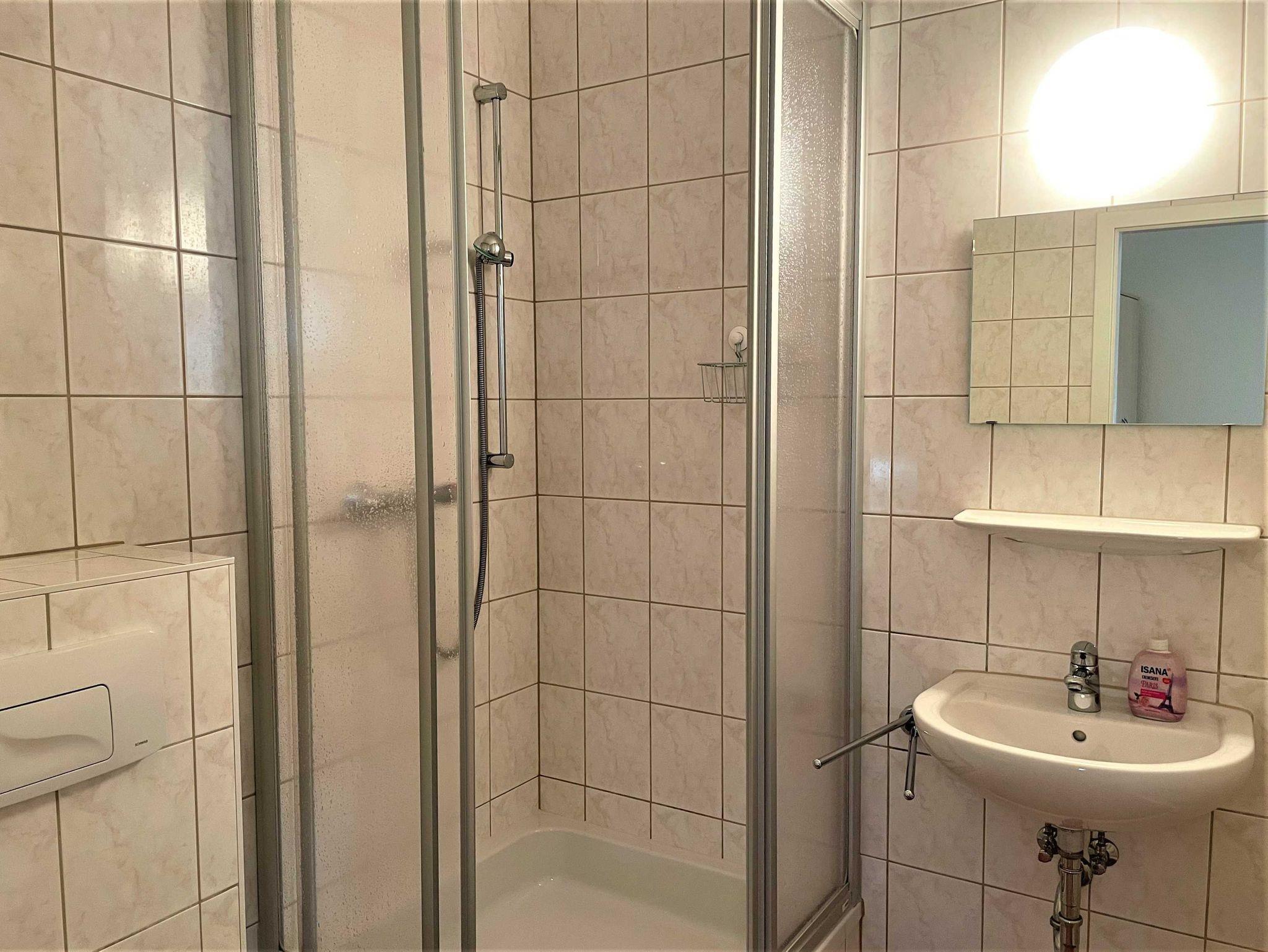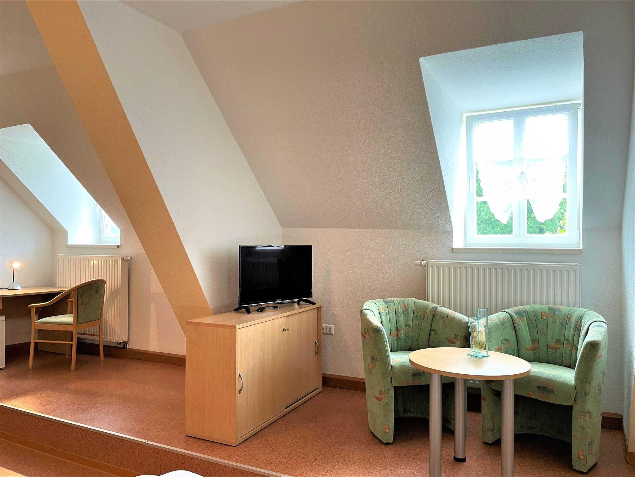 Das Ferienzimmer ist für bis zu 4 Personen geeignet. Es ist mit einem Doppelbett und einem Einzelbett mit integriertem Rollbett (für 1 Aufbettung) ausgestattet. Weiterhin gibt es eine Sitzecke, ausgerüstet mit einem Tischchen und 2 Sessel. Für Unterhaltung am Abend sorgt ein TV-Flachbildschirm. Zur Ausstattung gehört weiterhin ein Schreibtisch und ein kleiner Kühlschrank. Ein Bad mit Dusche und WC befindet sich im Zimmer.