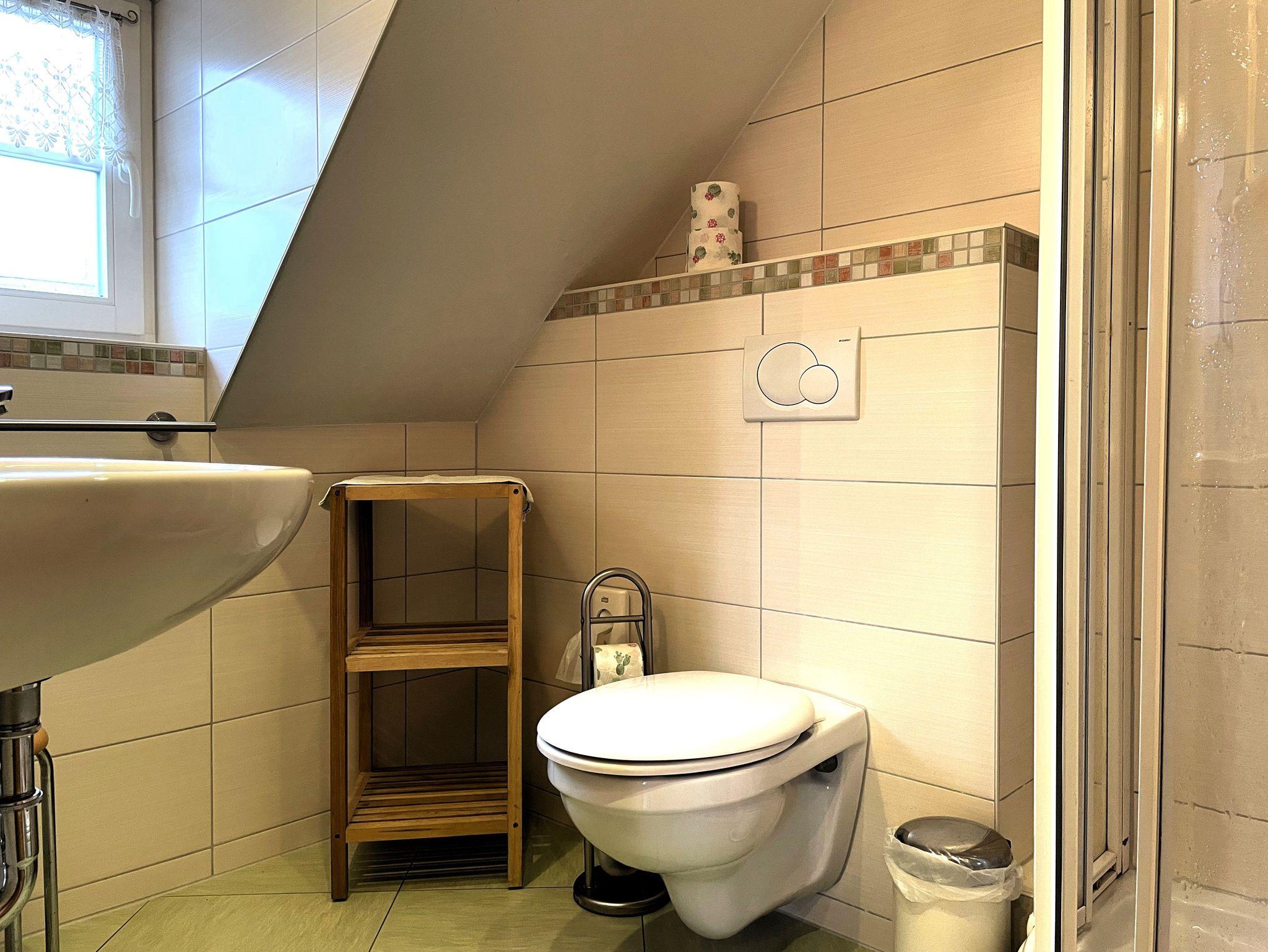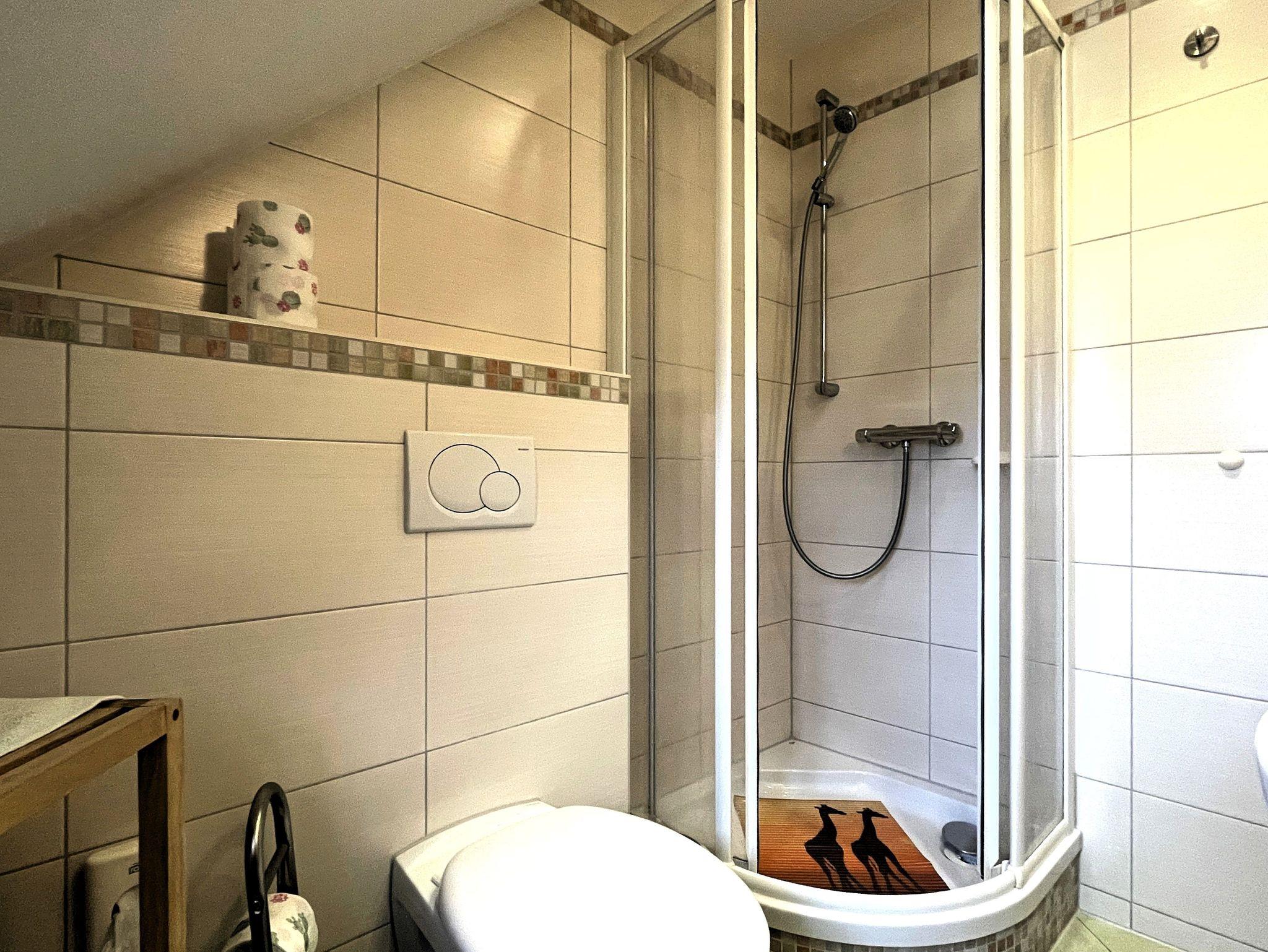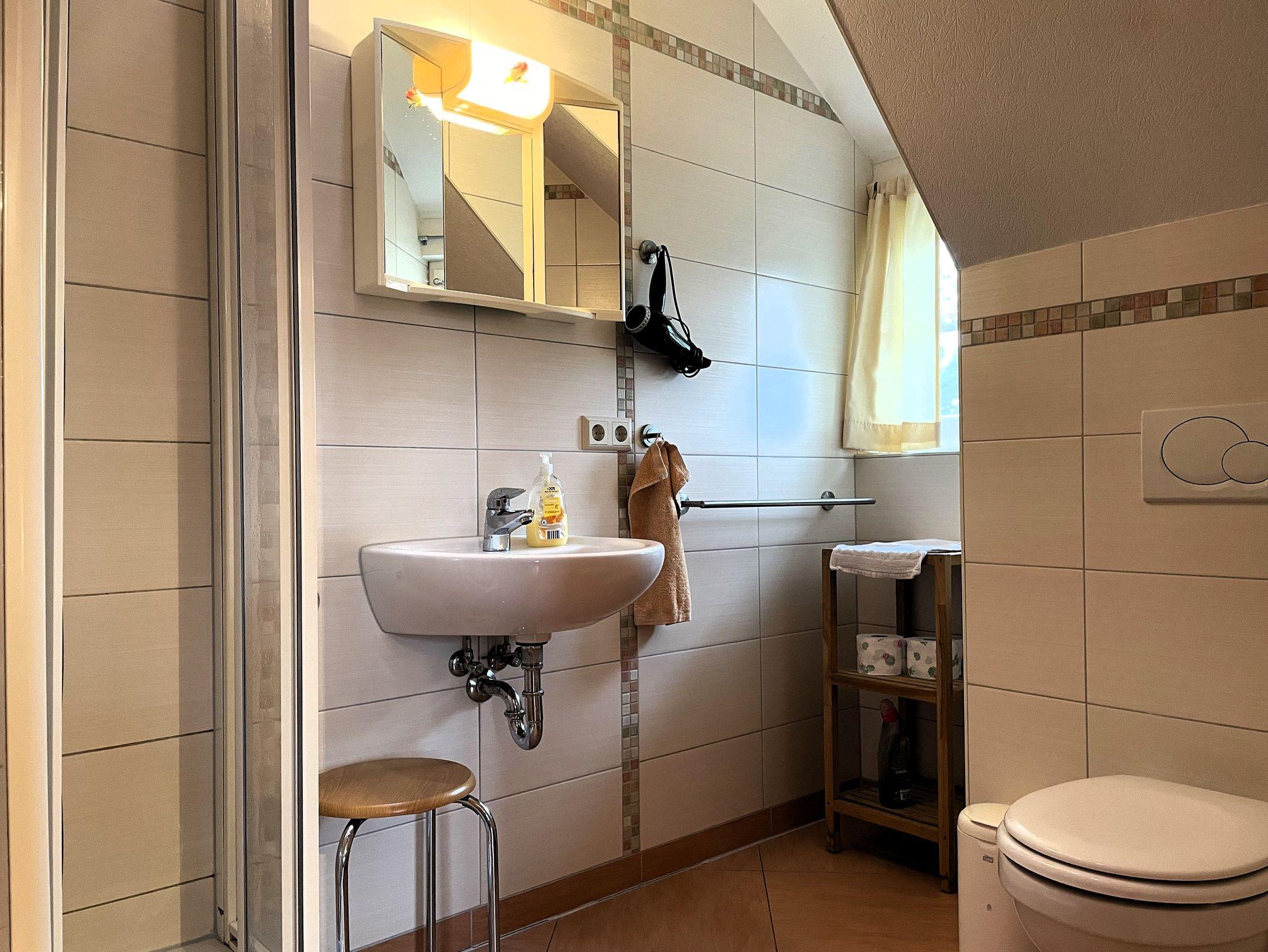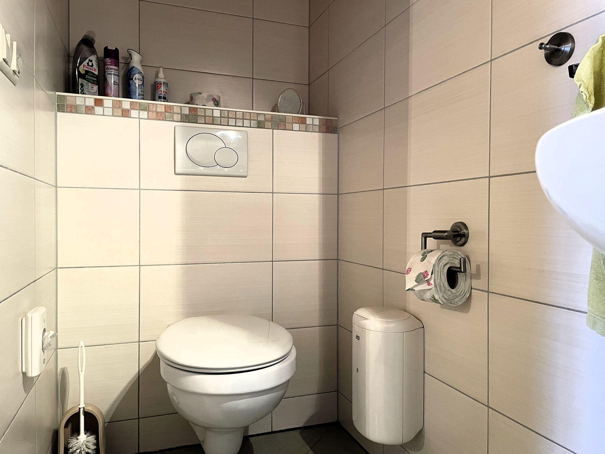 Die Wohnung erstreckt sich über zwei Etagen. Im Erdgeschoss befindet sich ein gemütliches Wohnzimmer, in dem Sie sich entspannen oder fernsehen können. Hier befindet sich auch eine Gästetoilette.