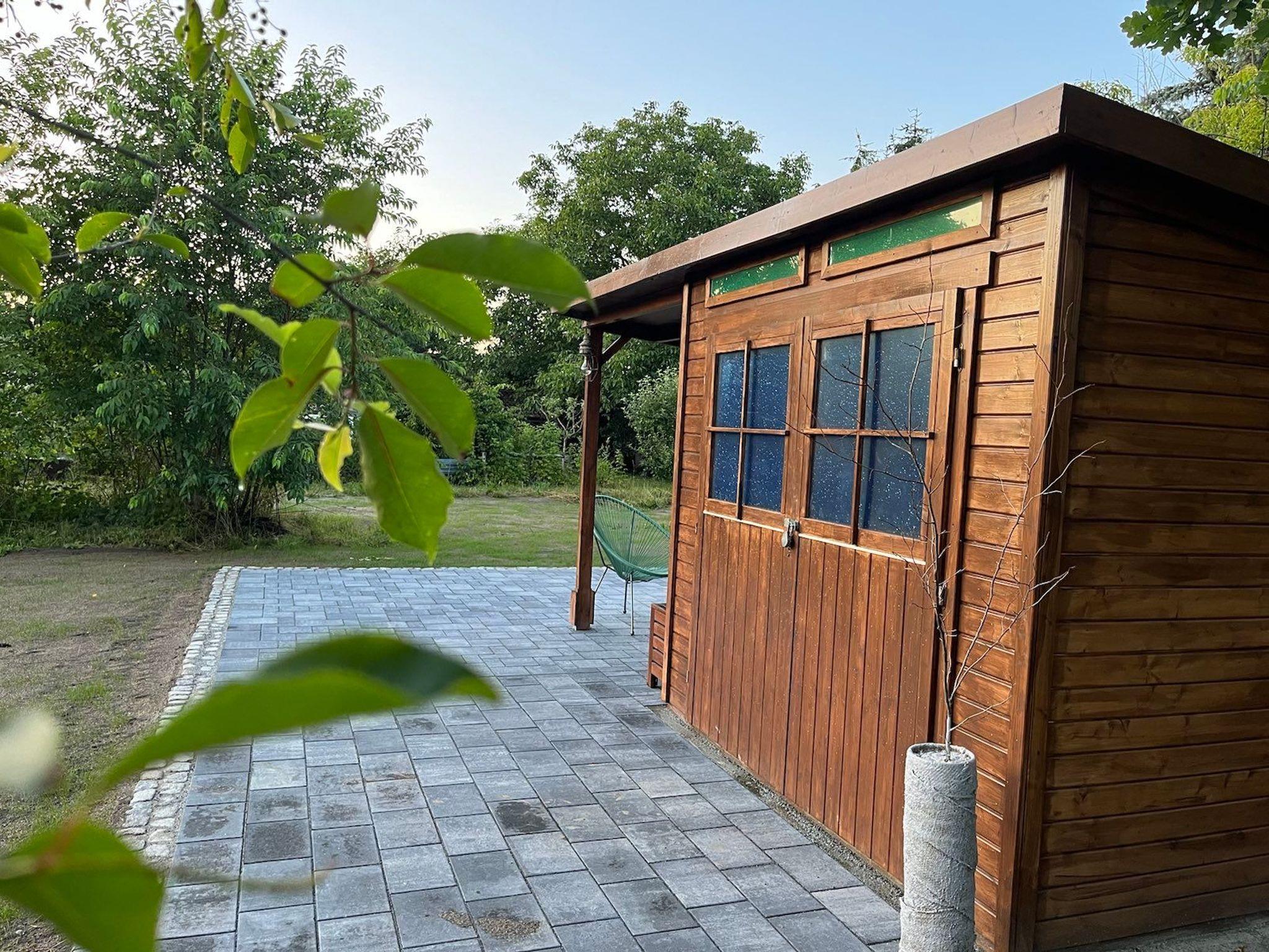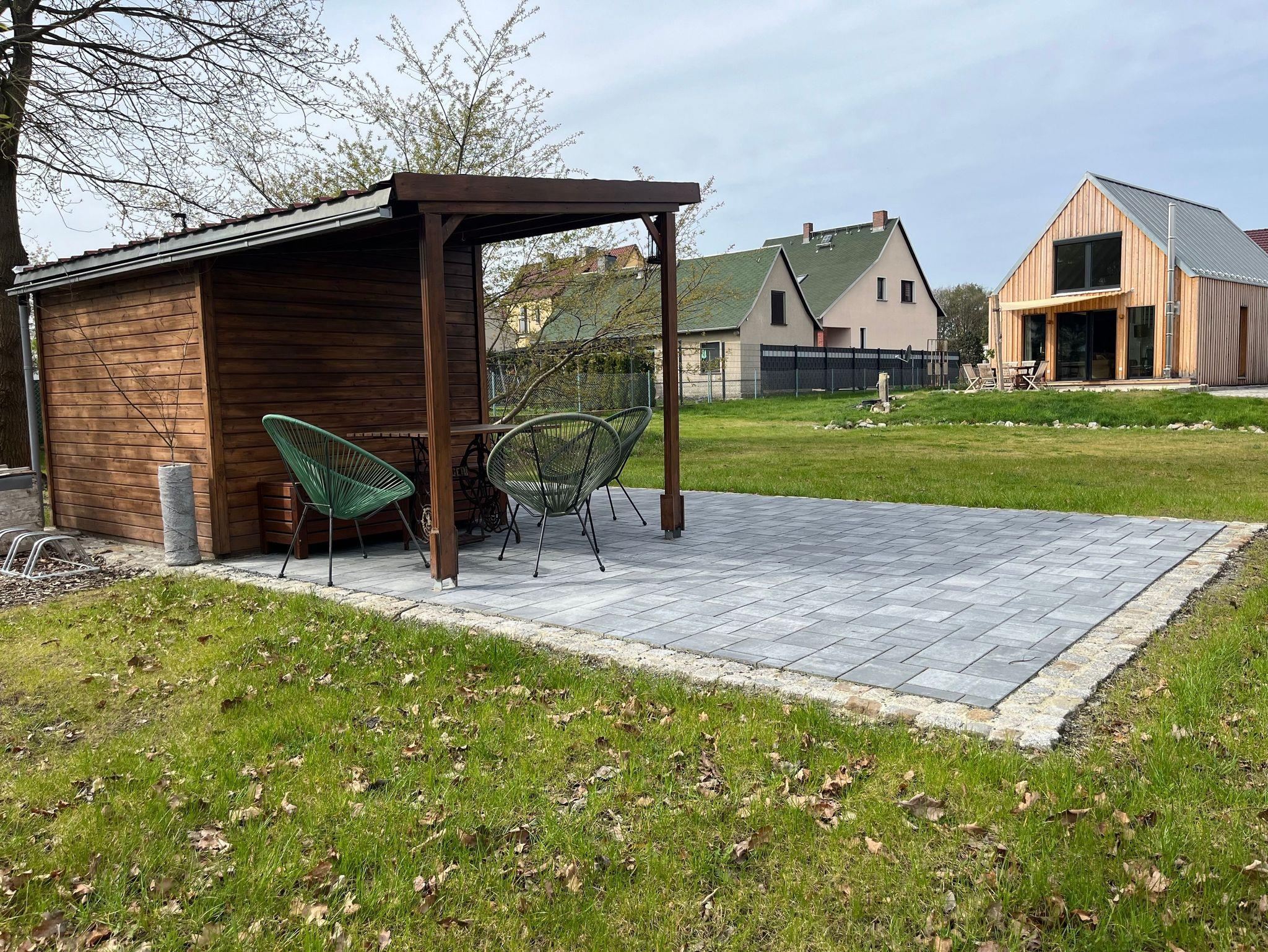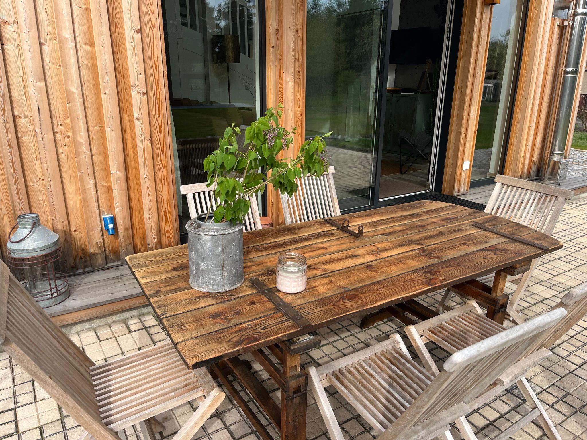 Die Außenanlage hat zwei große Terrassen. Eine direkt am Haus, die Andere am Gartenhaus in unserem „kleinen Wald“ direkt hinter dem Haus.
