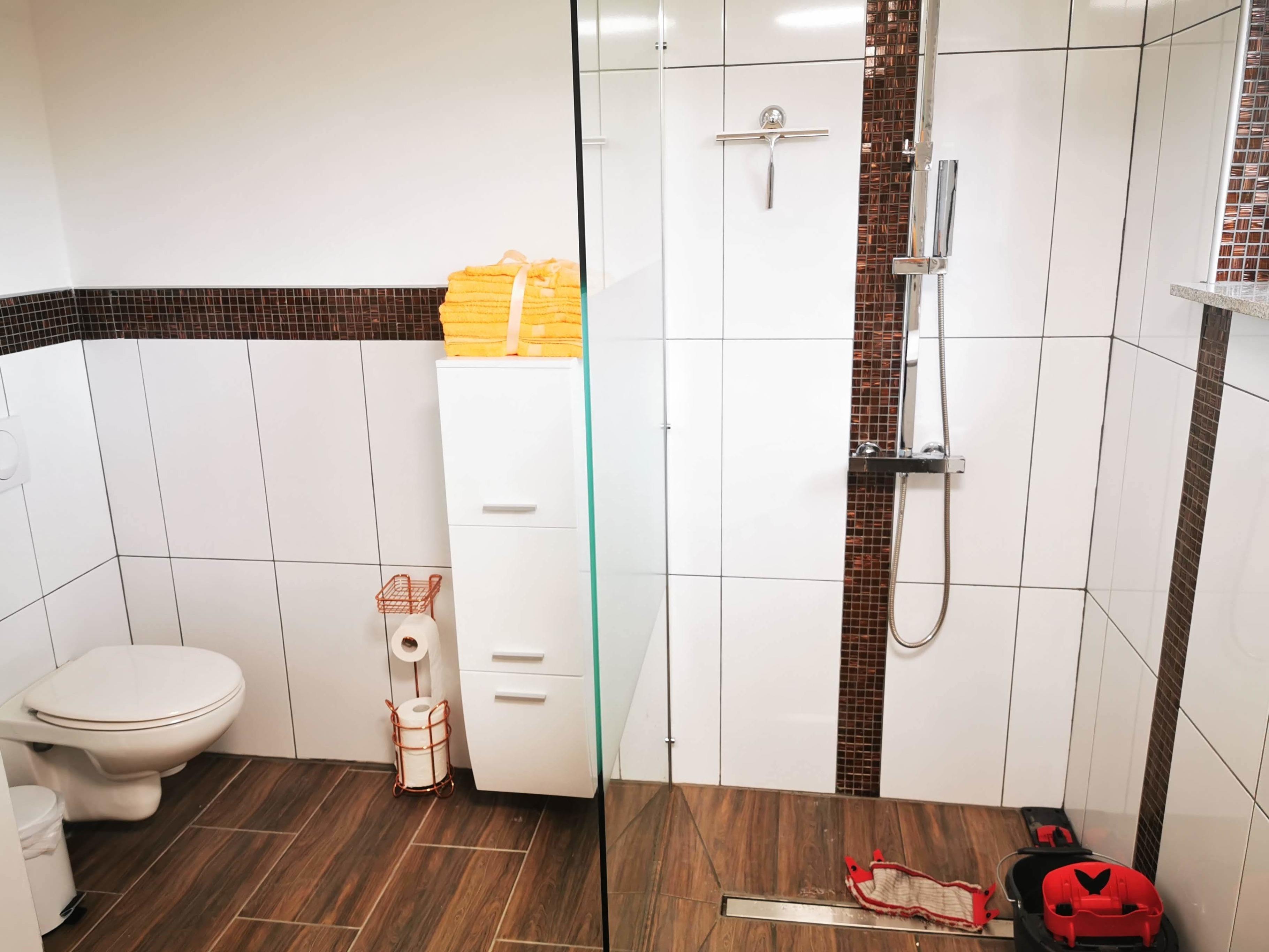 Das Erdgeschoss vereint Küche, Esszimmer und Wohnzimmer in einem großen, gut beleuchteten Raum, der unsere Gäste die häuslichen Aktivitäten gemeinsam genießen lässt, da die Wohnfläche auf einer Ebene verteilt ist. Beide Schlafzimmer verfügen über ein eigenes Bad, jeweils mit einer großen, offenen Regendusche ausgestattet. Somit ist dafür gesorgt, dass die Gäste sich in den frühen Morgenstunden beim Gang ins Badezimmer nicht gegenseitig stören oder behindern.
