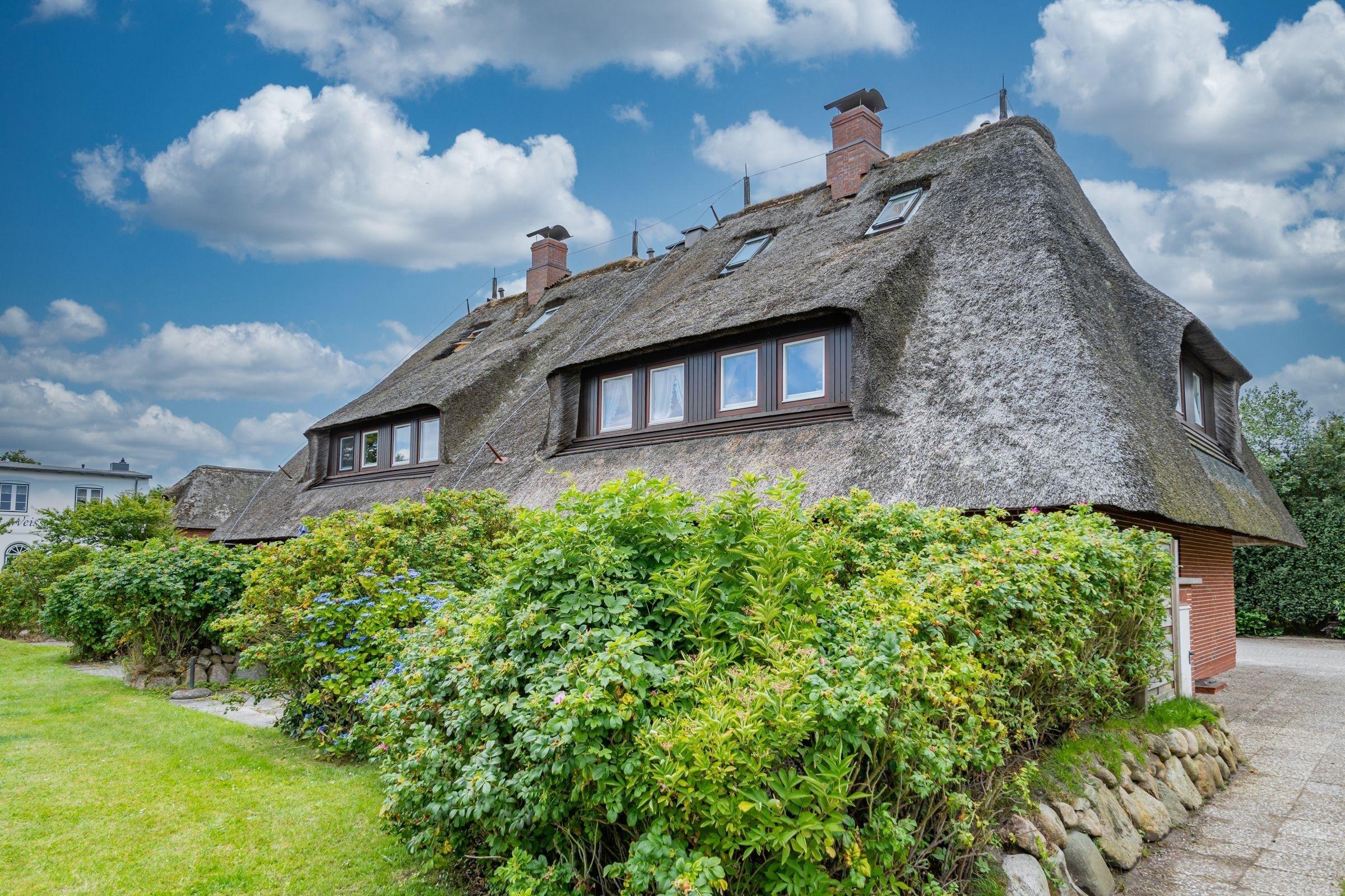 Das Appartement "Wattblick" befindet sich in der sehr gepflegten Anlage "Weisses Kliff" in Braderup. Alle 4 Häuser der Anlage sind reetgedeckt. Zur Anlage gehört ein Schwimmbad, welches von Pfingsten bis Ende September beheizt wird. Zum Weststrand der Insel sind es etwa 2-3 km, zum Watt nur wenige Minuten. Die Anlage liegt direkt am Naturschutzgebiet Braderuper Heide, die zum Durchwandern einlädt. Kampen ist nach etwa 2-3 km Spaziergang durch die Heide oder direkt am Watt erreicht und damit auch die "Kupferkanne", die mit Kuchen, Kaffe und Bier die Pause genießen läßt. Der Golfplatz ist eben um die Ecke. Golfen, Wandern, Laufen, Reiten, Radfahren - alles ist möglich.