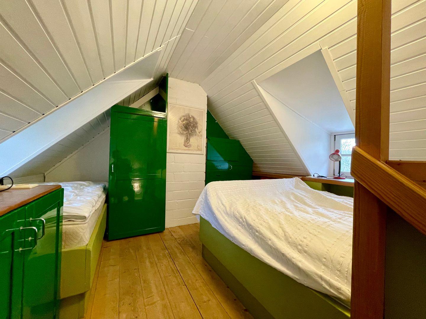 Das obere Schlafzimmer, über dem Kaminzimmer, hat ein Doppelbett (180x200cm), welches mit neuen Matratzen und Bettdecken ausgestattet ist. Schrankraum ist reichlich vorhanden. Eine Treppe und eine Tür trennen das Zimmer vom Wohn-Essbereich. Der zweite Schlafraum über der Küche ist mit einem Doppelbett (140x200cm) und einem weiteren, alkovenartigen Bett/Koje (80x200cm) ausgestattet, sowie mit Schränken und Schubfächern. Dieser Raum hat keine Tür und wird ebenfalls über eine Treppe zum Wohn-Essbereich betreten.
