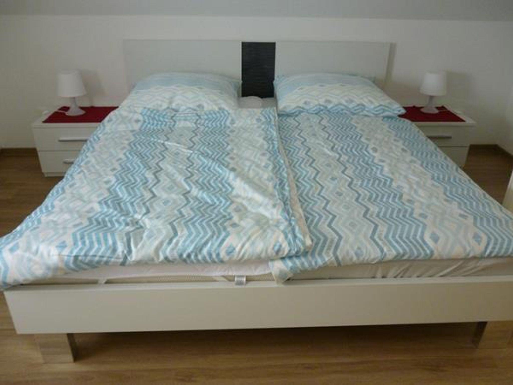 Es stehen zwei Schlafzimmer mit je einem Doppelbett (200 x 200 cm, getrennte Matratzen) und ein Wohn- und Essbereich mit offener Küche zur Verfügung. Die Küchenzeile ist ausgestattet mit Cerankochfeld, Backofen, Kühlschrank mit Gefrierteil, Mikrowelle und Spülmaschine. Es gibt ein Bad mit Dusche, Waschmaschine und ein separates Gäste-WC. Ein kleiner Balkon ist vorhanden.
