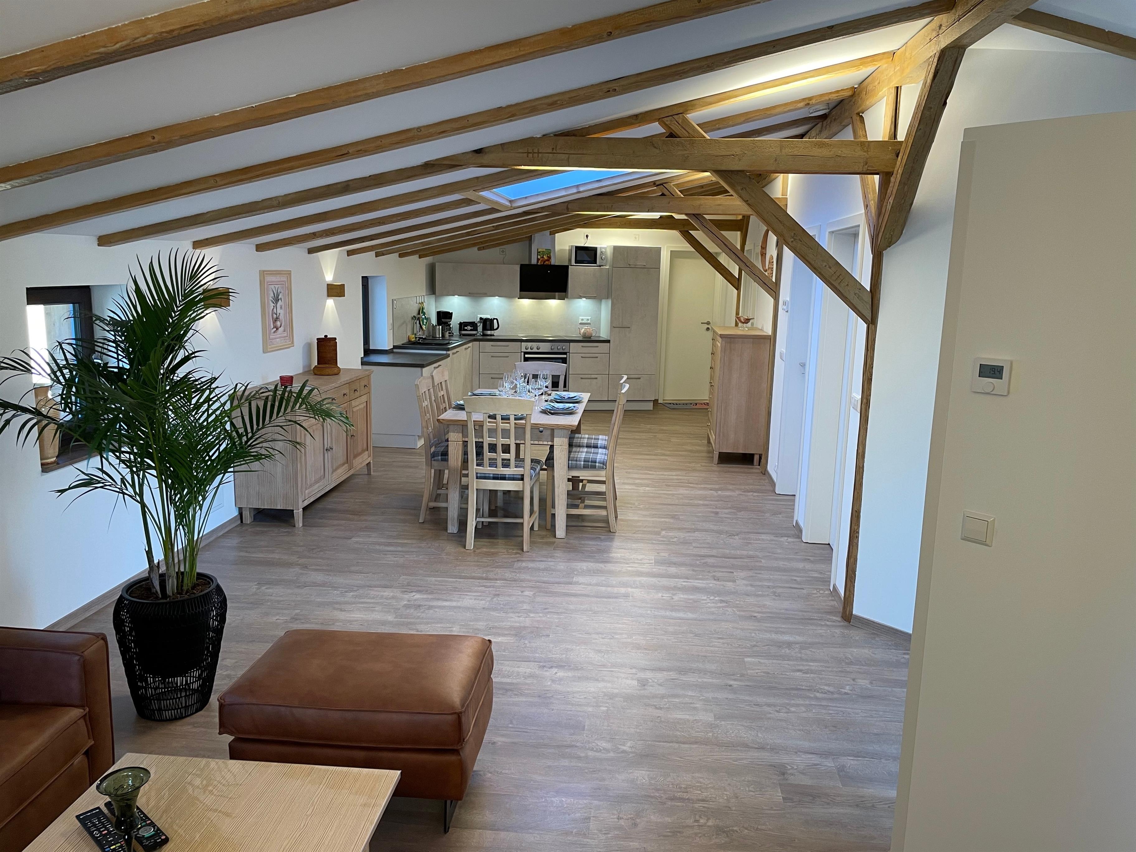 Fühlen Sie sich Zuhause in unserem gemütlichen Apartment im ehemaligen Kohlehandel am stillgelegten Bahnhof unserer Kleinstadt, geeignet für bis zu 5 Personen. Eine offene moderne 3 Zimmer- Wohnung mit großer Wohnküche, zwei Schlafzimmern mit Terasse steht Ihnen zur Verfügung. Das gesamte Gebäude wurde 2021 energetisch saniert und mit modernster Heiz- und Kühltechnik ausgestattet. Im Sommer kann der große Lichtkamin geöffnet werden oder bei Bedarf über die Decke passiv gekühlt werden. Durch die Flächenheizung ist die Wohnung auch für Allergiker gut geeignet.