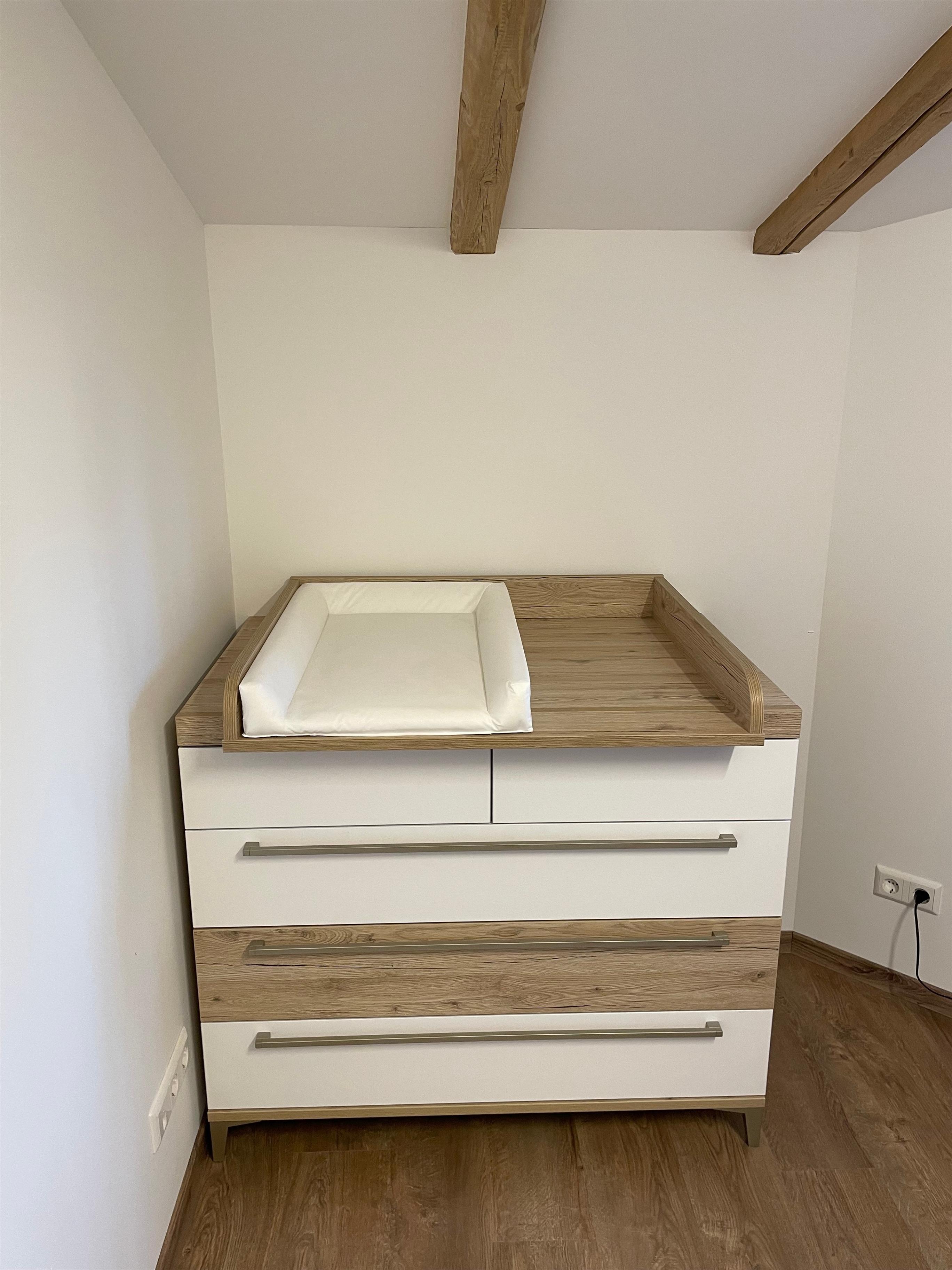 Ein Hauk Baby Reisebett inkl. Matratze, Kopfkissen und Zudecke, eine Wickelkomode und ein Babystühlchen für die kleinsten sind vorhanden.