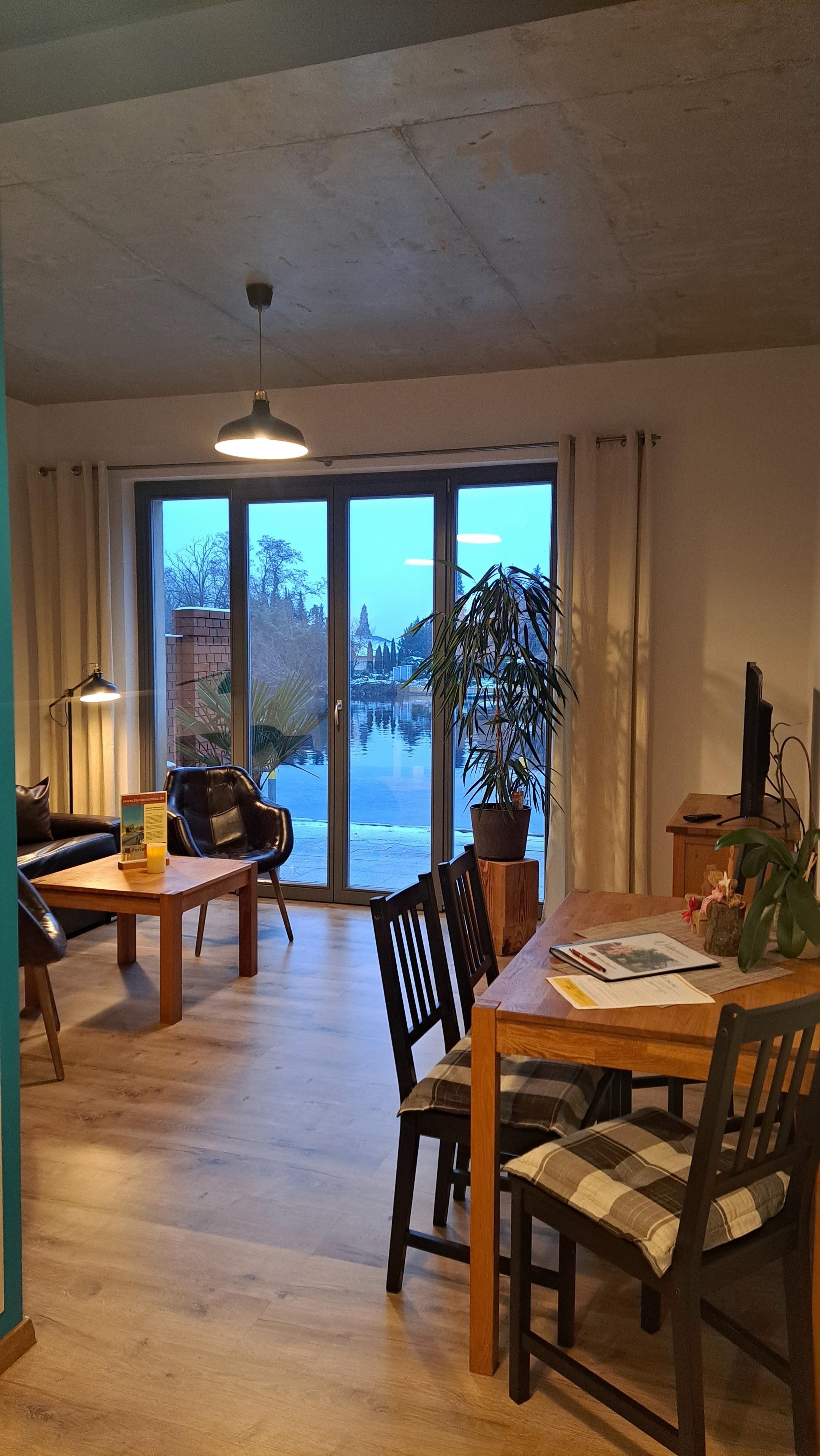 Der Wohnbereich ist mit einer Schlafcouch mit integrierter Matratze (Express-Bett), einem Eßbereich sowie einem Garderobenbereich und Kabel-TV ausgestattet. Von hier gelangt man auf die direkt am Wasser gelegene Terrasse.