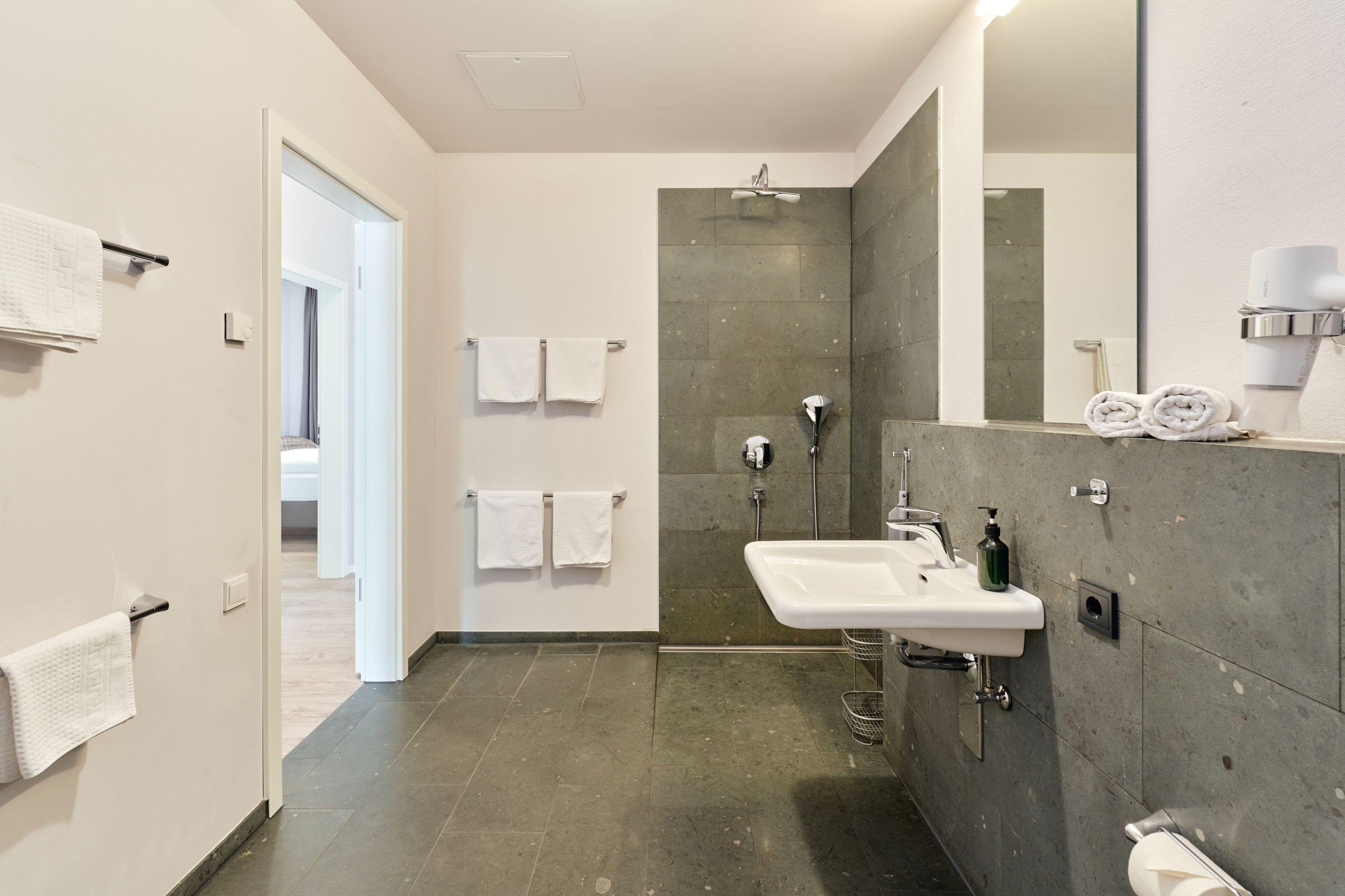 Die bodengleiche Dusche verfügt neben der Schlauchbrause auch über eine „Regenkopfdusche“. Das Waschbecken ist mit einem gut ausgeleuchteten, großformatigen Spiegel versehen. Das es für Rollstuhlfahrer unterfahrbar ist, ist für uns selbstverständlich. Zur Ausstattung des Bades gehört auch ein Fön. Hand- und Duschtücher liegen für Sie bereit.